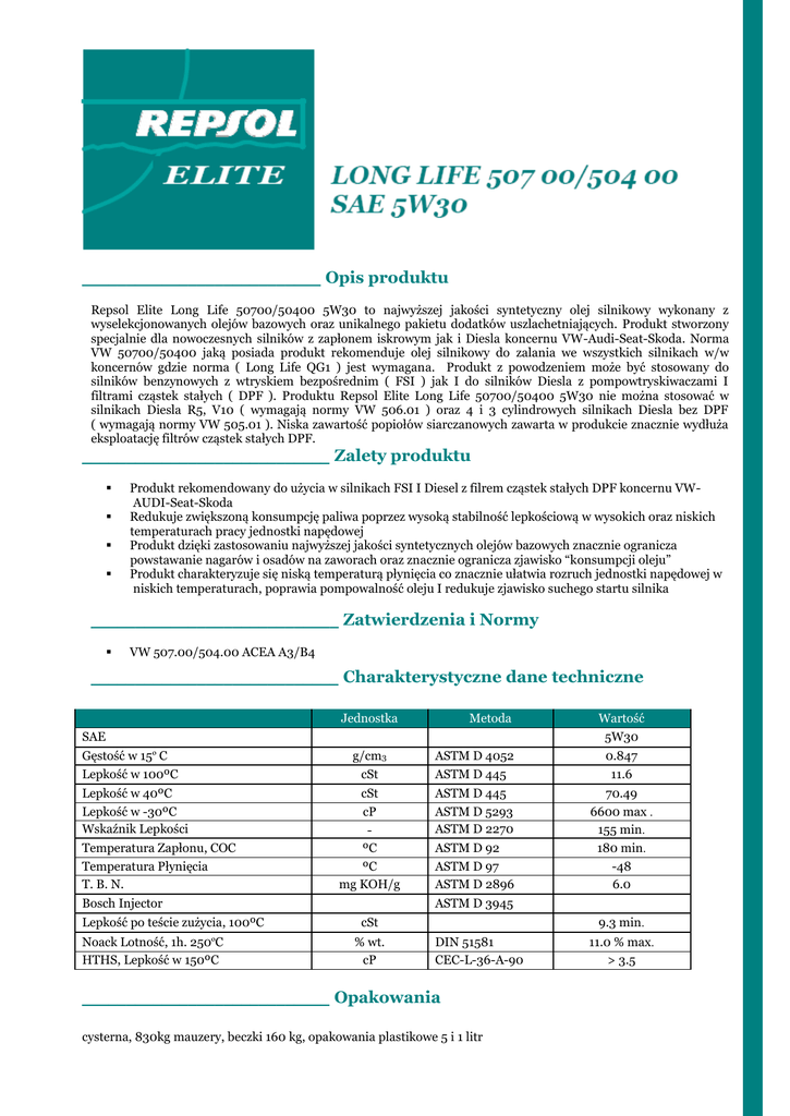 ___________________________ Opis produktu Repsol Elite Long Life 50700/50400 5W30 to najwyższej jakości syntetyczny olej silnikowy wykonany z wyselekcjonowanych olejów bazowych oraz unikalnego pakietu dodatków uszlachetniających. Produkt stworzony specjalnie dla nowoczesnych silników z zapłonem iskrowym jak i Diesla koncernu VW-Audi-Seat-Skoda. Norma VW 50700/50400 jaką posiada produkt rekomenduje olej silnikowy do zalania we wszystkich silnikach w/w koncernów gdzie norma ( Long Life QG1 ) jest wymagana. Produkt z powodzeniem może być stosowany do silników benzynowych z wtryskiem bezpośrednim ( FSI ) jak I do silników Diesla z pompowtryskiwaczami I filtrami cząstek stałych ( DPF ). Produktu Repsol Elite Long Life 50700/50400 5W30 nie można stosować w silnikach Diesla R5, V10 ( wymagają normy VW 506.01 ) oraz 4 i 3 cylindrowych silnikach Diesla bez DPF ( wymagają normy VW 505.01 ). Niska zawartość popiołów siarczanowych zawarta w produkcie znacznie wydłuża eksploatację filtrów cząstek stałych DPF. ____________________________ Zalety produktu Produkt rekomendowany do użycia w silnikach FSI I Diesel z filrem cząstek stałych DPF koncernu VWAUDI-Seat-Skoda Redukuje zwiększoną konsumpcję paliwa poprzez wysoką stabilność lepkościową w wysokich oraz niskich temperaturach pracy jednostki napędowej Produkt dzięki zastosowaniu najwyższej jakości syntetycznych olejów bazowych znacznie ogranicza powstawanie nagarów i osadów na zaworach oraz znacznie ogranicza zjawisko “konsumpcji oleju” Produkt charakteryzuje się niską temperaturą płynięcia co znacznie ułatwia rozruch jednostki napędowej w niskich temperaturach, poprawia pompowalność oleju I redukuje zjawisko suchego startu silnika ____________________________ Zatwierdzenia i Normy VW 507.00/504.00 ACEA A3/B4 ____________________________ Charakterystyczne dane techniczne Jednostka Metoda SAE Gęstość w 15º C Lepkość w 100ºC Lepkość w 40ºC Lepkość w -30ºC Wskaźnik Lepkości Temperatura Zapłonu, COC Temperatura Płynięcia T. B. N. 5W30 g/cm3 cSt ASTM D 4052 ASTM D 445 0.847 11.6 cSt cP ºC ºC mg KOH/g ASTM D 445 ASTM D 5293 ASTM D 2270 ASTM D 92 ASTM D 97 ASTM D 2896 70.49 6600 max . 155 min. 180 min. -48 6.0 Bosch Injector Lepkość po teście zużycia, 100ºC Noack Lotność, 1h. 250ºC HTHS, Lepkość w 150ºC Wartość ASTM D 3945 cSt % wt. cP 9.3 min. DIN 51581 CEC-L-36-A-90 ____________________________ Opakowania cysterna, 830kg mauzery, beczki 160 kg, opakowania plastikowe 5 i 1 litr 11.0 % max. > 3.5