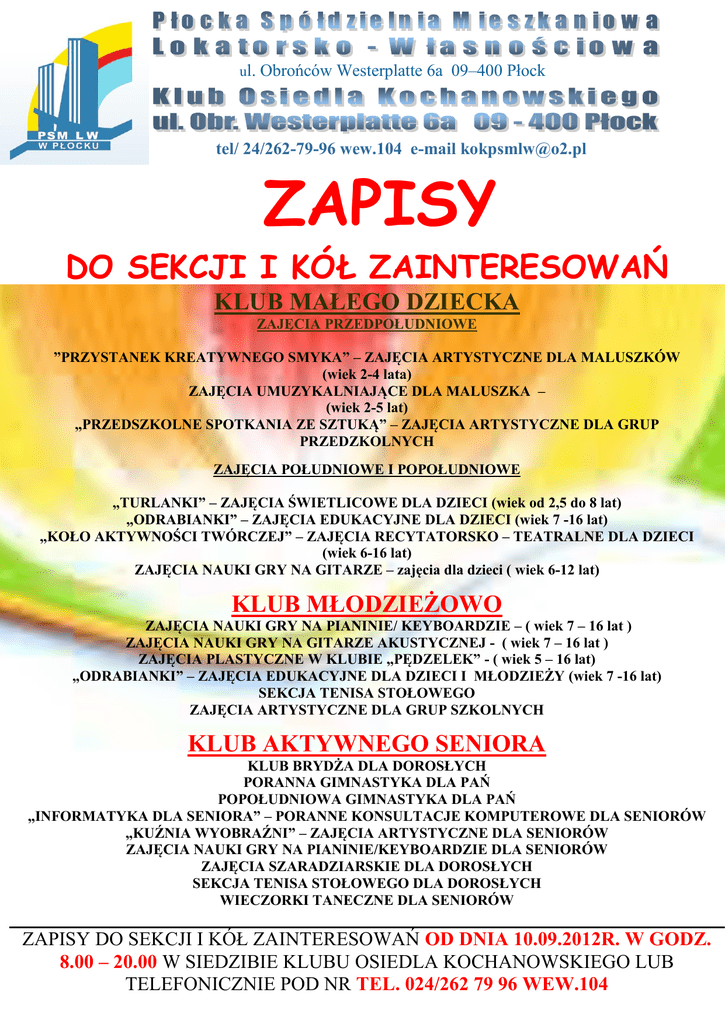 ul. Obrońców Westerplatte 6a 09–400 Płock tel/ 24/262-79-96 wew.104 e-mail [email protected] ZAPISY DO SEKCJI I KÓŁ ZAINTERESOWAŃ KLUB MAŁEGO DZIECKA ZAJĘCIA PRZEDPOŁUDNIOWE ”PRZYSTANEK KREATYWNEGO SMYKA” – ZAJĘCIA ARTYSTYCZNE DLA MALUSZKÓW (wiek 2-4 lata) ZAJĘCIA UMUZYKALNIAJĄCE DLA MALUSZKA – (wiek 2-5 lat) „PRZEDSZKOLNE SPOTKANIA ZE SZTUKĄ” – ZAJĘCIA ARTYSTYCZNE DLA GRUP PRZEDZKOLNYCH ZAJĘCIA POŁUDNIOWE I POPOŁUDNIOWE „TURLANKI” – ZAJĘCIA ŚWIETLICOWE DLA DZIECI (wiek od 2,5 do 8 lat) „ODRABIANKI” – ZAJĘCIA EDUKACYJNE DLA DZIECI (wiek 7 -16 lat) „KOŁO AKTYWNOŚCI TWÓRCZEJ” – ZAJĘCIA RECYTATORSKO – TEATRALNE DLA DZIECI (wiek 6-16 lat) ZAJĘCIA NAUKI GRY NA GITARZE – zajęcia dla dzieci ( wiek 6-12 lat) KLUB MŁODZIEŻOWO ZAJĘCIA NAUKI GRY NA PIANINIE/ KEYBOARDZIE – ( wiek 7 – 16 lat ) ZAJĘCIA NAUKI GRY NA GITARZE AKUSTYCZNEJ - ( wiek 7 – 16 lat ) ZAJĘCIA PLASTYCZNE W KLUBIE „PĘDZELEK” - ( wiek 5 – 16 lat) „ODRABIANKI” – ZAJĘCIA EDUKACYJNE DLA DZIECI I MŁODZIEŻY (wiek 7 -16 lat) SEKCJA TENISA STOŁOWEGO ZAJĘCIA ARTYSTYCZNE DLA GRUP SZKOLNYCH KLUB AKTYWNEGO SENIORA KLUB BRYDŻA DLA DOROSŁYCH PORANNA GIMNASTYKA DLA PAŃ POPOŁUDNIOWA GIMNASTYKA DLA PAŃ „INFORMATYKA DLA SENIORA” – PORANNE KONSULTACJE KOMPUTEROWE DLA SENIORÓW „KUŹNIA WYOBRAŹNI” – ZAJĘCIA ARTYSTYCZNE DLA SENIORÓW ZAJĘCIA NAUKI GRY NA PIANINIE/KEYBOARDZIE DLA SENIORÓW ZAJĘCIA SZARADZIARSKIE DLA DOROSŁYCH SEKCJA TENISA STOŁOWEGO DLA DOROSŁYCH WIECZORKI TANECZNE DLA SENIORÓW ZAPISY DO SEKCJI I KÓŁ ZAINTERESOWAŃ OD DNIA 10.09.2012R. W GODZ. 8.00 – 20.00 W SIEDZIBIE KLUBU OSIEDLA KOCHANOWSKIEGO LUB TELEFONICZNIE POD NR TEL. 024/262 79 96 WEW.104