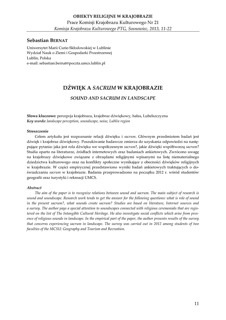 OBIEKTY RELIGIJNE W KRAJOBRAZIE Prace Komisji Krajobrazu Kulturowego Nr 21 Komisja Krajobrazu Kulturowego PTG, Sosnowiec, 2013, 11-22 Sebastian BERNAT Uniwersytet Marii Curie-Skłodowskiej w Lublinie Wydział Nauk o Ziemi i Gospodarki Przestrzennej Lublin, Polska e-mail: [email protected] DŹWIĘK A SACRUM W KRAJOBRAZIE SOUND AND SACRUM IN LANDSCAPE Słowa kluczowe: percepcja krajobrazu, krajobraz dźwiękowy, hałas, Lubelszczyzna Key words: landscape perception, soundscape, noise, Lublin region Streszczenie Celem artykułu jest rozpoznanie relacji dźwięku i sacrum. Głównym przedmiotem badań jest dźwięk i krajobraz dźwiękowy. Poszukiwanie badawcze zmierza do uzyskania odpowiedzi na następujące pytania: jaka jest rola dźwięku we współczesnym sacrum?, jakie dźwięki współtworzą sacrum? Studia oparto na literaturze, źródłach internetowych oraz badaniach ankietowych. Zwrócono uwagę na krajobrazy dźwiękowe związane z obrzędami religijnymi wpisanymi na listę niematerialnego dziedzictwa kulturowego oraz na konflikty społeczne wynikające z obecności dźwięków religijnych w krajobrazie. W części empirycznej przedstawiono wyniki badań ankietowych traktujących o doświadczaniu sacrum w krajobrazie. Badania przeprowadzono na początku 2012 r. wśród studentów geografii oraz turystyki i rekreacji UMCS. Abstract The aim of the paper is to recognize relations between sound and sacrum. The main subject of research is sound and soundscape. Research work tends to get the answer for the following questions: what is role of sound in the present sacrum?, what sounds create sacrum? Studies are based on literature, Internet sources and a survey. The author pays a special attention to soundscapes connected with religious ceremonials that are registered on the list of The Intangible Cultural Heritage. He also investigate social conflicts which arise from presence of religious sounds in landscape. In the empirical part of the paper, the author presents results of the survey that concerns experiencing sacrum in landscape. The survey was carried out in 2012 among students of two faculties of the MCSU: Geography and Tourism and Recreation. 11 „…komu bije dzwon: bije on Tobie” J.Donne WPROWADZENIE Sacrum to sfera świętości, wokół której koncentrują się praktyki religijne. Sacrum ma przede wszystkim wymiar niematerialny (duchowy), ale wyraża się w wytworach materialnych – realnie istniejących obiektach i miejscach kultu (m.in. świątynia, źródło, góra). Sacrum jest obecne w krajobrazie, zdefiniowanym w Europejskiej Konwencji Krajobrazowej (2000) jako obszar postrzegany przez ludzi, będący wynikiem interakcji czynników przyrodniczych i ludzkich. Dźwięk jest istotnym elementem krajobrazu, funkcjonuje w powiązaniu z jego pozostałymi komponentami, uzupełnienia obraz, wnosząc nową treść (Bernat, 1999; Bernat, 2008). Dźwięk wpływa na jakość krajobrazu, kształtuje jego charakter. Dźwięk jako zaburzenie falowe jest bodźcem odbieranym przez receptory zmysłów w procesie percepcji. Poprzez nakładanie się na siebie i wzajemne przenikanie wielu zróżnicowanych pól dźwiękowych, z których każde ma jakieś pojedyncze źródło, wytwarzany jest krajobraz dźwiękowy, postrzegany jako zdarzenie akustyczne. Krajobraz dźwiękowy jest zróżnicowaną jakościowo warstwą krajobrazu, wyodrębnioną na podstawie zdarzeń dźwiękowych, którym określona społeczność przypisuje pewne znaczenia. Problematyka relacji dźwięku i sacrum była dotychczas przedmiotem nielicznych badań. Wspomnieć należy przede wszystkim o: studiach kulturoznawczych dotyczących postrzegania dźwięków świątyń przez mieszkańców Wrocławia (Losiak, 2011), badaniach geograficznych na temat znaczenia dźwięku i ciszy w przestrzeni sacrum, przeprowadzonych na katolikach, mieszkańcach Łodzi (Klima, 2008) oraz analizach cysterskich krajobrazów ciszy z perspektywy architektury krajobrazu (Milecka, 2008), w których autorka dostrzega potrzebę ochrony akustycznej sfery krajobrazów sakralnych. Zauważyć należy także wzmianki o dźwięku, ciszy i muzyce związanej z sacrum w publikacjach o charakterze monografii (m.in. Devereux, 2010; Jorasz, 2010; Zwoliński, 2004). Zwrócono w nich uwagę także na obecne w krajobrazie zjawiska akustyczne, stanowiące znak obecności duchów lub bóstw (echa, szepty, szum wód, ryk fal). Warto jeszcze wspomnieć o pojawiających się ostatnio interesujących inicjatywach dostrzegających relacje dźwięku i sacrum (m.in. wystawa „Pejzaż dźwiękowy Częstochowy” oraz wydawnictwo „Pocztówki dźwiękowe z Tyńca”). Celem artykułu jest rozpoznanie relacji dźwięku i sacrum. Poszukiwanie badawcze zmierza do uzyskania odpowiedzi na następujące pytania: jaka jest rola dźwięku we współczesnym sacrum?, jakie dźwięki współtworzą sacrum? Studia oparto na literaturze, źródłach internetowych oraz badaniach ankietowych. Zwrócono uwagę na krajobrazy dźwiękowe związane z obrzędami religijnymi wpisanymi na listę niematerialnego dziedzictwa kulturowego oraz na konflikty społeczne wynikające z obecności dźwięków religijnych w krajobrazie. W części empirycznej przedstawiono wyniki badań ankietowych traktujących o doświadczaniu sacrum w krajobrazie. 12 Badania przeprowadzono na początku 2012 r. wśród studentów geografii oraz turystyki i rekreacji UMCS. OBRZĘDY RELIGIJNE JAKO NIEMATERIALNE DZIEDZICTWO KULTUROWE Dziedzictwo kulturowe każdego narodu to nie tylko materialne świadectwa jego przeszłości ale również dziedzictwo duchowe, niematerialne, które tworzy tożsamość narodu i pobudza do materialnego wyrażania. Niematerialne dziedzictwo kulturowe jest wartością każdego narodu i zasługuje na ochronę. Konwencja UNESCO w sprawie ochrony niematerialnego dziedzictwa kulturowego (2003) wskazuje na potrzebę wzmocnienia efektywności środków zapewniających jego przetrwanie, obejmujący