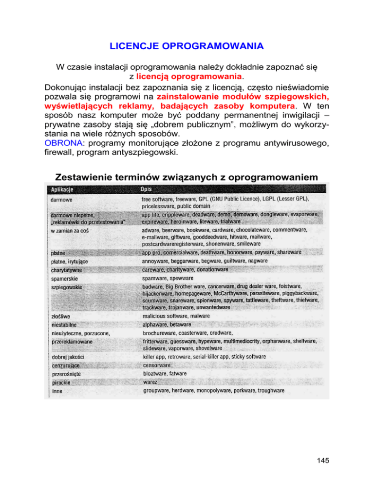 LICENCJE OPROGRAMOWANIA W czasie instalacji oprogramowania należy dokładnie zapoznać się z licencją oprogramowania. Dokonując instalacji bez zapoznania się z licencją, często nieświadomie pozwala się programowi na zainstalowanie modułów szpiegowskich, wyświetlających reklamy, badających zasoby komputera. W ten sposób nasz komputer może być poddany permanentnej inwigilacji – prywatne zasoby stają się „dobrem publicznym”, możliwym do wykorzystania na wiele różnych sposobów. OBRONA: programy monitorujące złożone z programu antywirusowego, firewall, program antyszpiegowski. Zestawienie terminów związanych z oprogramowaniem 145 LEGALNOŚĆ OPROGRAMOWANIA – CO WOLNO UŻYTKOWNIKOWI? Nabywca programu komputerowego staje się jego właścicielem, lecz licencjobiorcą. Legalnie kupiony program można skopiować na płytę CD jedynie jako kopię bezpieczeństwa. Akceptując warunki licencji zawieramy z autorem aplikacji umowę prawną, z której użytkownik musi się wywiązywać. Kiedy kopia programu jest legalna? 22.11.2005 14:55 Rynek produktów komputerowych zaskakuje cenami programów, zwłaszcza specjalistycznych. Wysokie ceny powinny być 100-proc. gwarancją użyteczności i skuteczności ich zastosowania. Dostępne nośniki informacyjne nie gwarantują jednak konsumentom trwałości płyta CD z programem może ulec zniszczeniu bądź po prostu zostać zgubiona. Furtka dla ciebie Archiwum Przepisy prawne regulujące ochronę programów autorskich to przede wszystkim ustawa z dnia 4 lutego 1994 r. o prawie autorskim i prawach pokrewnych. Jednak ze względu na specyfikę programów komputerowych nie stosuje się wobec nich prawa autorskiego o dozwolonym użytku prywatnym. Nabywając program, nie stajemy się automatycznie jego właścicielem, a jedynie wykupujemy po prostu licencję na korzystanie z niego w ściśle określony sposób. Umowa licencyjna może np. przewidywać możliwość zainstalowania go jedynie na jednym stanowisku komputerowym, jednak zawsze istnieje wspomniane ryzyko, że nośnik informacji może ulec uszkodzeniu. Dlatego jak najbardziej przysługuje nam prawo do sporządzenia kopii zapasowej, jako elementu niezbędnego do prawidłowego funkcjonowania programu. Ustawa przyznaje użytkownikowi prawo do sporządzenia kopii zapasowej. ··Art. 75 ust. 2 pkt 1 ustawy o prawie autorskim mówi: "nie wymaga zezwolenia uprawnionego sporządzenie kopii zapasowej, jeżeli jest to niezbędne do korzystania z programu komputerowego". Sformułowanie z ustawy nie jest precyzyjne i interpretując je trzeba mieć na uwadze cel kopii bezpieczeństwa - ma ona gwarantować korzystanie z programu w przypadku zniszczenia oryginalnego nośnika. Sporządzenie kopii można uznać za zbędne, gdy producent programu zapewnia natychmiastowe dostarczenie nowej kopii programu w przypadku jej zniszczenia. Gwarancje producenta jednak nie zawsze są wiarygodne od momentu zgłoszenia zaginięcia lub zniszczenia naszego nośnika informacji do momentu dostarczenia nowej kopii może upłynąć dużo czasu, co może się przedłożyć na zastosuj w pracy i wymierne starty. W najlepszym wypadku kopia zostaje dostarczona wraz z zakupionym oryginalnym egzemplarzem, zdarza się to jednak rzadko. Użytkownik nie może wtedy sporządzić kolejnej kopii - mamy bowiem prawo tylko do jednej. Pamiętać też trzeba, że jeżeli umowa licencyjna nie stanowi inaczej, to nie możemy równocześnie używać programu oryginalnego i kopii. Innym problemem na drodze legalnego kopiowania mogą okazać się zabezpieczenia producenta. Ich celem jest szeroko pojęte zabezpieczenie przed piractwem, jednak jednocześnie faktycznie pozbawiają legalnych użytkowników przywileju stworzenia kopii bezpieczeństwa. Należy wówczas skontaktować się z producentem lub dystrybutorem z zapytaniem czy w razie uszkodzenia nowego nośnika zostanie nam dostarczony nowy. Sporządzenie jednej kopii bezpieczeństwa, przez nas jako użytkowników oryginalnego produktu, jest zatem dopuszczalne. Obejście ewentualnych zabezpieczeń w celu jej wykonania nie będzie uznawane za bezprawne. ((INTERIA.PL)) 146 PROGRAMY SHAREWARE, FREEWARE, PUBLIC DOMAIN SHAREWARE: system dystrybucji oprogramowania oparty na zasadzie honorowej umowy. Klient otrzymuje z Internetu, serwisów, firm pełnowartościowy program (lub pozbawiony kilku opcji) i przez okres darmowego użytkowania może dokładnie się z nim zapoznać. Po tym okresie uczciwy klient powinien: 1. albo zapłacić autorowi niewielką w porównaniu z programami komercyjnymi kwotę (zwykle 10 – 30 USD), 2. albo skasować program z dysku. Baza programów typu shareware liczy dziesiątki tysięcy pełnowartościowych, jak całkowicie bezużytecznych programów. FREEWARE: programy rozprowadzane bez żadnych opłat. Autor programu zachowuje prawa własności i kontroli nad rozprowadzaniem. PUBLIC DOMAIN: programy rozprowadzane bez opłat oraz praw autorskich. Programy te mogą być używane bez ograniczeń. Rzeczpospolita, 25. 05. 2006 r. 147