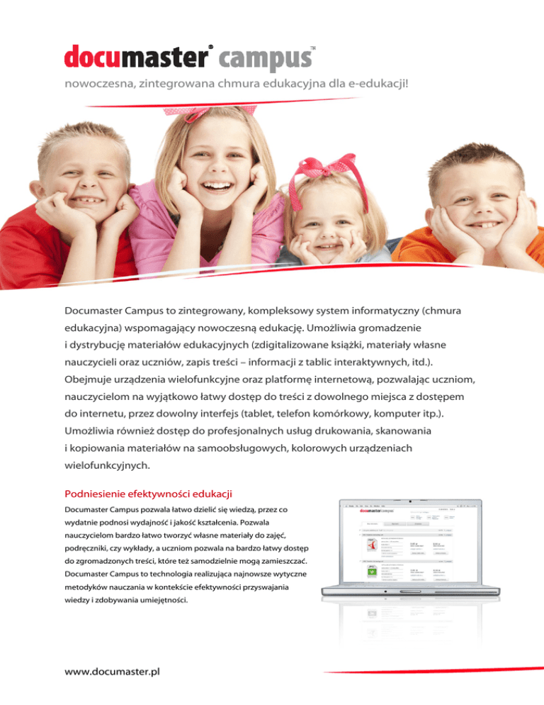 nowoczesna, zintegrowana chmura edukacyjna dla e-edukacji! Documaster Campus to zintegrowany, kompleksowy system informatyczny (chmura edukacyjna) wspomagający nowoczesną edukację. Umożliwia gromadzenie i dystrybucję materiałów edukacyjnych (zdigitalizowane książki, materiały własne nauczycieli oraz uczniów, zapis treści – informacji z tablic interaktywnych, itd.). Obejmuje urządzenia wielofunkcyjne oraz platformę internetową, pozwalając uczniom, nauczycielom na wyjątkowo łatwy dostęp do treści z dowolnego miejsca z dostępem do internetu, przez dowolny interfejs (tablet, telefon komórkowy, komputer itp.). Umożliwia również dostęp do profesjonalnych usług drukowania, skanowania i kopiowania materiałów na samoobsługowych, kolorowych urządzeniach wielofunkcyjnych. Podniesienie efektywności edukacji Documaster Campus pozwala łatwo dzielić się wiedzą, przez co wydatnie podnosi wydajność i jakość kształcenia. Pozwala nauczycielom bardzo łatwo tworzyć własne materiały do zajęć, podręczniki, czy wykłady, a uczniom pozwala na bardzo łatwy dostęp do zgromadzonych treści, które też samodzielnie mogą zamieszczać. Documaster Campus to technologia realizująca najnowsze wytyczne metodyków nauczania w kontekście efektywności przyswajania wiedzy i zdobywania umiejętności. www.documaster.pl Documaster Campus Obniżenie kosztów edukacji System Documaster Campus umożliwia szerokie korzystanie z darmowych e-book’ów, podręczników, skryptów i wykładów. Oferuje tani druk na żądanie materiałów własnych, podręczników, książek i ćwiczeń (24/7/365 )– również z rozliczeniem praw autorskich ich twórców. Umożliwia wydruk tylko aktualnie potrzebnych fragmentów publikacji a drobne płatności (kilka, kilkanaście groszy) mogą być rozłożone systematycznie przez cały rok szkolny w zależności od ilości drukowanych, skanowanych lub kopiowanych prac. Documaster Campus to m.in również • Praca grupowa on-line nauczycieli i uczniów nad wspólnym projektem oraz integracja z popularnymi • Łatwe dostosowanie programu nauczania do usługami do pracy w chmurze. poziomu poszczególnych uczniów lub ich grup w zależności od osiąganych postępów w nauce, zaangażowania i zainteresowań (tzw. kastomizacja). • Zintegrowana platforma e-learningowa umożliwiająca uczniom odtwarzanie przygotowanych lekcji przez nauczycieli bezpośrednio w intuicyjnym • Możliwość stworzenia przez nauczycieli własnych, interfejsie WWW Documaster Campus. indywidualnych materiałów do lekcji, ćwiczeń, prac domowych itp. i przekazanie ich uczniom. • Wyrównanie szans społecznych i zmniejszenie efektu wykluczenia cyfrowego – wszyscy uczniowie • Możliwość zintegrowania szkół z zasobami bibliotecznymi wyższych uczelni a tym samym mają równy dostęp do wiedzy oraz mają możliwość korzystania z najnowszej technologii. korzystanie przez uczniów i nauczycieli z wiedzy najwyższej jakości. • Wyeliminowanie ciężkiego tornistra (obecnie 4-10 kg), codziennie noszonego do szkoły. Informacje zawarte w tej publikacji nie są ofertą handlową. Specyfikacja techniczna oraz wygląd prezentowanych produktów mogą ulec zmianie bez powiadomienia. Euroimpex SA | ul. Mydlana 3b | 51-502 Wrocław tel. 71 7848100 | [email protected] | www.euroimpex.pl www.documaster.pl
