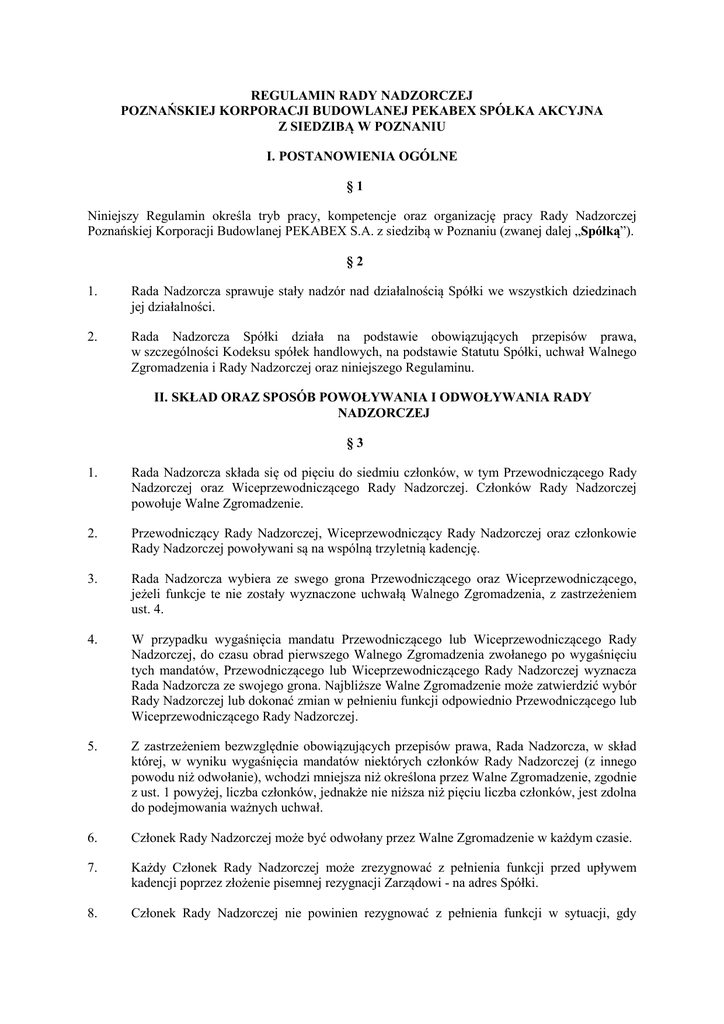 REGULAMIN RADY NADZORCZEJ POZNAŃSKIEJ KORPORACJI BUDOWLANEJ PEKABEX SPÓŁKA AKCYJNA Z SIEDZIBĄ W POZNANIU I. POSTANOWIENIA OGÓLNE §1 Niniejszy Regulamin określa tryb pracy, kompetencje oraz organizację pracy Rady Nadzorczej Poznańskiej Korporacji Budowlanej PEKABEX S.A. z siedzibą w Poznaniu (zwanej dalej „Spółką”). §2 1. Rada Nadzorcza sprawuje stały nadzór nad działalnością Spółki we wszystkich dziedzinach jej działalności. 2. Rada Nadzorcza Spółki działa na podstawie obowiązujących przepisów prawa, w szczególności Kodeksu spółek handlowych, na podstawie Statutu Spółki, uchwał Walnego Zgromadzenia i Rady Nadzorczej oraz niniejszego Regulaminu. II. SKŁAD ORAZ SPOSÓB POWOŁYWANIA I ODWOŁYWANIA RADY NADZORCZEJ §3 1. Rada Nadzorcza składa się od pięciu do siedmiu członków, w tym Przewodniczącego Rady Nadzorczej oraz Wiceprzewodniczącego Rady Nadzorczej. Członków Rady Nadzorczej powołuje Walne Zgromadzenie. 2. Przewodniczący Rady Nadzorczej, Wiceprzewodniczący Rady Nadzorczej oraz członkowie Rady Nadzorczej powoływani są na wspólną trzyletnią kadencję. 3. Rada Nadzorcza wybiera ze swego grona Przewodniczącego oraz Wiceprzewodniczącego, jeżeli funkcje te nie zostały wyznaczone uchwałą Walnego Zgromadzenia, z zastrzeżeniem ust. 4. 4. W przypadku wygaśnięcia mandatu Przewodniczącego lub Wiceprzewodniczącego Rady Nadzorczej, do czasu obrad pierwszego Walnego Zgromadzenia zwołanego po wygaśnięciu tych mandatów, Przewodniczącego lub Wiceprzewodniczącego Rady Nadzorczej wyznacza Rada Nadzorcza ze swojego grona. Najbliższe Walne Zgromadzenie może zatwierdzić wybór Rady Nadzorczej lub dokonać zmian w pełnieniu funkcji odpowiednio Przewodniczącego lub Wiceprzewodniczącego Rady Nadzorczej. 5. Z zastrzeżeniem bezwzględnie obowiązujących przepisów prawa, Rada Nadzorcza, w skład której, w wyniku wygaśnięcia mandatów niektórych członków Rady Nadzorczej (z innego powodu niż odwołanie), wchodzi mniejsza niż określona przez Walne Zgromadzenie, zgodnie z ust. 1 powyżej, liczba członków, jednakże nie niższa niż pięciu liczba członków, jest zdolna do podejmowania ważnych uchwał. 6. Członek Rady Nadzorczej może być odwołany przez Walne Zgromadzenie w każdym czasie. 7. Każdy Członek Rady Nadzorczej może zrezygnować z pełnienia funkcji przed upływem kadencji poprzez złożenie pisemnej rezygnacji Zarządowi - na adres Spółki. 8. Członek Rady Nadzorczej nie powinien rezygnować z pełnienia funkcji w sytuacji, gdy mogłoby to negatywnie wpłynąć na możliwość działania Rady Nadzorczej, w tym podejmowanie przez nią uchwał. 9. Mandaty członków Rady Nadzorczej wygasają: 1) z dniem odbycia Walnego Zgromadzenia zatwierdzającego sprawozdanie finansowe za ostatni pełny rok obrotowy pełnienia funkcji przez członka Rady Nadzorczej; 2) w razie rezygnacji członka Rady z pełnionej funkcji, z dniem wskazanym w rezygnacji, zgodnie z zasadami określonymi w Statucie Spółki i niniejszym Regulaminie; 3) w razie odwołania członka Rady przez Walne Zgromadzenie, z dniem wskazanym w uchwale Walnego Zgromadzenia; 4) w przypadku śmierci członka Rady Nadzorczej. §4 1. 2. Do kompetencji Przewodniczącego Rady Nadzorczej należy: 1) wykonywanie zadań związanych z wypełnianiem funkcji przez Radę Nadzorczą, 2) utrzymywanie kontaktów z pozostałymi organami Spółki, 3) reprezentowanie Rady Nadzorczej w stosunkach z pozostałymi organami Spółki i z osobami trzecimi. Wiceprzewodniczący Rady Nadzorczej wykonuje uprawnienia Przewodniczącego Rady Nadzorczej przewidziane w Statucie Spółki i niniejszym Regulaminie w przypadku wygaśnięcia mandatu Przewodniczącego Rady Nadzorczej (do czasu wyboru nowego Przewodniczącego Rady Nadzorczej), a także w czasie jego choroby lub okresowej niezdolności do pełnienia funkcji z innych przyczyn. §5 1. Począwszy od chwili dopuszczenia akcji Spółki do obrotu na rynku regulowanym prowadzonym przez Giełdę Papierów Wartościowych w Warszawie S.A. („GPW”), w skład Rady Nadzorczej może zostać powołanych co najmniej dwóch członków spełniających kryteria niezależności przewidziane dla niezależnego członka rady nadzorczej w rozumieniu Zalecenia Komisji Europejskiej z dnia 15 lutego 2005 r. dotyczącego roli dyrektorów niewykonawczych lub będących członkami rady nadzorczej spółek giełdowych i komisji rady (nadzorczej) (2005/162/WE) z uwzględnieniem Dobrych Praktyk Spółek Notowanych na Giełdzie Papierów Wartościowych w Warszawie S.A. 2. Członkowie Rady Nadzorczej, o których mowa w ust. 1 powyżej powinni spełniać następujące kryteria niezależności: 1) nie są i nie byli w okresie ostatnich 5 lat zatrudnieni w Spółce, jej spółkach zależnych lub spółce dominującej, 2) nie sprawują i nie sprawowali w okresie ostatnich 3 lat w Spółce, jej spółkach zależnych i spółce dominującej funkcji członka Zarządu lub innej funkcji kierowniczej, 3) nie są i nie byli w okresie ostatnich 3 lat biegłym rewidentem lub pracownikiem podmiotu świadczącego usługi biegłego rewidenta na rzecz Spółki, jej spółek zależnych lub spółki dominującej, 4) nie są akcjonariuszami dysponującymi więcej niż 5% głosów na Walnym Zgromadzeniu Spółki ani nie są zatrudnieni przez takiego akcjonariusza, 5) nie otrzymują żadnego dodatkowego wynagrodzenia, w znaczącej wysokości, poza należnym z tytułu członkostwa w Radzie Nadzorczej lub jakichkolwiek innych świadczeń majątkowych od Spółki, jej spółek zależnych lub spółki dominującej, 6) nie są i nie byli krewnymi do drugiego stopnia członka Zarządu Spółki lub pracownika zajmującego w Spółce stanowisko kierownicze lub akcjonariusza dysponującego więcej niż 5% głosów na Walnym Zgromadzeniu Spółki, 7) nie są członkami zarządu w innej spółce, w której członek Zarządu Spółki jest członkiem rady nadzorczej. 3. Dla celów niniejszego