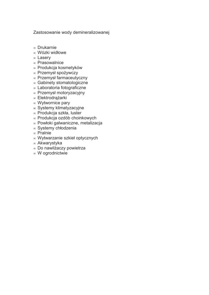 Zastosowanie wody demineralizowanej • • • • • • • • • • • • • • • • • • • • • • Drukarnie Wózki widłowe Lasery Prasowalnice Produkcja kosmetyków Przemysł spożywczy Przemysł farmaceutyczny Gabinety stomatologiczne Laboratoria fotograficzne Przemysł motoryzacyjny Elektrodrążarki Wytwornice pary Systemy klimatyzacyjne Produkcja szkła, luster Produkcja ozdób choinkowych Powłoki galwaniczne, metalizacja Systemy chłodzenia Pralnie Wytwarzanie szkieł optycznych Akwarystyka Do nawilżaczy powietrza W ogrodnictwie