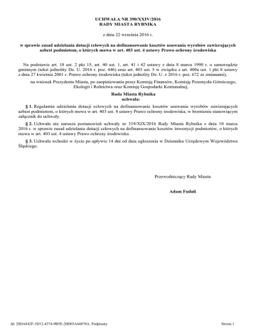 UCHWAŁA NR 390/XXIV/2016 RADY MIASTA RYBNIKA z dnia 22 września 2016 r. w sprawie zasad udzielania dotacji celowych na dofinansowanie kosztów usuwania wyrobów zawierających azbest podmiotom, o których mowa w art. 403 ust. 4 ustawy Prawo ochrony środowiska Na podstawie art. 18 ust. 2 pkt 15, art. 40 ust. 1, art. 41 i 42 ustawy z dnia 8 marca 1990 r. o samorządzie gminnym (tekst jednolity Dz. U. 2016 r. poz. 446) oraz art. 403 ust. 5 w związku z art. 400a ust. 1 pkt 8 ustawy z dnia 27 kwietnia 2001 r. Prawo ochrony środowiska (tekst jednolity Dz. U. z 2016 r. poz. 672 ze zmianami), na wniosek Prezydenta Miasta, po zaopiniowaniu przez Komisję Finansów, Komisję Przemysłu Górniczego, Ekologii i Rolnictwa oraz Komisję Gospodarki Komunalnej, Rada Miasta Rybnika uchwala: § 1. Regulamin udzielania dotacji celowych na dofinansowanie kosztów usuwania wyrobów zawierających azbest podmiotom, o których mowa w art. 403 ust. 4 ustawy Prawo ochrony środowiska, w brzmieniu stanowiącym załącznik do uchwały. § 2. Uchwała nie narusza postanowień uchwały nr 319/XIX/2016 Rady Miasta Rybnika z dnia 10 marca 2016 r. w sprawie zasad udzielania dotacji celowych na dofinansowanie kosztów inwestycji podmiotów, o których mowa w art. 403 ust. 4 ustawy Prawo ochrony środowiska. § 3. Uchwała wchodzi w życie po upływie 14 dni od dnia ogłoszenia w Dzienniku Urzędowym Województwa Śląskiego. Przewodniczący Rady Miasta Adam Fudali Id: 28DA842F-3D12-4374-9B5E-20D03A44878A. Podpisany Strona 1 Załącznik do Uchwały Nr 390/XXIV/2016 Rady Miasta Rybnika z dnia 22 września 2016 r. Regulamin udzielania dotacji celowych na dofinansowanie kosztów usuwania wyrobów zawierających azbest podmiotom, o których mowa w art. 403 ust. 4 ustawy Prawo ochrony środowiska Rozdział 1. Warunki otrzymania dotacji § 1. Dotacja, o której mowa w niniejszym Regulaminie, może zostać przeznaczona na realizację inwestycji polegającej na demontażu, transporcie do miejsca unieszkodliwiania oraz unieszkodliwieniu wyrobów zawierających azbest z obiektu budowlanego położonego na terenie Miasta Rybnika. § 2. Do korzystania z dotacji na zasadach niniejszego Regulaminu uprawnione są: 1) podmioty niezaliczone do sektora finansów publicznych, w szczególności osoby fizyczne, wspólnoty mieszkaniowe, osoby prawne, przedsiębiorcy, jednostki organizacyjne nie będące osobami prawnymi, którym ustawa przyznaje zdolność prawną, 2) jednostki sektora finansów publicznych będące gminnymi osobami prawnymi. Rozdział 2. Tryb udzielania dotacji i niezbędne dokumenty § 3. 1. Wszczęcie procedury o udzielenie dotacji następuje na podstawie złożonego przed przystąpieniem do realizacji inwestycji pisemnego wniosku, którego wzór stanowi załącznik nr 1 do Regulaminu. 2. Do wniosku, o którym mowa w ust. 1, wnioskodawca zobowiązany jest dołączyć kserokopie: 1) dokumentu potwierdzającego tytuł prawny wnioskodawcy do obiektu budowlanego, którego dotyczy inwestycja; w przypadku współwłaścicieli/współużytkowników wieczystych obiektu budowlanego, do którego tytuł prawny posiada kilka osób, należy dołączyć zgodę pozostałych współwłaścicieli/współużytkowników na wykonanie prac związanych z usuwaniem wyrobów zawierających azbest, a w przypadku wspólnoty mieszkaniowej – uchwałę wspólnoty, 2) dokumentu potwierdzającego przeprowadzenie przeglądu stanu technicznego stwierdzającego, że w obiekcie budowlanym zabudowane są elementy zawierające azbest z identyfikacją ich rodzaju i ilości, sporządzony zgodnie z rozporządzeniem Ministra Gospodarki, Pracy i Polityki Społecznej z dnia 2 kwietnia 2004 r. w sprawie sposobów i warunków bezpiecznego użytkowania i usuwania wyrobów zawierających azbest (Dz. U. z 2004 r. nr 71, poz. 649 ze zmianą). 3. W przypadku ubiegania się o dotację przez przedsiębiorcę, będzie ona stanowiła pomoc de minimis, o której mowa w rozporządzeniu Komisji (UE) Nr 1407/2013 z dnia 18 grudnia 2013 r. w sprawie stosowania art. 107 i 108 Traktatu o funkcjonowaniu Unii Europejskiej do pomocy de minimis (Dz.U. L 352 z 24.12.2013, s. 1). 4. Przedsiębiorca wraz z wnioskiem o udzielenie dotacji przedkłada zaświadczenia, oświadczenia oraz informacje niezbędne do udzielenia pomocy de minimis, o których mowa w art. 37 ust. 1 ustawy z dnia 30 kwietnia 2004 r. o postępowaniu w sprawach dotyczących pomocy publicznej (tekst jednolity Dz. U. z 2007 r. nr 59, poz. 404 ze zmianami). 5. Zaświadczenia lub oświadczenia, o których mowa w ust. 4 dotyczą pomocy de minimis, pomocy de minimis w rolnictwie lub pomocy de minimis w rybołówstwie jaką uzyskał przedsiębiorca w roku podatkowym, w którym ubiega się o pomoc oraz w dwóch poprzednich latach podatkowych. 6. Dotacja może zostać udzielona jedynie w przypadku, gdy wartość pomocy de minimis udzielanej przedsiębiorcy na podstawie niniejszej uchwały, łącznie z wartością innej pomocy de minimis uzyskanej przez niego w różnych formach i z różnych źródeł, w okresie trzech lat podatkowych, nie przekroczy kwoty określonej w art. 3 ust. 2 rozporządzenia Komisji (UE) nr 1407/2013. Id: 28DA842F-3D12-4374-9B5E-20D03A44878A. Podpisany Strona 1 7. W zakresie pomocy de minimis, o której mowa w ust. 3, przepisy uchwały obowiązują nie dłużej niż mają zastosowanie przepisy rozporządzenia Komisji (UE) nr 1407/2013, tj. do dnia 31.12.2020 r. z uwzględnieniem 6-miesięcznego okresu przejściowego. Rozdział 3. Koszty kwalifikowane § 4. 1. Za koszty kwalifikowane inwestycji uznaje się koszty wykonania robót obejmujących demontaż wyrobów zawierających azbest, transport do miejsca unieszkodliwiania i ich unieszkodliwienie. 2. Koszty, o których mowa w ust. 1, muszą być poniesione po dniu zawarcia umowy dotacji. Rozdział 4. Terminy składania i rozpatrywania wniosków § 5. 1. Wnioski składa się w terminie do 30 września danego roku. 2. Wnioski rozpatruje się według ko