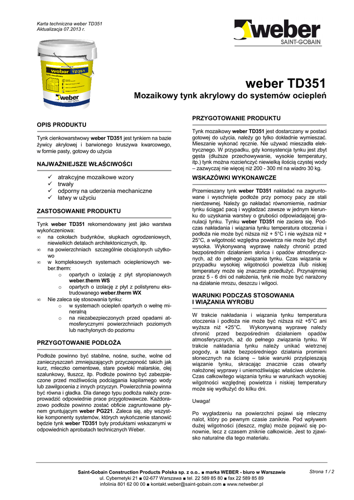 Karta techniczna weber TD351 Aktualizacja 07.2013 r. weber TD351 Mozaikowy tynk akrylowy do systemów ociepleń PRZYGOTOWANIE PRODUKTU OPIS PRODUKTU Tynk cienkowarstwowy weber TD351 jest tynkiem na bazie żywicy akrylowej i barwionego kruszywa kwarcowego, w formie pasty, gotowy do użycia NAJWAŻNIEJSZE WŁAŚCIWOŚCI atrakcyjne mozaikowe wzory trwały odporny na uderzenia mechaniczne łatwy w użyciu ZASTOSOWANIE PRODUKTU Tynk weber TD351 rekomendowany jest jako warstwa wykończeniowa: • na cokołach budynków, słupkach ogrodzeniowych, niewielkich detalach architektonicznych, itp. • na powierzchniach szczególnie obciążonych użytkowo • w kompleksowych systemach ociepleniowych weber.therm: o opartych o izolację z płyt styropianowych weber.therm WS o opartych o izolację z płyt z polistyrenu ekstrudowanego weber.therm WX • Nie zaleca się stosowania tynku: o w systemach ociepleń opartych o wełnę mineralną o na niezabezpieczonych przed opadami atmosferycznymi powierzchniach poziomych lub nachylonych do poziomu PRZYGOTOWANIE PODŁOŻA Podłoże powinno być stabilne, nośne, suche, wolne od zanieczyszczeń zmniejszających przyczepność takich jak kurz, mleczko cementowe, stare powłoki malarskie, olej szalunkowy, tłuszcz, itp. Podłoże powinno być zabezpieczone przed możliwością podciągania kapilarnego wody lub zawilgocenia z innych przyczyn. Powierzchnia powinna być równa i gładka. Dla danego typu podłoża należy przeprowadzić odpowiednie prace przygotowawcze. Każdorazowo podłoże powinno zostać obficie zagruntowane płynem gruntującym weber PG221. Zaleca się, aby wszystkie komponenty systemów, których wykończenie stanowić będzie tynk weber TD351 były produktami wskazanymi w odpowiednich aprobatach technicznych Weber. Tynk mozaikowy weber TD351 jest dostarczany w postaci gotowej do użycia, należy go tylko dokładnie wymieszać. Mieszanie wykonać ręcznie. Nie używać mieszadła elektrycznego. W przypadku, gdy konsystencja tynku jest zbyt gęsta (dłuższe przechowywanie, wysokie temperatury, itp.) tynk można rozcieńczyć niewielką ilością czystej wody – zazwyczaj nie więcej niż 200 - 300 ml na wiadro 30 kg. WSKAZÓWKI WYKONAWCZE Przemieszany tynk weber TD351 nakładać na zagruntowane i wyschnięte podłoże przy pomocy pacy ze stali nierdzewnej. Należy go nakładać równomiernie, nadmiar tynku ściągać pacą i wygładzać zawsze w jednym kierunku do uzyskania warstwy o grubości odpowiadającej granulacji tynku. Tynku weber TD351 nie zaciera się. Podczas nakładania i wiązania tynku temperatura otoczenia i podłoża nie może być niższa niż + 5°C i nie wyższa niż + 25°C, a wilgotność względna powietrza nie może być zbyt wysoka. Wykonywaną wyprawę należy chronić przed bezpośrednim działaniem słońca i opadów atmosferycznych, aż do pełnego związania tynku. Czas wiązania w przypadku wysokiej wilgotności powietrza i/lub niskiej temperatury może się znacznie przedłużyć. Przynajmniej przez 5 - 6 dni od nałożenia, tynk nie może być narażony na działanie mrozu, deszczu i wilgoci. WARUNKI PODCZAS STOSOWANIA I WIĄZANIA WYROBU W trakcie nakładania i wiązania tynku temperatura otoczenia i podłoża nie może być niższa niż +5°C ani wyższa niż +25°C. Wykonywaną wyprawę należy chronić przed bezpośrednim działaniem opadów atmosferycznych, aż do pełnego związania tynku. W trakcie nakładania tynku należy unikać wietrznej pogody, a także bezpośredniego działania promieni słonecznych na ścianę – takie warunki przyśpieszają wiązanie tynku, skracając znacznie czas otwarty nałożonej wyprawy i uniemożliwiając właściwe ułożenie. Czas całkowitego wiązania tynku w warunkach wysokiej wilgotności względnej powietrza i niskiej temperatury może się wydłużyć do kilku dni. Uwaga! Po wygładzeniu na powierzchni pojawi się mleczny nalot, który po pewnym czasie zaniknie. Pod wpływem dużej wilgotności (deszcz, mgła) może pojawić się ponownie, lecz z czasem zniknie całkowicie. Jest to zjawisko naturalne dla tego materiału. Saint-Gobain Construction Products Polska sp. z o.o.. ■ marka WEBER - biuro w Warszawie ul. Cybernetyki 21 ■ 02-677 Warszawa ■ tel. 22 589 85 80 ■ fax 22 589 85 89 infolinia 801 62 00 00 ■ [email protected] ■ www.netweber.pl Strona 1 / 2 Karta techniczna weber TD351 Aktualizacja 07.2013 r. DOBÓR KOLORU UWAGA Podczas dobierania kolorów należy szczególnie pamiętać o tym, że uzyskują one inną barwę w świetle naturalnym a inną w sztucznym. Różnice wynikają także z odmienności postrzegania barwy na papierze i na elewacji. Ponadto na kolorystyczne wrażenia mają wpływ: zróżnicowane faktury powierzchni tynków, wilgotność powietrza, pora roku, otoczenie, odległość od obiektu oraz rodzaj i charakter oświetlenia. Ostateczny uzyskany kolor w dużym stopniu zależy również od warunków wykonania. Przy aplikacji tynków dekoracyjnych należy pamiętać, że pełne, niepodzielne powierzchnie ściany powinny być tynkowane w całości, bez przerw w pracy z tej samej partii produkcyjnej (ten sam numer serii na opakowaniu). Prace tynkarskie należy zorganizować w odpowiedni sposób, w zależności od wielkości tynkowanej powierzchni i warunków atmosferycznych. Szczegóły dotyczące prac związanych z montażem systemu ociepleniowego szczegółowo opisane są w instrukcjach ITB nr 418/2007 oraz 447/2009. Niniejszy opis określa ogólny zakres stosowania wyrobu, ale nie może zastąpić zawodowego przygotowania wykonawcy. Prace należy wykonać zgodnie ze sztuką budowlaną i zasadami BHP. Producent gwarantuje jakość wyrobu, ale nie ma wpływu na warunki i sposób jego użycia. W przypadku wątpliwości należy wykonać własne próby lub skontaktować się z Doradcami Technicznymi Weber. Wraz z ukazaniem się tej karty technicznej tracą ważność karty wcześniejsze. DANE TECHNICZNE Gęstość objętościowa Temper