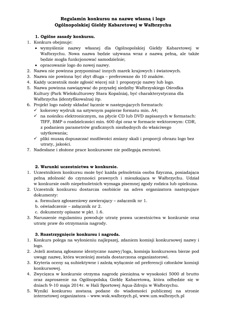 Regulamin konkursu na nazwę własną i logo Ogólnopolskiej Giełdy Kabaretowej w Wałbrzychu 1. 2. 3. 4. 5. 6. 7. 1. Ogólne zasady konkursu. Konkurs obejmuje: wymyślenie nazwy własnej dla Ogólnopolskiej Giełdy Kabaretowej w Wałbrzychu. Nowa nazwa będzie używana wraz z nazwą pełną, ale także będzie mogła funkcjonować samodzielnie; opracowanie logo do nowej nazwy. Nazwa nie powinna przypominać innych marek krajowych i światowych. Nazwa nie powinna być zbyt długa – preferowane do 10 znaków. Każdy uczestnik może zgłosić więcej niż 1 propozycję nazwy lub logo. Nazwa powinna nawiązywać do przyszłej siedziby Wałbrzyskiego Ośrodka Kultury (Park Wielokulturowy Stara Kopalnia), być charakterystyczna dla Wałbrzycha (identyfikowalna) itp. Projekt logo należy składać łącznie w następujących formatach: kolorowy wydruk na sztywnym papierze formatu min. A4; na nośniku elektronicznym, na płycie CD lub DVD zapisanych w formatach: TIFF, BMP o rozdzielczości min. 600 dpi oraz w formacie wektorowym: CDR, z podaniem parametrów graficznych niezbędnych do właściwego użytkowania; pliki muszą dopuszczać możliwości zmiany skali i proporcji obrazu logo bez utraty, jakości. Nadesłane i złożone prace konkursowe nie podlegają zwrotowi. 2. Warunki uczestnictwa w konkursie. 1. Uczestnikiem konkursu może być każda pełnoletnia osoba fizyczna, posiadająca pełną zdolność do czynności prawnych i mieszkająca w Wałbrzychu. Udział w konkursie osób niepełnoletnich wymaga pisemnej zgody rodzica lub opiekuna. 2. Uczestnik konkursu dostarcza osobiście na adres organizatora następujące dokumenty: a. formularz zgłoszeniowy zawierający – załącznik nr 1. b. oświadczenie – załącznik nr 2. c. dokumenty opisane w pkt. 1.6. 3. Naruszenie regulaminu powoduje utratę prawa uczestnictwa w konkursie oraz utratę praw do otrzymania nagrody. 3. Rozstrzygnięcie konkursu i nagroda. 1. Konkurs polega na wyłonieniu najlepszej, zdaniem komisji konkursowej nazwy i logo. 2. Jeżeli zostaną zgłoszone identyczne nazwy/loga, komisja konkursowa bierze pod uwagę nazwę, która wcześniej została dostarczona organizatorowi. 3. Kryteria oceny są subiektywne i zależą wyłącznie od preferencji członków komisji konkursowej. 4. Zwycięzca w konkursie otrzyma nagrodę pieniężną w wysokości 5000 zł brutto oraz zaproszenie na Ogólnopolską Giełdę Kabaretową, która odbędzie się w dniach 9-10 maja 2014r. w Hali Sportowej Aqua-Zdroju w Wałbrzychu. 5. Wyniki konkursu zostaną podane do wiadomości publicznej na stronie internetowej organizatora – www.wok.walbrzych.pl, www.um.walbrzych.pl 6. Zwycięzca zostanie poinformowany o wyniku konkursu drogą e-mailową lub telefonicznie w ciągu 1 dnia od ogłoszenia wyników. 7. Odbiór nagrody nastąpi podczas Ogólnopolskiej Giełdy Kabaretowej w dniu 9 maja 2014 roku. Laureat musi odebrać nagrodę osobiście (w przypadku osoby niepełnoletniej – z prawnym opiekunem). 8. Organizator oświadcza, iż nagroda zostanie wydana zgodnie z obowiązującymi przepisami prawa podatkowego. 9. W skład komisji konkursowej wejdą pracownicy Wałbrzyskiego Ośrodka Kultury oraz Gminy Wałbrzych. Jury zastrzega sobie prawo do nierozstrzygnięcia konkursu w przypadku, gdy żadna z nazw lub logo nie uzyska większości głosów. Wówczas możliwe będzie ogłoszenie ponownej edycji konkursu. 10. Terminy: a. składanie propozycji nazw i logo – do 21 marca 2014 r. (decyduje data dostarczenia do organizatora) b. ogłoszenie wyników – 25 marca 2014 r. Uwaga: Powyższe terminy mogą ulec zmianie. O ewentualnych zmianach Organizator poinformuje na stronie internetowej www.wok.walbrzych.pl. 4. Prawa autorskie. 1. Laureat konkursu zawiera z organizatorem umowę o przeniesienie praw do nazwy i logo (tj. przenosi na organizatora nieodpłatnie wszelkie prawa do zgłoszonej w konkursie nazwy i logo, w tym autorskie prawa majątkowe). 2. Po podpisaniu umowy uczestnikowi nie przysługują żadne inne roszczenia z jakichkolwiek tytułów w stosunku do organizatora, bądź osób trzecich, które nabyły prawa majątkowe do nazwy i logo. 5. Postanowienia końcowe. Prawa i obowiązki organizatora i uczestników konkursu określone są wyłącznie w tym regulaminie. Niniejszy regulamin dostępny jest na stronie internetowej www.wok.walbrzych.pl. W kwestiach nieuregulowanych niniejszym regulaminem stosuje się przepisy kodeksu cywilnego oraz innych odnośnych aktów prawnych. ORGANIZATOR KONKURSU Wałbrzyski Ośrodek Kultury, Gmina Wałbrzych. MIEJSCE SKŁADANIA WYMAGANYCH DOKUMENTÓW Wałbrzyski Ośrodek Kultury, ul. Andersa 185, 58-304 Wałbrzych dokumenty złożone w kopercie lub teczce z dopiskiem: „Konkurs na nazwę własną i logo Ogólnopolskiej Giełdy Kabaretowej w Wałbrzychu”