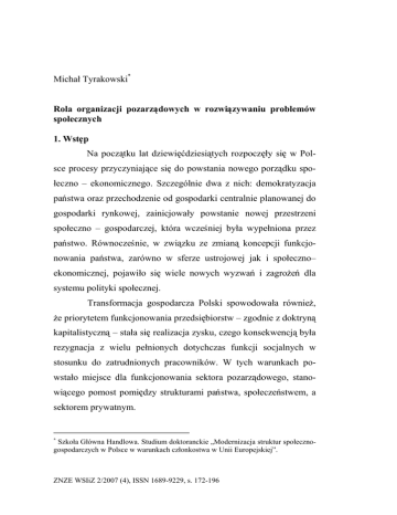 Michał Tyrakowski* Rola organizacji pozarządowych w rozwiązywaniu problemów społecznych 1. Wstęp Na początku lat dziewięćdziesiątych rozpoczęły się w Polsce procesy przyczyniające się do powstania nowego porządku społeczno – ekonomicznego. Szczególnie dwa z nich: demokratyzacja państwa oraz przechodzenie od gospodarki centralnie planowanej do gospodarki rynkowej, zainicjowały powstanie nowej przestrzeni społeczno – gospodarczej, która wcześniej była wypełniona przez państwo. Równocześnie, w związku ze zmianą koncepcji funkcjonowania państwa, zarówno w sferze ustrojowej jak i społeczno– ekonomicznej, pojawiło się wiele nowych wyzwań i zagrożeń dla systemu polityki społecznej. Transformacja gospodarcza Polski spowodowała również, że priorytetem funkcjonowania przedsiębiorstw – zgodnie z doktryną kapitalistyczną – stała się realizacja zysku, czego konsekwencją była rezygnacja z wielu pełnionych dotychczas funkcji socjalnych w stosunku do zatrudnionych pracowników. W tych warunkach powstało miejsce dla funkcjonowania sektora pozarządowego, stanowiącego pomost pomiędzy strukturami państwa, społeczeństwem, a sektorem prywatnym. * Szkoła Główna Handlowa. Studium doktoranckie „Modernizacja struktur społecznogospodarczych w Polsce w warunkach członkostwa w Unii Europejskiej”. ZNZE WSIiZ 2/2007 (4), ISSN 1689-9229, s. 172-196 Wraz z dynamicznym wzrostem liczby różnego rodzaju fundacji, stowarzyszeń oraz innych inicjatyw społecznych, zaczęto używać nowej terminologii. Poza używanym dotychczas terminem „organizacje społeczne”, coraz większa popularność zdobyły określenia organizacje pozarządowe, sektor non–profit oraz trzeci sektor. Zagłębiając się bardziej w genezę powstania oraz budowę wymienionych terminów, zauważymy, że akcentują one niezależność tych organizacji od administracji państwowej (rządu) oraz brak nastawienia tego typu instytucji na zysk (non–profit). Z kolei nazwa instytucje pożytku publicznego, zwraca uwagę na fakt, że ich działalność podejmowana jest dla szeroko rozumianego dobra publicznego np. w sferze ochrony zdrowia, edukacji, pomocy społecznej, promocji różnych inicjatyw, a termin III sektor, akcentuje odrębność sektora instytucji pożytku publicznego od sektora państwowego oraz sektora prywatnego1. Pomimo tego, iż koncepcja społeczeństwa obywatelskiego, wraz z ideą przenoszenia części obowiązków państwa, instytucjom „bliższym obywatelowi”, jest w krajach zachodnich sprawdzonym i skutecznym rozwiązaniem, w Polsce pozostaje nadal nie pozbawiona kontrowersji. Sytuacja taka spowodowana jest wieloma czynnikami. Organizacje pozarządowe, często postrzegane są jedynie jako konsumenci środków publicznych, lub organizacje, które pod parasolem realizacji celów statutowych, dążą do realizacji partykularnych interesów wąskich grup społecznych, niekoniecznie powiązanym z tzw. pożytkiem publicznym. Dodatkowo, instytucjom non-profit równie 1 A. Niewiadomska, Finansowanie sektora organizacji pozarządowych w Polsce [w:] Funkcjonowanie instytucji non-profit w oparciu o normy i standardy Unii Europej- 173 często nie są przychylne struktury państwowe, które upatrują w organizacjach pozarządowych, konkurencji dla koncepcji systemu społecznego zgodnego z aktualnie obowiązującym nurtem politycznym. Problemy funkcjonowania organizacji pozarządowych, pogłębiają również bariery natury legislacyjnej oraz ograniczone możliwości pozyskiwania środków finansowych na realizację statutowych działań. Na tym polu dochodzi często do konfliktów na linii organizacje pozarządowe – administracja państwowa. Przedstawiciele trzeciego sektora, zarzucają urzędom nadmierną biurokratyzację oraz nieumiejętność spojrzenia na cele realizowane przez NGO2 z szerszej perspektywy. Z drugiej strony, organizacje pozarządowe postrzegane są przez organy administracji państwowej oraz fundatorów środków pieniężnych, jako organizacje o zbyt niskim poziomie profesjonalizacji oraz formalizacji prowadzonych działań, co stawia je w świetle partnera mało wiarygodnego. Zasygnalizowane wyżej problemy, należy uzupełnić o stosunkowo nowy, aczkolwiek niezmiernie istotny kontekst – procesy integracyjne z Unią Europejską. Procesy te stawiają organizacje pozarządowe w nowych realiach, stwarzając nowe możliwości rozwoju, finansowania oraz wymiany doświadczeń z innymi instytucjami europejskim, ale również wzmagają konieczność profesjonalizacji oraz pewnej standaryzacji podejmowanych przez nie działań. skiej (pod red. M. Fic), Nowa Ruda 2005, s. 60. 2 NGO (Non Governmental Organization) – organizacja pozarządowa. Skrót ten zyskuje coraz większą popularność i jest coraz częściej stosowany w literaturze przedmiotu. 174 Tak rysująca się sytuacja stawia przed organizacjami pozarządowymi zarówno nowe możliwości, jak i zagrożenia w pełnionej przez nie doniosłej i odpowiedzialnej, aczkolwiek subsydiarnej w stosunku do roli państwa, funkcji rozwiązywania problemów społecznych. Ponadto zmusza organizacje pozarządowe do adaptacji do nowych realiów funkcjonowania spowodowanych postępem cywilizacyjnym, rozwojem społeczno – ekonomicznym społeczeństwa, niejako wymuszając na nich konieczność uczestnictwa w nowych obszarach polityki społecznej – dotychczas marginalizowanych i bagatelizowanych, a których realizacja jest niezbędna z perspektywy budowania nowoczesnego społeczeństwa obywatelskiego. 2. Pojęcie III sektora w koncepcji nowoczesnego państwa W najprostszym ujęciu sektor społeczny stanowi uzupełnienie sektora publicznego i prywatnego. Wykształcił się on jako suplement wymienionych sektorów, powstając w odpowiedzi na niedostateczną realizację zadań społecznych przez państwo oraz rynek. Podstawową cechą odróżniającą ten sektor od sektora prywatnego i publicznego jest wykorzys