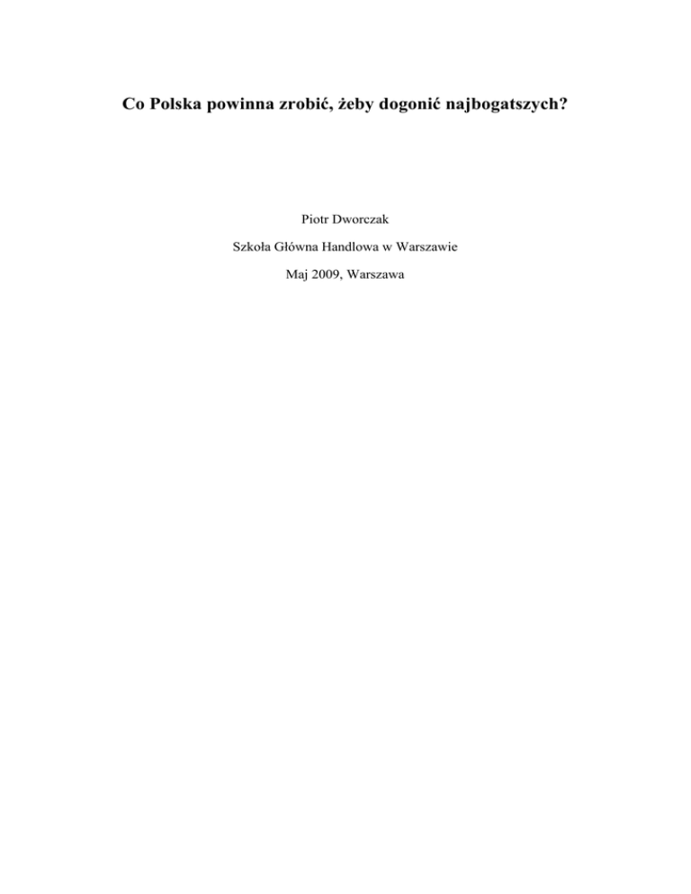 Co Polska powinna zrobić, żeby dogonić najbogatszych? Piotr Dworczak Szkoła Główna Handlowa w Warszawie Maj 2009, Warszawa Wstęp Kiedy w 1991 roku, po zastosowaniu „szokowej terapii” transformacji gospodarczej, Polska powróciła na ścieżkę wzrostu gospodarczego w nowych warunkach ekonomicznych i społecznych, PKB per capita1 stanowił jedynie 31,5%2 odpowiedniego wskaźnika obliczonego dla krajów UE 15. Przepaść dzieląca nas od zachodniej Europy była „spadkiem” odziedziczonym po ponad 40-letnim okresie panowania niewydolnego systemu gospodarczego. Obecnie dochód na osobę w krajach UE 15 jest przeciętnie 2-krotnie wyższy niż w Polsce. Z jednej strony jest to powód do zadowolenia z faktu, że odrobiliśmy część strat, z drugiej strony rodzi się pytanie, czy Polska w pełni wykorzystuje szanse i czy tempo „doganiania najbogatszych” nie mogłoby być szybsze. Problem konwergencji gospodarczej, zjawiska szybszego wzrostu PKB per capita w krajach, które dysponują niższym wyjściowym poziomem dochodu na mieszkańca, jest szeroko opisany w literaturze ekonomicznej. Najbardziej popularnym narzędziem teoretycznym objaśniającym ten proces jest neoklasyczny model wzrostu Roberta Solowa. Ze względu na swoją specyfikę (założenie o malejących krańcowych przychodach z kapitału i egzogenicznym charakterze postępu technologicznego) ma on jednak ograniczoną przydatność do formułowania wskazówek dla polityki gospodarczej. Z tego powodu w pracy posłużę się dodatkowo modelami wzrostu endogenicznego, które pozwalają wyciągnąć szerszą gamę wniosków dla Polski. Za tytułowych „najbogatszych” przyjmuję grupę UE 153, która wydaje się być najlepszym punktem odniesienia dla naszego kraju. Praca rozpoczyna się od weryfikacji hipotezy o istnieniu zjawiska zbieżności gospodarczej w Europie Zachodniej i analizy dotychczasowych źródeł konwergencji Polski względem UE 15. Pozytywna odpowiedź na pytanie o obecność konwergencji uprawnia nas do wykorzystania przytoczonych modeli wzrostu do wyciągnięcia wniosków dla polityki gospodarczej. Następnie rozważam działania związane z rynkiem pracy, które mogą przybliżyć w czasie moment dogonienia UE 15 przez Polskę. Ostatnia część zawiera podsumowanie. Rzut okiem na historię – czy możemy mówić o konwergencji w Europie? Po drugiej wojnie światowej poziom PKB per capita w Europie Zachodniej był mocno zróżnicowany. W 1950 roku wśród krajów określanych obecnie jako UE 15 stosunek poziomów PKB per capita trzech najbogatszych państw do trzech najbiedniejszych wynosił 2,96. Obecnie analogiczny wskaźnik wynosi 1,48, czyli dokładnie dwa razy mniej4. Kolejnych obserwacji dostarczają poniższe wykresy. 1 W parytecie siły nabywczej Obliczenia własne na podstawie The Conference Board, Total Economy Database, January 2009; jeśli w pracy nie podano źródła, oznacza to, że dane pochodzą z Eurostatu. 3 Kraje Unii Europejskiej według stanu sprzed rozszerzenia w 2004 roku, tzw. „stara Piętnastka”; w pracy używam zamiennie pojęć UE 15 i Europa Zachodnia. 4 Pominięty został Luksemburg ze względu na wyjątkowo wysokie PKB per capita w stosunku do wszystkich krajów. 2 1 AT IT FI LU FRBE NL 40 SE DK UK PKB per capita w 1950 roku (w PSN) Irlandia Portugalia Hiszpania 2008 2005 2002 1999 1996 1993 9 000 1990 7 000 1987 5 000 1984 3 000 1981 1 000 20 1960 2,0% 60 1978 2,5% 80 1975 DE 100 1972 3,0% 120 1969 PT 140 1966 3,5% IE 1963 GR SI Wykres 2: Konwergencja PKB per capita najbiedniejszych krajów UE 15 (UE 15 = 100) PKB per capita (UE 15=100) Przeciętne tempo wzrostu PKB per capita 1950-2008 Wykres 1: Związek między poziomem PKB per capita w 1950 roku a tempem jego wzrostu w latach 1950-2008 w krajach UE15 4,0% Rok Wykres 1 obrazuje zależność między wyjściowym poziomem PKB per capita (w 1950 r.) a tempem jego przeciętnego wzrostu w latach 1950 – 2008. Widzimy, że zależność ta jest odwrotna i bardzo silna. Kraje początkowo biedniejsze (Grecja, Hiszpania, Portugalia) cechowały się znacząco wyższym tempem rozwoju niż kraje bogate (Wielka Brytania, Szwecja, Dania). Wykres 2 pokazuje poziom PKB per capita w wybranych trzech krajach (Irlandia, Portugalia, Hiszpania) w stosunku do średniego poziomu dla UE 15 z danego okresu. Również te dane potwierdzają hipotezę o występowaniu konwergencji – wszystkie kraje osiągnęły w 2008 roku wyższy niż w okresie początkowym odsetek PKB per capita UE 15. Jednakże stopień i szybkość konwergencji były zupełnie inne. Można potraktować te trzy przypadki jako trzy scenariusze rozwoju Polski – który z nich się spełni, zależy w dużym stopniu od posunięć polityki gospodarczej. Aby dowiedzieć się czegoś o źródłach konwergencji Polski, dokonam dekompozycji wzrostu gospodarczego, przy czym wyniki będą odnoszone do pewnego poziomu referencyjnego, co pozwoli obserwować zmianę względem UE 15. Poziomem referencyjnym będą analogiczne wielkości obliczone w oparciu o dekompozycję wzrostu dla Francji, która posiada bardzo wygodną własność reprezentowania w niemal idealny sposób przeciętnego poziomu dochodu i tempa wzrostu UE 155. Posłużę się funkcją produkcji w postaci: Y = AKα L1-α, która przyjmuje intensywną postać6 y = Akα. Następujące równanie pozwoli nam zaobserwować, jak zmieniała się sytuacja Polski na tle Francji7. (1) 𝑦 𝑝𝑙 𝑦 𝑓𝑟 = 𝐴𝑝𝑙 𝑘 𝑝𝑙 𝐴𝑓𝑟 𝑘 𝑓𝑟 𝛼 Wzór (1) pozwala nam obliczyć względny poziom TFP8 w Polsce, gdyż pozostałe zmienne są obserwowalne. Tym samym będziemy mogli dokonać dekompozycji różnicy w poziomach dochodu na 5 Podobny zabieg został zastosowany w pracy Caselli [7]. Jego celem jest znaczne uproszczenie obliczeń i możliwość skorzystania z szerszego zakresu danych empirycznych. 6 Koncepcja intensywnej postaci funkcji produkcji polega na wyrażeniu poszczególnych jej argumen