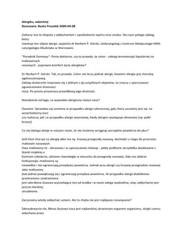 Alergiku, odetchnij Rozmawia: Beata Prasałek 2009-04-08 Zatkany nos to kłopoty z oddychaniem i upośledzenie węchu oraz smaku. Na czym polega zabieg, który niweluje ten objaw alergii, wyjaśnia dr Norbert P. Górski, otolaryngolog z Centrum Medycznego MML Laryngologia Okulistyka w Warszawie. "Poradnik Domowy": Panie doktorze, czy to prawda, że celon - zabieg termoterapii bipolarnej na małżowinach nosowych - poprawia komfort życia alergików? Dr Norbert P. Górski: Tak, to prawda. Celon nie leczy jednak alergii, bowiem alergia jest chorobą ogólnoustrojową. Zabieg skutecznie rozprawia się z jednym z jej uciążliwych objawów, to znaczy z uporczywym ograniczeniem drożności nosa. Po prostu przywraca prawidłową jego drożnośd. Niezależnie od tego, co wywołało alergiczny nieżyt nosa? Owszem. Sprawdza się zarówno w przypadku alergii całorocznej, gdy chory uczulony jest np. na wszechobecny kurz czy roztocza, jak i w przypadku alergii sezonowej, kiedy alergen występuje okresowo (np. pyłki brzozy). Co się takiego dzieje w naszym nosie, że nie możemy wciągnąd porządnie powietrza do płuc? Jeśli ktoś choruje na alergię albo ma np. krzywą przegrodę nosową, dochodzi u niego do przerostu małżowin nosowych. Owe małżowiny to - obrazowo i w uproszczeniu mówiąc - jakby podłużne skrzydełka zbudowane z tkanki miękkiej o kostnym szkielecie, ułożone równolegle w stosunku do przegrody nosowej. Gdy nos dobrze funkcjonuje, małżowiny są niewielkie i nie ograniczają przepływu powietrza. Jednak przy alergii czy krzywej przegrodzie nosowej obie małżowiny (lub jedna) powiększają się i ograniczają przepływ powietrza. W przypadku alergii dodatkowo przekrwiona i podrażniona jest cała błona śluzowa wyściełająca nos od środka i w nosie zalega wydzielina, więc oddychanie jest jeszcze bardziej utrudnione. Zaczynamy wtedy oddychad ustami. Ale to chyba nie jest najlepsze rozwiązanie? Zdecydowanie nie. Błona śluzowa nosa jest najbardziej ukrwionym organem organizmu, dzięki czemu wdychane przez nos powietrze bardzo szybko się ogrzewa - np. wciągamy powietrze o temperaturze -5°C, a do płuc docie ra ogrzane do temperatury ciała. Wdychane ustami trafia do płuc zimne, co może przyczyniad się do częstych infekcji. W jaki sposób można więc przywrócid prawidłową drożnośd nosa? Jeśli np. powodem niedrożności jest krzywa przegroda nosowa, trzeba najpierw skorygowad ją chirurgicznie, a potem ewentualnie zgłosid się na zabieg celon. Jeżeli zaś przyczyną niedrożności jest przerost małżowin nosowych powstały na skutek alergii, trzeba zażywad leki leczące alergię (np. antyhistaminowe) i dodatkowo można się poddad zabiegowi celon. Każdy może się poddad temu zabiegowi, czy też są jednak jakieś ograniczenia, na przykład wiekowe? W zasadzie każdy może skorzystad z celonu. W przypadku małych dzieci przeprowadzamy ten zabieg po konsultacji z pediatrą i raczej dopiero po ukooczeniu przez malca 6. roku życia. Na czym polega kwalifikacja do zabiegu? Przeprowadzamy szczegółowy wywiad lekarski oraz badanie laryngologiczne. Żadnych badao laboratoryjnych nie trzeba wykonywad. A jeśli już zostaniemy zakwalifikowani do zabiegu, co powinniśmy robid w dniu, w którym ma się on odbyd? Nie ma szczególnych zaleceo. Jedynie dwie godziny przed samym zabiegiem należy zażyd 2 tabletki Nurofenu forte. Czy konieczne jest znieczulenie? Tak, znieczulenie miejscowe. Stosujemy preparaty znieczulające w sprayu i w formie zastrzyku podanego bardzo cieniutką igłą w małżowiny nosowe. Celon to zabieg mało inwazyjny i bezkrwawy, może więc byd przeprowadzany w warunkach ambulatoryjnych. Jak przebiega sam zabieg? Przez nozdrza przednie, czyli tzw. dziurkę w nosie lekarz wprowadza pod błonę śluzową małżowiny nosowej bardzo cienką sondę i pozostawia ją tam na kilka sekund. Przez tę sondę przepływają fale radiowe o wysokiej częstotliwości i rozgrzewają ją do temperatury 70-80°C. Sond ą nakłuwa się małżowinę od jednego do trzech razy. W przypadku przerostu małżowin powstałego na skutek alergii - zabieg trzeba przeprowadzid na obu małżowinach nosowych. Trwa on od 20 do 40 minut. Potem przez 5 tygodni tkanki miękkie, z których zbudowane są małżowiny, przebudowują się pod wpływem zaaplikowanego ciepła. Przebudowują się w taki sposób, że przerośnięte małżowiny powracają do prawidłowych rozmiarów, dzięki czemu przywrócona zostaje drożnośd nosa. Czy taki efekt długo się utrzymuje? Przez wiele lat, często do kooca życia, i wówczas nie trzeba go powtarzad. Gdyby jednak z jakichś powodów kiedyś zaszła taka potrzeba, nie ma przeciwwskazao do ponownego zabiegu. Co można robid, a czego należy unikad po zabiegu celon? Zaleceo jest naprawdę niewiele. Zaraz po zabiegu można wrócid do codziennych zajęd, ale w tym samym dniu lepiej unikad dużego wysiłku fizycznego. Przez pierwsze 5 dni należy zażywad łagodne środki przeciwbólowe i przeciwzapalne oraz przez 2 tygodnie kilka razy dziennie aplikowad sobie do nosa nawilżające, oczyszczające aerozole (np. Marimer). Po 5-6 tygodniach od zabiegu trzeba zgłosid się do lekarza na kontrolne badanie. A potem... oddychad pełną piersią przez udrożniony nos.