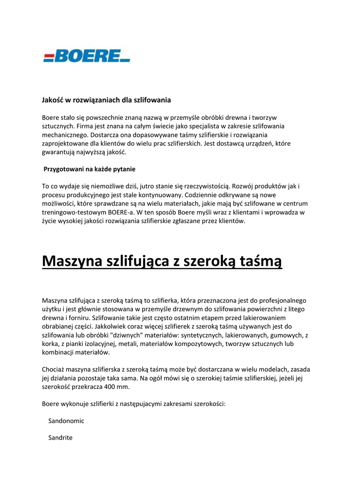 Jakość w rozwiązaniach dla szlifowania Boere stało się powszechnie znaną nazwą w przemyśle obróbki drewna i tworzyw sztucznych. Firma jest znana na całym świecie jako specjalista w zakresie szlifowania mechanicznego. Dostarcza ona dopasowywane taśmy szlifierskie i rozwiązania zaprojektowane dla klientów do wielu prac szlifierskich. Jest dostawcą urządzeń, które gwarantują najwyższą jakość. Przygotowani na każde pytanie To co wydaje się niemożliwe dziś, jutro stanie się rzeczywistością. Rozwój produktów jak i procesu produkcyjnego jest stale kontynuowany. Codziennie odkrywane są nowe możliwości, które sprawdzane są na wielu materiałach, jakie mają być szlifowane w centrum treningowo-testowym BOERE-a. W ten sposób Boere myśli wraz z klientami i wprowadza w życie wysokiej jakości rozwiązania szlifierskie zgłaszane przez klientów. Maszyna szlifująca z szeroką taśmą Maszyna szlifująca z szeroką taśmą to szlifierka, która przeznaczona jest do profesjonalnego użytku i jest głównie stosowana w przemyśle drzewnym do szlifowania powierzchni z litego drewna i forniru. Szlifowanie takie jest często ostatnim etapem przed lakierowaniem obrabianej części. Jakkolwiek coraz więcej szlifierek z szeroką taśmą używanych jest do szlifowania lub obróbki "dziwnych" materiałów: syntetycznych, lakierowanych, gumowych, z korka, z pianki izolacyjnej, metali, materiałów kompozytowych, tworzyw sztucznych lub kombinacji materiałów. Chociaż maszyna szlifierska z szeroką taśmą może być dostarczana w wielu modelach, zasada jej działania pozostaje taka sama. Na ogół mówi się o szerokiej taśmie szlifierskiej, jeżeli jej szerokość przekracza 400 mm. Boere wykonuje szlifierki z następujacymi zakresami szerokości: Sandonomic Sandrite Select Select +Plus+ Elite Sanding lines Sandonomic Standardowa maszyna szlifująca z szeroką taśmą za bardzo racjonalną cenę: Szlifowanie z góry 1-2 jednostki szlifierskie kombinacja rolki kontaktowej i zespołu Kombi szerokości robocze od 650 do 1300 mm również dostarczana jako szlifierka z wąską taśmą szlifierską o szerokości 400 mm Charakterystyka: model wyjściowy mechaniczne szlifowanie znakomity stosunek cena / jakość szybki zwrot z inwestycji szlifowanie litego drewna oraz forniru (opcjonalnie) prosta maszyna Elektoniczno-pneumatyczny system oscylacyjny z taśmą szlifierską • ochrona przed ześlizgiwaniem się taśmy szlifierskiej, • pneumatyczny naciąg taśmy szlifierskiej, • automatyczne urządzenie hamujące na jednostce szlifującej, • prosta i szybka wymiana talerza szlifierskiego, • podawanie materiału za pośrednictwem taśmy przenośnikowej, • gumowe rolki dociskowe, • elektromotorycznie regulowana wysokość stołu posuwu, • elektroniczny licznik cyfrowy dla precyzyjnej regulacji wysokości stołu posuwu, • precyzyjna ręczna regulacja wysokości stołu posuwu • wyłączniki krańcowe dla najwyższej i najniższej pozycji stołu posuwu, • osłona dla palców, • awaryjne zatrzymanie na wejściu i wyjściu, • ręcznie obsługiwane przełączniki, • zabezpieczenie przeciążeniowe, • amperomierz silnika taśmy szlifierskiej, Możliwe opcje: • mocniejszy silnik taśmy szlifierskiej, • płynna regulacja prędkości podawania, • poszerzony stół podawania, • prosty czujnik, • stalowa rolka kontaktowa, • jednostka szczotkująca ze szczotką czyszczącą Modele: Sandonomic C Sandonomic KC Sandrite Kompletna maszyna szlifująca z szeroką taśmą o wysokiej wydajności dla mniejszych i średnich warsztatów: Szlifowanie z góry 1-3 jednostki szlifierskie kombinacja rolki kontaktowej i zespołu Kombi szerokości robocze 1100 i 1300 mm obsługa poprzez wyświetlacz tekstowy z pełną diagnostyką błędów, różne opcje, również do szlifowania forniru i lakierów, Charakterystyka: znakomity stosunek cena / jakość szybki zwrot z inwestycji minimalne zużycie sprężonego powietrza, kompletne urządzenie, nie wymaga wielu czynności konserwacyjnych, przyjazna dla operatora dzięki wyświetlaczowi, Modele: Sandrite Basic Sandrite SP (segmentowany talerz szlifierski) Sandrite EP (elektroniczno-pneumatyczny talerz szlifierski) Wybierz Mocna kompaktowa maszyna szlifująca z szeroką taśmą o wysokiej wydajności dla mniejszych i średnich warsztatów: szlifowanie od góry i od dołu, 1-4 jednostek szlifierskich, kombinacja rolki kontaktowej, urządzenia combi, talerza szlifierskiego, głowicy tnącej i (teksturującej) jednostki szczotkującej, standardowe szerokości robocze 900, 1100 i 1300 mm wiele opcji dla szlifowania różnych materiałów, Charakterystyka: wytrzymała maszyna, znakomity stosunek cena / jakość szybki zwrot z inwestycji minimalne zużycie sprężonego powietrza, kompletne urządzenie, Standardowe modele: Select K Select C Select KS Select KK Select KC Select KKS Select KKK Select KKC Select PK Select PKS Select PKC inne niestandardowe kombinacje wiele kombinacji linii produkcyjnych takich jak kombinacja maszyny szlifującej z szeroką taśmą Select KKS w połączeniu z teksturującą maszyną szczotkującą Select BBBB Select +Plus+ Dalsze rozbudowanie modelu Select dla większej produkcji w ramach średnich warsztatów: szlifowanie od góry i od dołu, 1-5 jednostek szlifierskich, kombinacja rolki kontaktowej, jednostki combi, głowicy tnącej, teksturowania, szczotkowania szerokość robocza 1350 mm sterowanie poprzez ekran dotykowy + pełna diagnostyka kilka pakietów opcjonalnych, takich jak fornir, lakier i tekstura Charakterystyka: więcej maszyn za tę samą kwotę stała wysokość podawania, długie taśmy szlifierskie 2620 mm, minimalne zużycie sprężonego powietrza, maszyna bardzo kompletna: między innymi długa taśma szlifierska, czujnik, wysuwana rolka prowadząca na podajniku przyjazna dla operatora dzięki ekranowi dotykowemu, nieograniczone możliwości zastosowania, Standardowe modele: Selec