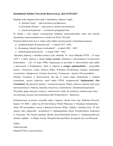 Działalność Klubu Turystyki Rowerowej „KUJAWIAK” Każdego roku organizowano stałe w kalendarzu, imprezy i rajdy: a/ „Śnieżne Tropy” – rajd styczniowy do Balczewa; b/„Powitanie Wiosny” – nad jeziora w okolicy Inowrocławia; c/ „Jesień na Kujawach” – wrześniowe pożegnanie lata. W każdej z tych imprez uczestniczyła młodzież inowrocławskich szkół oraz dorośli mieszkańcy miasta każdorazowo w liczbie od 30 do 150 osób. Przeprowadzone były trzy 5- letnie cykle rajdów turystycznych o określonej tematyce: a/ „Szlakiem Kujaw Przemysłowych” – w latach 1977- 1981; b/ „Poznajemy Zabytki Kujaw Zachodnich” – w latach 1983 – 1987; c/ „Wokół Kujawskich Jezior” – w latach 1988 – 1992. Specjalną imprezą z udziałem kolarzy były obchody 25- lecia Oddziału PTTK - 25 maja 1976 r. a także impreza z okazji setnej rocznicy założenia w Inowrocławiu Towarzystwa Kołowników – (22- 24 maja 1998). Organizacja ta powstała w Inowrocławiu jako jedna z pierwszych w Wielkopolsce. Była to impreza o zasięgu ogólnopolskim – przyjechali turyści z Warszawy, Łodzi, Ostrowa Wlkp., Poznania, Świebodzina, Chojnic, Grudziądza i oczywiście z Bydgoszczy, Torunia, Kruszwicy, Trzemeszna – łącznie 120 uczestników. Przełom Tysiącleci w Inowrocławiu, tak jak w całym kraju, obchodzono z wielkim rozmachem, turyści kujawscy spod znaku PTTK zorganizowali Ogólnopolski Zlot Gwiaździsty dla pieszych, kolarzy i zmotoryzowanych. Punkty startowe ustalone były poza Inowrocławiem w: Pakości, Strzelnie, Kruszwicy, Gniewkowie i Złotnikach Kujawskich. Wszystkie grupy pieszych, kolarzy i motorowców miały do przebycia zróżnicowane trasy – lecz kończące się przy inowrocławskiej Hali Widowiskowo - Sportowej. Kontynuowane są prawie wszystkie rajdy i imprezy, doszły nowe (np. Szlakiem Piewców Kujaw). W 2006 r. odbył się III Zlot Kolarzy Polski Północnej w Chomiąży Szlacheckiej – około 100 uczestników, nawet z dalszych Ostrowa Wlkp., Gubina i Zielonej Góry. W tym samym roku „Kujawiak” uczestniczył w Ogólnopolskim Zlocie Przodowników Kolarstwa w Cieszynie. Nie można pominąć udziału inowrocławskich kolarzy w międzynarodowych zlotach i rajdach - w Belgii, Francji, Hiszpanii Szwecji Danii, Szwajcarii oraz we Włoszech. źródło: Alfred Krysiak Oddział PTTK w Inowrocławiu