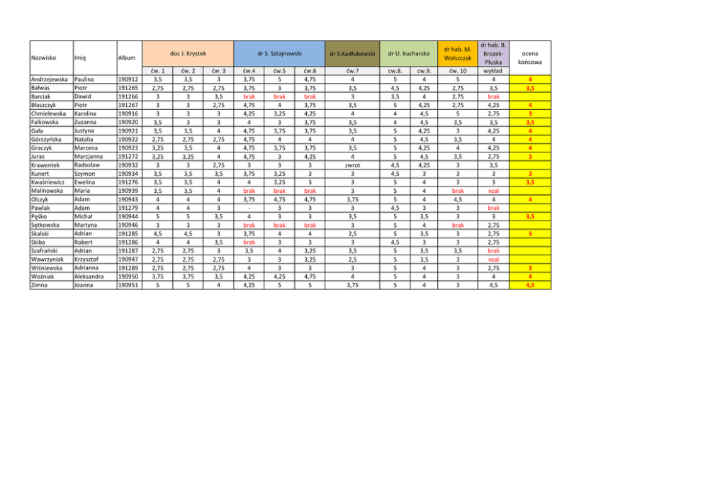 Nazwisko Andrzejewska Bałwas Barciak Błaszczyk Chmielewska Falkowska Gała Górczyńska Graczyk Juras Krawentek Kunert Kwaśniewicz Malinowska Olczyk Pawlak Pęśko Sętkowska Skalski Skiba Szafrański Wawrzyniak Wiśniewska Woźniak Zimna Imię Paulina Piotr Dawid Piotr Karolina Zuzanna Justyna Natalia Marzena Marcjanna Radosław Szymon Ewelina Maria Adam Adam Michał Martyna Adrian Robert Adrian Krzysztof Adrianna Aleksandra Joanna doc J. Krystek Album 190912 191265 191266 191267 190916 190920 190921 190922 190923 191272 190932 190934 191276 190939 190943 191279 190944 190946 191285 191286 191287 190947 191289 190950 190951 ćw. 1 3,5 2,75 3 3 3 3,5 3,5 2,75 3,25 3,25 3 3,5 3,5 3,5 4 4 5 3 4,5 4 2,75 2,75 2,75 3,75 5 ćw. 2 3,5 2,75 3 3 3 3 3,5 2,75 3,5 3,25 3 3,5 3,5 3,5 4 4 5 3 4,5 4 2,75 2,75 2,75 3,75 5 dr S. Sztajnowski ćw. 3 3 2,75 3,5 2,75 3 3 4 2,75 4 4 2,75 3,5 4 4 4 3 3,5 3 3 3,5 3 2,75 2,75 3,5 4 ćw.4 3,75 3,75 brak 4,75 4,25 4 4,75 4,75 4,75 4,75 3 3,75 4 brak 3,75 4 brak 3,75 brak 3,5 3 4 4,25 4,25 ćw.5 5 3 brak 4 3,25 3 3,75 4 3,75 3 3 3,25 3,25 brak 4,75 3 3 brak 4 3 4 3 3 4,25 5 dr S.Kadłubowski ćw.6 4,75 3,75 brak 3,75 4,25 3,75 3,75 4 3,75 4,25 3 3 3 brak 4,75 3 3 brak 4 3 3,25 3,25 3 4,75 5 ćw.7 4 3,5 3 3,5 4 3,5 3,5 4 3,5 4 zwrot 3 3 3 3,75 3 3,5 3 2,5 3 3,5 2,5 3 4 3,75 dr U. Kucharska cw.8. 5 4,5 3,5 5 4 4 5 5 5 5 4,5 4,5 5 5 5 4,5 5 5 5 4,5 5 5 5 5 5 cw.9. 4 4,25 4 4,25 4,5 4,5 4,25 4,5 4,25 4,5 4,25 3 4 4 4 3 3,5 4 3,5 3 3,5 3,5 4 4 4 dr hab. M. Wolszczak ćw. 10 5 2,75 2,75 2,75 5 3,5 3 3,5 4 3,5 3 3 3 brak 4,5 3 3 brak 3 3 3,5 3 3 3 3 dr hab. B. BrożekPłuska wykład 4 3,5 brak 4,25 2,75 3,5 4,25 4 4,25 2,75 3,5 3 3 nzal 4 brak 3 2,75 2,75 2,75 brak nzal 2,75 4 4,5 ocena końcowa 4 3,5 4 3 3,5 4 4 4 3 3 3,5 4 3,5 3 3 4 4,5