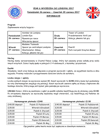 YEAR 6 WYCIECZKA DO LONDYNU 2017 Poniedziałek 26 czerwca - Czwartek 29 czerwca 2017 INFORMACJE Program Zaplanowane wizyty/zajęcia:Autokar do Londynu Poniedziałek London Eye 26 czerwca Pływanie po rzece Tower of London Środa 28 czerwca Przedstawienie ‘Król Lew’ Kolacja, płwanie lub gry Czwartek 29 czerwca Powrót Wieczorny spacer Madame Tussauds Wtorek 27 czerwca Spacer po centralnym Londynie Westminster Abbey Park rozrywki Drayton Manor Kolacja, płwanie lub gry Nocleg Nocleg mamy zarezerwowany w Crystal Palace Lodge, który był używany przez szkołę przy wielu innych wizytach. Dzieci będą spały w pokojach 2-4 osobowych, z łazienką i prysznicem. Posiłki Śniadanie, lunch oraz kolacja są włączone w program wycieczki i opłaty, za wyjątkiem lunchu w dniu wyjazdu. Prosimy rodziców o przygotowanie dzieciom lunchu do autokaru. Liczba miejsc i opłaty Liczba wolnych miejsc na wycieczce wynosi 80. Koszt wycieczki to £240,który może być podzielony na raty (harmonogram znajduje się poniżej). Koszt wycieczki zawiera opłtę za bluzę z kapturem dla każdego dziecka, którą mogą zatrzymać jako pamiąkę po wycieczce. UWAGA Dzieci, które są zwolnione z opłat za posiłki szkolne kwalifikują się do obiżonej ceny £130. Po otrzymaniu depozytu za wycieczkę będziemy mogli stwierdzić, czy kwalifikują się Państwo do ceny zniżkowej. Harmonogram płatności £240 £40.00 depozyt Piątek 21 Październik Harmonogram płatności £130 £40.00 depozyt Piątek 21 Październik £35.00 Wtorek 6 Grudzień £20.00 Wtorek 6 Grudzień £35.00 Piątek 6 Styczeń £20.00 Piątek 6 Styczeń £35.00 Piątek 10 Luty £15.00 Piątek 10 Luty £35.00 Piątek 24 Marzec £15.00 Piątek 24 Marzec £30.00 Piątek 28 Kwiecień £10.00 Piątek 28 Kwiecień £30.00 Piątek 26 Maj £10.00 Piątek 26 Maj Opcjonalnie: pełna kwota może być zapłacona w dowolnym momencie. verte e Wszystkie wpłacone pieniądze nie podlegają zwrotowi (włączają depozyt), ponieważ za wszystkie bilety, wejściówki i nocleg płacimy z dużym wyprzedzeniem. Choroba dziecka uniemożliwiająca udział w wycieczce jest objęta ubezpieczeniem, o ile będzie potwierdzona przez lekarza. Aby zarezerwować miejsce prosimy wpłcić depozyt £40 oraz wypełnić i zwrócić poniższy druk, nie później niż do PIĄTKU 21 PAŹDZIERNIKA 2016. Prosimy pamiętać, że do czasu otrzymania depozytu, wasze dziecko nie ma zagwarantowanego miejsca na wycieczce. Miejsca są rezerwowane na podstawie kolejności wpłacania depozytu, w razie koniecznoś zostanie utowrzona lista rezerwowa. Z poważaniem, Mr K Wright ----------------------------------------------------------------------------------------------------------- Zredukowany koszt wycieczki i darmowe posiłki szkolne Aby kwalifikować się do zniżki za wycieczkę dziecko musi otrzymywać darmowe szkolne posiłki przez ostatnie 6 lat. Zachęamy wszystkich rodziców, którzy myślą, że kwalifikują się do zniżki o jak najszybsze złożenie aplikacji. Pomoże to we wczesnym ustaleniu, czy zobowiązani będą do zapłaty pełnej, czy obniżonej kwoty. W październiku rząd podda naszą szkołę ocenie, aby ustalić fundusze na ten rok szkolny. Biorą oni pod uwagę wiele czynników, a jednym z nich jest liczba dzieci, które otrzymują darmowe posiłki. Nie ma znaczenia, czy Wasze dziecko zamawia szkolny lunch codziennie, czasami, czy wogóle, szkoła nadal otrzymuje dodatkowe fundusze bazujące na ilości dzieci zakwalifikowanych do darmowych posiłów szkolnych. Zachęcamy wszystkich rodziców, którzy myślą, że mogą kwalifikować się do otrzymania darmowych posiłów dla dzieci do złożenia aplikacji, ponieważ nie tylko wiąże się to ze zniżką na wycieczkę, ale również, jeżeli Wasze dziecko będzie nieoczekiwanie potrzebowało szkolnego posiłku (na przykład zapomni zabrać lunch z domu) nie będziecie się musieli Państwo martwić o opłaty. Oznacza to również większą pomoc dla szkoły, dodatkowe fundusze możemy przeznaczyć na akcesoria szkolne, takie jak na przykład książki. Darmowe posiłki szkolne dostęne dla dzieci, których rodzice otrzymują następujące benefity (jeden lub więcej): income support income-based job seeker's allowance income-related employment and support allowance child tax credit with an income of less than £16,190 and not in receipt of working tax credit support under part VI of the immigration and asylum act 1999 guarantee element of state pension credit. Aplikacje o darmowe posiłki dostępne są na naszej stronie internetowej oraz w sekretariacie szkoły. Aby przyspieszyć proces aplikacji wypełnione formularze możecie Państwo przynieść do szkoły a my je wyślemy faxem do Biura Edukacji. Dziękujemy! GLADSTONE ROAD PRIMARY SCHOOL YEAR 6 RESIDENTIAL VISIT – LONDON 2017(Wycieczka do Londynu) Name _________________________________________________ Class ____________ (Imię i nazwisko dziecka) My son / daughter would like a place on this visit (Klasa) YES (Tak) / NO(Nie) (Mój syn/córka chcieliby pojechać na wycieczkę) I enclose a £40 deposit (Załączam depozyt £40) My son / daughter has been entitled to FSM (Mój syn/córka kwalifikują się do otrzymania darmowych posiłków w szkole) I have paid my deposit on ParentPay (Zapłaciłam/em depozyt przez ParentPay) Signed ____________________________________________ Parent/Carer (Podpis) (Rodzic/Opiekun) Sprawdzimy i potwierdzimy, czy kwalifikujecie się Państwo do otrzymania darmowych posiłków. Jeżeli nie aplikowaliście o nie, a uważacie, że mogą się Wam należeć, prosimy o kontakt z sekretariatem szkoły, w celu pobrania aplikacji.