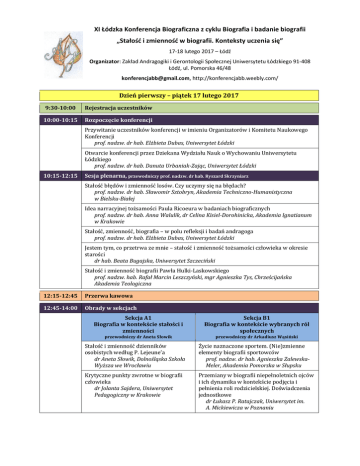 XI Łódzka Konferencja Biograficzna z cyklu Biografia i badanie biografii „Stałość i zmienność w biografii. Konteksty uczenia się” 17-18 lutego 2017 – Łódź Organizator: Zakład Andragogiki i Gerontologii Społecznej Uniwersytetu Łódzkiego 91-408 Łódź, ul. Pomorska 46/48 [email protected], http://konferencjabb.weebly.com/ Dzień pierwszy – piątek 17 lutego 2017 9:30-10:00 Rejestracja uczestników 10:00-10:15 Rozpoczęcie konferencji Przywitanie uczestników konferencji w imieniu Organizatorów i Komitetu Naukowego Konferencji prof. nadzw. dr hab. Elżbieta Dubas, Uniwersytet Łódzki Otwarcie konferencji przez Dziekana Wydziału Nauk o Wychowaniu Uniwersytetu Łódzkiego prof. nadzw. dr hab. Danuta Urbaniak-Zając, Uniwersytet Łódzki 10:15-12:15 Sesja plenarna, przewodniczy prof. nadzw. dr hab. Ryszard Skrzyniarz Stałość błędów i zmienność losów. Czy uczymy się na błędach? prof. nadzw. dr hab. Sławomir Sztobryn, Akademia Techniczno-Humanistyczna w Bielsku-Białej Idea narracyjnej tożsamości Paula Ricoeura w badaniach biograficznych prof. nadzw. dr hab. Anna Walulik, dr Celina Kisiel-Dorohinicka, Akademia Ignatianum w Krakowie Stałość, zmienność, biografia – w polu refleksji i badań andragoga prof. nadzw. dr hab. Elżbieta Dubas, Uniwersytet Łódzki Jestem tym, co przetrwa ze mnie – stałość i zmienność tożsamości człowieka w okresie starości dr hab. Beata Bugajska, Uniwersytet Szczeciński Stałość i zmienność biografii Pawła Hulki-Laskowskiego prof. nadzw. hab. Rafał Marcin Leszczyński, mgr Agnieszka Tys, Chrześcijańska Akademia Teologiczna 12:15-12:45 Przerwa kawowa 12:45-14:00 Obrady w sekcjach Sekcja A1 Biografia w kontekście stałości i zmienności Sekcja B1 Biografia w kontekście wybranych ról społecznych przewodniczy dr Aneta Słowik przewodniczy dr Arkadiusz Wąsiński Stałość i zmienność dzienników osobistych według P. Lejeune’a dr Aneta Słowik, Dolnośląska Szkoła Wyższa we Wrocławiu Życie naznaczone sportem. (Nie)zmienne elementy biografii sportowców prof. nadzw. dr hab. Agnieszka ZalewskaMeler, Akademia Pomorska w Słupsku Krytyczne punkty zwrotne w biografii człowieka dr Jolanta Sajdera, Uniwersytet Pedagogiczny w Krakowie Przemiany w biografii niepełnoletnich ojców i ich dynamika w kontekście podjęcia i pełnienia roli rodzicielskiej. Doświadczenia jednostkowe dr Łukasz P. Ratajczak, Uniwersytet im. A. Mickiewicza w Poznaniu Zmienność jako stałość w kobiecych projektach życiowych dr Monika Modrzejewska, dr Aleksandra Chmielińska Uniwersytet Łódzki Stałość i zmienność w karierach edukacyjnozawodowych menedżerów dr Joanna Szłapińska, Uniwersytet im. A. Mickiewicza w Poznaniu Doświadczanie stałości i zmienności w biografiach osób przymusowo migrujących dr Jolanta Kluba, Ośrodek „Pamięć i Przyszłość” Biografia jednostki warunkowana przemianami w strukturze społecznej dr Małgorzata Kutyła, Akademia Ignatianum w Krakowie Ścieżki karier adeptów uczelni medycznych Polsce w świetle badań losów zawodowych absolwentów mgr Jakub Sokolnicki, Uniwersytet Warszawski 14:00-15:30 Przerwa obiadowa 15:30-17:30 Obrady w sekcjach Sekcja A2 Biografia w kontekście interdyscyplinarnym i metodologicznym przewodniczy dr Marcin Muszyński Sekcja B2 Biografia w kontekście uczenia się, pedagogiki specjalnej i resocjalizacyjnej przewodniczy dr Anna Gutowska Biografistyka historyczna. Człowiek na tle epoki czy epoka przez pryzmat człowieka? mgr Marcin Janakowski, Uniwersytet M. Curie-Skłodowskiej w Lublinie Uczenie się jako terapia witalna osób przestępczych w warunkach karnych izolacyjnych (na podstawie analizy zmienności w biografii skazanego) prof. nadzw. dr hab. Barbara TorońFórmanek, Uniwersytet Zielonogórski Od skandalu do wiedzy i mądrości. O podmiotowości i relacji między autorem a badanym w biografii antropologicznonaukowej mgr Paula Wełyczko, Uniwersytet Wrocławski Kształtowanie siebie i swojego życia a uczenie się dorosłych w perspektywie stałości i zmiany dr Kamila Lasocińska, Akademia Humanistyczno Ekonomiczna w Łodzi Nie ma antropologii bez biografii. Opowieści o życiu jako stała i zmienna cecha metodologiczna dyscypliny mgr Paula Wełyczko, Uniwersytet Wrocławski Uczenie się buntownika na przykładzie narracji „…to jest jedyny sposób, kiedy lud ma możliwość bycia usłyszanym, to znaczy poprzez manifestacje” mgr Przemysław Szczygieł, Uniwersytet Gdański Dialog transcendentalny w narracji o codzienności Iwona Pasławska-Smęder, Akademia Ignatianum Uczestnictwo w projekcie jako punkt zwrotny – niezwrotny mgr Agnieszka Kowalska, Uniwersytet Warszawski Zmiana jako stały element biografii. Perspektywa pytania inicjującego zmianę mgr Monika Chmielecka, Uniwersytet Łódzki Psychoterapia dorosłych dzieci alkoholików jako doświadczenie uczenia się – komunikat z badań biograficznych mgr Paweł Seroka, Uniwersytet Gdański Historie opowiadane – wywiad narracyjny w perspektywie teoretycznej mgr Karolina Śmiłowska, Uniwersytet Wrocławski Niepełnosprawność intelektualna a zdolność konstruowania autonarracji – szkice teoretyczne mgr Magdalena Bartniczak, Uniwersytet Gdański 18:00 Biografia człowieka i obraz. Rozważania o sztuce fotografii i kontekstach dr Janusz Krysztofik, Instytut Zarządzania Wiedzą, s. mgr Adria Mariola Bach, Publiczne Przedszkole Sióstr Nazaretanek w Krakowie Edukacja – reintegracja czy dezintegracja wśród osadzonych mężczyzn w jednostkach penitencjarnych Anna Rubczewska, Uniwersytet Zielonogórski „Cementowanie czasu” jako zabieg na żywym organizmie egzystencji mgr Paweł Czynszak, Uniwersytet Gdański O potrzebie nagłej przemiany. Jak elementy rynku SHAM wpływają na uczestników kursów z zakresu rozwoju osobistego dr Monika Gromadzka, Uniwersytet Warszawski Kolacja XI Łódzka Konferencja Biograficzna z cyklu Biografia i badanie biografii „Stałość i