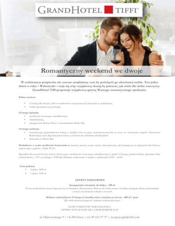 Romantyczny weekend we dwoje W codziennym pośpiechu nie zawsze znajdujemy czas by poświęcić go ukochanej osobie. Ten jeden dzień w roku – Walentynki – staje się więc wyjątkową okazją by pokazać, jak wiele dla siebie znaczymy. GrandHotel Tiffi proponuje wyjątkową oprawę Waszego romantycznego spotkania. Pakiet zawiera: 2 noclegi dla dwóch osób w komfortowo wyposażonych pokojach ze śniadaniem, słodki upominek na powitanie, 12 lutego (piątek): możliwość wczesnego zameldowania, obiadokolację, energetyczne Before Party w marokańskim Shisha Bar, 13 lutego (sobota): romantyczną, pięciodaniową kolację z butelką wina na parę, nastrojową muzyką na żywo (w wykonaniu zespołu Akustyczna Radiostacja) oraz degustacyjnym menu, w którym nie zabraknie afrodyzjaków dyskotekę w Shisha Bar. Dodatkowo w cenie możliwość korzystania z: basenu, jacuzzi, sauny suchej, łaźni parowej, sali treningowej ze sprzętem Life Fitness, zajęcia jogi z joginem z Indii, Wi-Fi. Specjalnie dla naszych Gości, którzy skorzystają z możliwości wczesnego zameldowania w piątek 12 lutego, podarowaliśmy specjalny rabat walentynkowy, -15% na zabiegi w Tiffi Spa Dharma, realizowane w piątek w godzinach 10:00 – 16:00. Cena pakietu: 2 doby: 1499 zł 1 doba: 1199 zł OFERTY DODATKOWE Szampańskie śniadanie do łóżka – 499 zł W ten weekend nie musisz śpieszyć się na śniadanie. Przyniesiemy Wam je do łóżka razem z butelką szampana Moët, truskawkami i świeżo wyciskanym sokiem z owoców. Kolacja walentynkowa 13 lutego (z butelką wina i muzyką na żywo) – 480 zł / para (dla osób niekorzystających z pakietu walentynkowego) ILOŚĆ PAKIETÓW OGRANICZONA OFERTA WYŁĄCZNIE DLA OSÓB DOROSŁYCH ul. Dąbrowskiego 9 | 14-200 Iława | tel. 89 651 97 97 | [email protected]