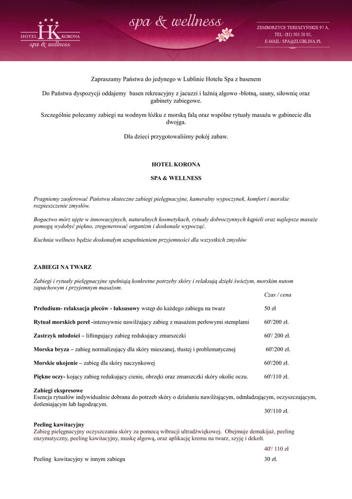 Zapraszamy Państwa do jedynego w Lublinie Hotelu Spa z basenem Do Państwa dyspozycji oddajemy basen rekreacyjny z jacuzzi i łaźnią algowo -błotną, sauny, siłownię oraz gabinety zabiegowe. Szczególnie polecamy zabiegi na wodnym łóżku z morską falą oraz wspólne rytuały masażu w gabinecie dla dwojga. Dla dzieci przygotowaliśmy pokój zabaw. HOTEL KORONA SPA & WELLNESS Pragniemy zaoferować Państwu skuteczne zabiegi pielęgnacyjne, kameralny wypoczynek, komfort i morskie rozpieszczenie zmysłów. Bogactwo mórz ujęte w innowacyjnych, naturalnych kosmetykach, rytuały dobroczynnych kąpieli oraz najlepsze masaże pomogą wydobyć piękno, zregenerować organizm i doskonale wypocząć. Kuchnia wellness będzie doskonałym uzupełnieniem przyjemności dla wszystkich zmysłów ZABIEGI NA TWARZ Zabiegi i rytuały pielęgnacyjne spełniają konkretne potrzeby skóry i relaksują dzięki świeżym, morskim nutom zapachowym i przyjemnym masażom. Czas / cena Preludium- relaksacja pleców - luksusowy wstęp do każdego zabiegu na twarz 50 zł Rytuał morskich pereł -intensywnie nawilżający zabieg z masażem perłowymi stemplami 60'/200 zł. Zastrzyk młodości – liftingujący zabieg redukujący zmarszczki 60'/ 200 zł. Morska bryza – zabieg normalizujący dla skóry mieszanej, tłustej i problematycznej 60'/200 zł. Morskie ukojenie – zabieg dla skóry naczynkowej 60'/200 zł. Piękne oczy- kojący zabieg redukujący cienie, obrzęki oraz zmarszczki skóry okolic oczu. 60'/110 zł. Zabiegi ekspresowe Esencja rytuałów indywidualnie dobrana do potrzeb skóry o działaniu nawilżającym, odmładzającym, oczyszczającym, dotleniającym lub łagodzącym. 30'/110 zł. Peeling kawitacyjny Zabieg pielęgnacyjny oczyszczania skóry za pomocą wibracji ultradźwiękowej. Obejmuje demakijaż, peeling enzymatyczny, peeling kawitacyjny, maskę algową, oraz aplikację kremu na twarz, szyję i dekolt. 40'/ 110 zł Peeling kawitacyjny w innym zabiegu 30 zł. Bio- mega – dermabrazja – abrazja wodna. Nowatorska metoda eliminacji naskórka, poprzez wilgotną abrazję. Zabieg z bio mega dermabrazją doskonale odświeża, wygładza i uelastycznia skórę. Znacznie spłyca zmarszczki, zmniejsza pory, łojotok, usuwa zaskórniki oraz przebarwienia powstałe w wyniku działania promieni słonecznych. 40'/ 180 zł. Bio-mega -dermabrazja w wybranym zabiegu pielęgnacyjnym cena: 50 zł. ZABIEGI NA CIAŁO Cenne właściwości wody morskiej, alg i roślin nadmorskich, w połączeniu ze szczególnymi technikami masażu w przyjemny i skuteczny sposób redukują problemy i niedoskonałości skóry. Wszystkie zabiegi rozpoczynają się odprężającą relaksacją, która rozluźnia spięte mięśnie, redukuje objawy zmęczenia i przenosi umysł daleko od codziennych trosk… relaksacją stóp - dodatek do zabiegów na ciało. Nawilżający masaż stóp i okład z musującej maski 50 zł. Zero cellulitu - intensywna formuła - zabieg modelujący sylwetkę o silnym działaniu antycellulitowym. 75'/250 zł. Morski rytuał holistyczny – z masażem solno - lawendowym stemplami Rytuał z zabiegiem na twarz 60'/ 220 zł. 75'/300 zł Morskie maski – rytuał owijania ciała maskami o działaniu detoksykującym, remineralizującym lub wyszczuplającym 60'/200 zł. Skarb oceanów - połączenie silnie działających morskich składników aktywnych oraz specjalnej techniki masażu zainspirowanej drenażem limfatycznym o działaniu antycellulitowym. 60'/190 zł. Doskonałe ujędrnienie – dla kobiet po okresie ciąży lub osób stosujących diety odchudzające 60'/ 180 zł. Męski relaks- Zabieg obejmuje peeling pleców, aplikację detoksykującej maski błotnej oraz masaż placów rozluźniający spięte mięśnie przy użyciu odżywczego balsamu lub oleju. 40'/150 zł. Wyrzeźbione ciało Spektakularny zabieg modelujący. Wyszczupla i rzeźbi sylwetkę, dzięki zastosowaniu specjalistycznej kąpieli i następującego po niej masażu opartego na technikach modelujących. Zapobiega powstawaniu cellulitu. 75 '/ Lekkie nogi Zabieg piękności na nogi, który niweluje uczucie ciężkości. Wzmacnia naczynka, odświeża i daje nogom uczucie lekkości. 40'/ Wodne rytuały Zanurzenie w świat morskich kosmetyków. Zabiegi, których sercem jest kąpiel o działaniu energetyzującym lub wyszczuplającym. Dzięki pozostałym etapom ciało jest wygładzone, skóra nawilżona i miękka w dotyku. 60'/ Satynowe ciało - Relaksujący zabieg peelingujący z kryształkami soli morskiej. 40'/120 zł. KĄPIELE Odprężający hydromasaż i dobroczynne działanie preparatów pielęgnacyjnych oraz kojąca muzyka i przyjemny aromat olejków eterycznych zapewnią relaks, odstresowanie i korzystnie wpłyną na wygląd skóry a nawet wagę. Morska kąpiel z hydromasażem o działaniu wyszczuplającym lub remineralizującym Kąpiel winna o działaniu odmładzającym 30'/99 zł. 30'/99 zł. ŁAŹNIA ALGOWO - BŁOTNA Seans kąpieli w parowej z aplikacją kompozycji o działaniu peelingującym, remineralizującym i detoksykującym. Wspaniały seans łączący dobroczynne działanie sauny parowej, relaks nawet dla czterech osób i kosmetyczne działania glinek. 30'/50 zł/ osoba MASAŻE KLASYCZNY Masaż pleców SYNCHRONICZNY -Masaż wykonywany przez dwóch terapeutów. MASAŻ DLA PRZYSZŁYCH MAM *Prosimy o okazanie zaświadczenia lekarskiego o braku przeciwwskazań do masażu. 60'/110 zł 30'/ 70 zł. 60'/ 240 zł 60'/ 100 zł MASAŻE RELAKSUJĄCE MUSZLE LAVA SHELLS - aromatyczny masaż samorozgrzewającymi się muszlami Masaż pleców 90'/180 45'/100 GORĄCE KAMIENIE Masaż pleców 90'/150 zł 45'/ 80 zł CZEKOLADOWE DOZNANIA – masaż jadalną, gorącą czekoladą Masaż pleców Peeling ciała przed masażem Owijanie ciała po masażu 60'/160 zł 30'/ 90 zł. 15'/30 zł 15'/30 zł. MIODOWY RELAKS – masaż ciepłym miodem i masłem kakaowy Masaż pleców Peeling ciała przed masażem Owijanie ciała po masażu 60'/150 zł. 30'/ 