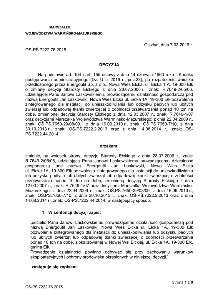 MARSZAŁEK WOJEWÓDZTWA WARMIŃSKO-MAZURSKIEGO Olsztyn, dnia 7.03.2016 r. OŚ-PŚ.7222.76.2015 DECYZJA Na podstawie art. 104 i art. 155 ustawy z dnia 14 czerwca 1960 roku - Kodeks postępowania administracyjnego (Dz. U. z 2016 r., poz.23), po rozpatrzeniu wniosku przedłożonego przez Energoutil Sp. z o.o., Nowa Wieś Ełcka, ul. Ełcka 1 A, 19-300 Ełk o zmianę decyzji Starosty Ełckiego z dnia 28.07.2006 r., znak: R.7649-2/05/06, udzielającej Panu Janowi Laskowskiemu, prowadzącemu działalność gospodarczą pod nazwą Energoutil Jan Laskowski, Nowa Wieś Ełcka ul. Ełcka 1A, 19-300 Ełk pozwolenia zintegrowanego dla instalacji do unieszkodliwiania lub odzysku padłych lub ubitych zwierząt lub odpadowej tkanki zwierzęcej o zdolności przetwarzania ponad 10 ton na dobę, zmienionej decyzją Starosty Ełckiego z dnia 12.03.2007 r., znak: R.7649-1/07 oraz decyzjami Marszałka Województwa Warmińsko-Mazurskiego: z dnia 22.04.2009 r., znak: OŚ.PŚ.7650-29/08/09, z dnia 16.09.2010 r., znak: OŚ.PŚ.7650-7/10, z dnia 30.10.2013 r., znak: OŚ-PŚ.7222.2.2013 oraz z dnia 14.08.2014 r., znak: OŚPŚ.7222.44.2014 orzekam: zmienić, na wniosek strony, decyzję Starosty Ełckiego z dnia 28.07.2006 r., znak: R.7649-2/05/06, udzielającą Panu Janowi Laskowskiemu prowadzącemu działalność gospodarczą pod nazwą Energoutil Jan Laskowski, Nowa Wieś Ełcka ul. Ełcka 1A, 19-300 Ełk pozwolenia zintegrowanego dla instalacji do unieszkodliwiania lub odzysku padłych lub ubitych zwierząt lub odpadowej tkanki zwierzęcej o zdolności przetwarzania ponad 10 ton na dobę, zmienioną decyzją Starosty Ełckiego z dnia 12.03.2007 r., znak: R.7649-1/07 oraz decyzjami Marszałka Województwa WarmińskoMazurskiego: z dnia 22.04.2009 r., znak: OŚ.PŚ.7650-29/08/09, z dnia 16.09.2010 r., znak: OŚ.PŚ.7650-7/10, z dnia 30.10.2013 r., znak: OŚ-PŚ.7222.2.2013 oraz z dnia 14.08.2014 r., znak: OS-PŚ.7222.44.2014, w następujący sposób: 1. W sentencji decyzji zapis: „udzielić Panu Janowi Laskowskiemu prowadzącemu działalność gospodarczą pod nazwą Energoutil Jan Laskowski, Nowa Wieś Ełcka ul. Ełcka 1A, 19-300 Ełk pozwolenia zintegrowanego dla instalacji do unieszkodliwiania lub odzysku padłych lub ubitych zwierząt lub odpadowej tkanki zwierzęcej o zdolności przetwarzania ponad 10 ton na dobę, zlokalizowanej w Nowej Wsi Ełckiej, ul. Ełcka 1A, 19-300 Ełk, gmina Ełk. Prowadzenie działalności powinno odbywać się przy zachowaniu warunków eksploatacyjnych i ochrony środowiska określonych w niniejszej decyzji.” zastępuje się zapisem: Strona 1 z 9 OŚ-PŚ.7222.76.2015 „udzielić Energoutil Sp. z o.o., Nowa Wieś Ełcka, ul. Ełcka 1A, 19-300 Ełk, Regon: 360821940, NIP: 8481862793, pozwolenia zintegrowanego dla instalacji do unieszkodliwiania lub odzysku padłych lub ubitych zwierząt lub odpadowej tkanki zwierzęcej o zdolności przetwarzania ponad 10 ton na dobę, zlokalizowanej w Nowej Wsi Ełckiej, ul. Ełcka 1A, 19-300 Ełk, gmina Ełk. Prowadzenie działalności powinno odbywać się przy zachowaniu warunków eksploatacyjnych i ochrony środowiska określonych w niniejszej decyzji.” 2. W treści decyzji, w każdym miejscu decyzji, w którym pojawia się zapis: „Energoutil Jan Laskowski, Nowa Wieś Ełcka, ul. Ełcka 1A, 19-300 Ełk” zastępuje się go zapisem: „Energoutil Sp. z o.o., Nowa Wieś Ełcka, ul. Ełcka 1A, 19-300 Ełk” 3. W Rozdziale I, w pkt 1 decyzji zapis pierwszego akapitu w brzmieniu: „Przedmiotowa instalacja prowadzona jest przez Pana Jana Laskowskiego w Energoutil Jan Laskowski w Nowej Wsi Ełckiej, ul. Ełcka 1A, 19-300 Ełk, na działce o numerze ewidencyjnym 326, o powierzchni 5,03 ha.” zastępuje się zapisem: „Przedmiotowa instalacja prowadzona jest przez Energoutil Sp. z o.o. w Nowej Wsi Ełckiej, ul. Ełcka 1A, 19-300 Ełk, na działce o nr ew. 326/2, obręb 31 Nowa Wieś Ełcka, o powierzchni 4,2198 ha i działce o nr ew. 326/1, obręb 31 Nowa Wieś Ełcka, o powierzchni 0,8127 ha.” 4. W Rozdziale I, w pkt 3, ppkt 3.2.2 otrzymuje brzmienie: 3.2.2. Zużycie surowców i materiałów pomocniczych zawierających substancje niebezpieczne Lp. 1. 2. 3. 4. Wyszczególnienie RAPICID JKM Soda kaustyczna Virkon Zużycie roczne Zużycie na podstawie dawek podanych przez producentów oraz doświadczeń własnych 5. W Rozdziale I, w pkt 3, ppkt 3.5 otrzymuje brzmienie: 3.5. Woda Lp. Wyszczególnienie 1. Zużycie wody ogółem: w tym na cele technologiczne Zużycie roczne 44 829 m3/rok 44 000 m3/rok Strona 2 z 9 OŚ-PŚ.7222.76.2015 6. W Rozdziale II, w pkt 1, ppkt 1.3. otrzymuje brzmienie: 1.3. Sposób redukcji zanieczyszczeń 1. Dwie linie do produkcji mączki mięsno-kostnej posiadają wentylację mechaniczną odprowadzającą zanieczyszczone powietrze na cztery złoża biofiltracyjne o skuteczności redukcji odorów nie niższej niż 97,2 %. Powietrze trafiające na złoże E6 i E7 przechodzi przez płuczkę – oczyszczacz powietrza. 2. Kocioł parowy posiada system odpylania składający się z odpylacza wstępnego ZM – 4x400x2 i baterii cyklonów CE-4x630/0.4. 7. W Rozdziale II, w pkt 2, ppkt 2.2 otrzymuje brzmienie: 2.2. Parametry źródeł hałasu do środowiska Lp. 1. 2. 3. 4. 5. 6. 7. 8. 9. 10. 11. 12. 13. 14. 15 16. 17. Instalacja/źródło kondensator powietrzny typu A5 Monts spol wentylator promieniowy typ WP wyciągu spalin kotła parowego ER-125 wentylator osiowy typ K450/8-8/30/L/PPG wentylator promieniowy typ CAL-355/2T wentylator promieniowy typ WP 550/930 RD0 wentylator promieniowy typ WP 550/930 RD0 skraplacz natryskowowyparny hala główna linii produkcji mączek paszowych budynek kotłowni budynek warsztatu mechanicznego hala pakowania i magazynowania wyrobu gotowego Urządzenie/ lokalizacja hala produkcji mączki mięsnokostnej Klimatyzator nr 1 typ ELECTRA WNG 30, klimatyzacja muldy załadowczej kondensator powietrzny VKM 3 wentylator promieniowy typ WP Płuczka z wentylatorem promieniowym RVI budynek biurowy Teren