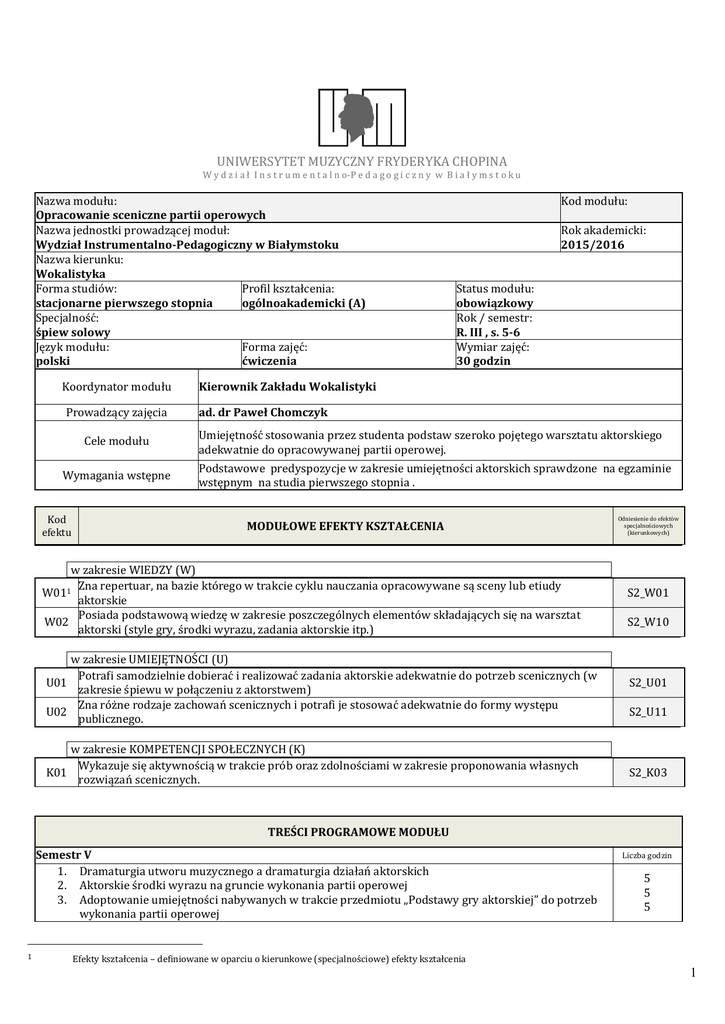 UNIWERSYTET MUZYCZNY FRYDERYKA CHOPINA W y d z i a ł I n s t r u m e n t a l n o-P e d a g o g i c z n y w B i a ł y m s t o k u Nazwa modułu: Opracowanie sceniczne partii operowych Nazwa jednostki prowadzącej moduł: Wydział Instrumentalno-Pedagogiczny w Białymstoku Nazwa kierunku: Wokalistyka Forma studiów: Profil kształcenia: stacjonarne pierwszego stopnia ogólnoakademicki (A) Specjalność: śpiew solowy Język modułu: Forma zajęć: polski ćwiczenia Koordynator modułu Prowadzący zajęcia Cele modułu Wymagania wstępne Kod efektu Kod modułu: Rok akademicki: 2015/2016 Status modułu: obowiązkowy Rok / semestr: R. III , s. 5-6 Wymiar zajęć: 30 godzin Kierownik Zakładu Wokalistyki ad. dr Paweł Chomczyk Umiejętność stosowania przez studenta podstaw szeroko pojętego warsztatu aktorskiego adekwatnie do opracowywanej partii operowej. Podstawowe predyspozycje w zakresie umiejętności aktorskich sprawdzone na egzaminie wstępnym na studia pierwszego stopnia . MODUŁOWE EFEKTY KSZTAŁCENIA w zakresie WIEDZY (W) Zna repertuar, na bazie którego w trakcie cyklu nauczania opracowywane są sceny lub etiudy W011 aktorskie Posiada podstawową wiedzę w zakresie poszczególnych elementów składających się na warsztat W02 aktorski (style gry, środki wyrazu, zadania aktorskie itp.) w zakresie UMIEJĘTNOŚCI (U) Potrafi samodzielnie dobierać i realizować zadania aktorskie adekwatnie do potrzeb scenicznych (w U01 zakresie śpiewu w połączeniu z aktorstwem) Zna różne rodzaje zachowań scenicznych i potrafi je stosować adekwatnie do formy występu U02 publicznego. w zakresie KOMPETENCJI SPOŁECZNYCH (K) Wykazuje się aktywnością w trakcie prób oraz zdolnościami w zakresie proponowania własnych K01 rozwiązań scenicznych. Odniesienie do efektów specjalnościowych (kierunkowych) S2_W01 S2_W10 S2_U01 S2_U11 S2_K03 TREŚCI PROGRAMOWE MODUŁU Semestr V 1. Dramaturgia utworu muzycznego a dramaturgia działań aktorskich 2. Aktorskie środki wyrazu na gruncie wykonania partii operowej 3. Adoptowanie umiejętności nabywanych w trakcie przedmiotu „Podstawy gry aktorskiej” do potrzeb wykonania partii operowej 1 Liczba godzin 5 5 5 Efekty kształcenia – definiowane w oparciu o kierunkowe (specjalnościowe) efekty kształcenia 1 Semestr VI 4. Dramaturgia utworu muzycznego a dramaturgia działań aktorskich 5. Aktorskie środki wyrazu na gruncie wykonania partii operowej 6. Adoptowanie umiejętności nabywanych w trakcie przedmiotu „Podstawy gry aktorskiej” do potrzeb wykonania partii operowej Treści programowe wzajemnie się przenikają, większość z nich obecna jest na każdym etapie kształcenia. Liczba godzin 5 5 5 Metody kształcenia 1. 2. 3. praca indywidualna praca w grupach wszystkie inne metody stosowane przez prowadzącego moduł Weryfikacja efektów kształcenia Metody weryfikacji Nr efektu2 1. egzamin U01 2. 3. przesłuchanie wszystkie inne metody stosowane przez prowadzącego moduł W02 W01, U01, U02, K01 Korelacja efektów kształcenia z treściami i metodami kształcenia oraz metodami ich weryfikacji 3 Nr efektu kształcenia W01 W02 U01 U02 K01 Treści kształcenia 1-6 1-6 1-6 2,5 1-6 Metody kształcenia 1-3 1-3 1-3 1-3 1-3 Metody weryfikacji 1-3 1-3 1-3 1-3 1-3 Forma zaliczenia Semestr 5 – zaliczenie, semestr 6 – egzamin Zaliczenie przedmiotu uwarunkowane jest uczęszczaniem na zajęcia – kontrola obecności, oraz osiągnięciem wszystkich założonych efektów kształcenia (w minimalnym akceptowalnym stopniu – w wysokości >50%). Każdy semestr kończy się pokazem opracowanego materiału. Literatura podstawowa M. Czechow O technice aktora, Wydawnictwo Arche 2000 S. Book Podręcznik dla aktorów. Technika Improwizacji dla profesjonalnych aktorów filmowych, telewizyjnych i teatralnych. Wydawnictwo Wojciech Marzec 2006 Literatura uzupełniająca V. Spolin Improvisation for the Theater, Northwestern University Press 1999 Kalkulacja nakładu pracy studenta potrzebnej do osiągnięcia zakładanych efektów kształcenia (w godz.) Zajęcia dydaktyczne – godziny kontaktowe Przygotowywanie się do zajęć Praca z literaturą Konsultacje Przygotowywanie się do prezentacji/koncertu Przygotowywanie się do egzaminu, zaliczenia Inne 30 0 0 0 0 0 0 2 odnosimy się do uprzednio sformułowanych przez nas efektów kształcenia należy podać numer efektu kształcenia, numery odpowiednich zakresów treści kształcenia oraz przyporządkować im metody kształcenia i weryfikacji (podać numery) 3 2 30 1 Łączny nakład pracy studenta w godz. Liczba punktów ECTS Rok Semestr Punkty ECTS Ilość godzin w tygodniu Rodzaj zaliczenia I I – – – II II – – – III – – – III IV – – – V 0,5 1 zaliczenie VI 0,5 1 egzamin Możliwości kariery zawodowej Absolwent studiów pierwszego stopnia przygotowany jest do podjęcia studiów drugiego stopnia. Absolwent może realizować role muzyczne w teatrach. 3