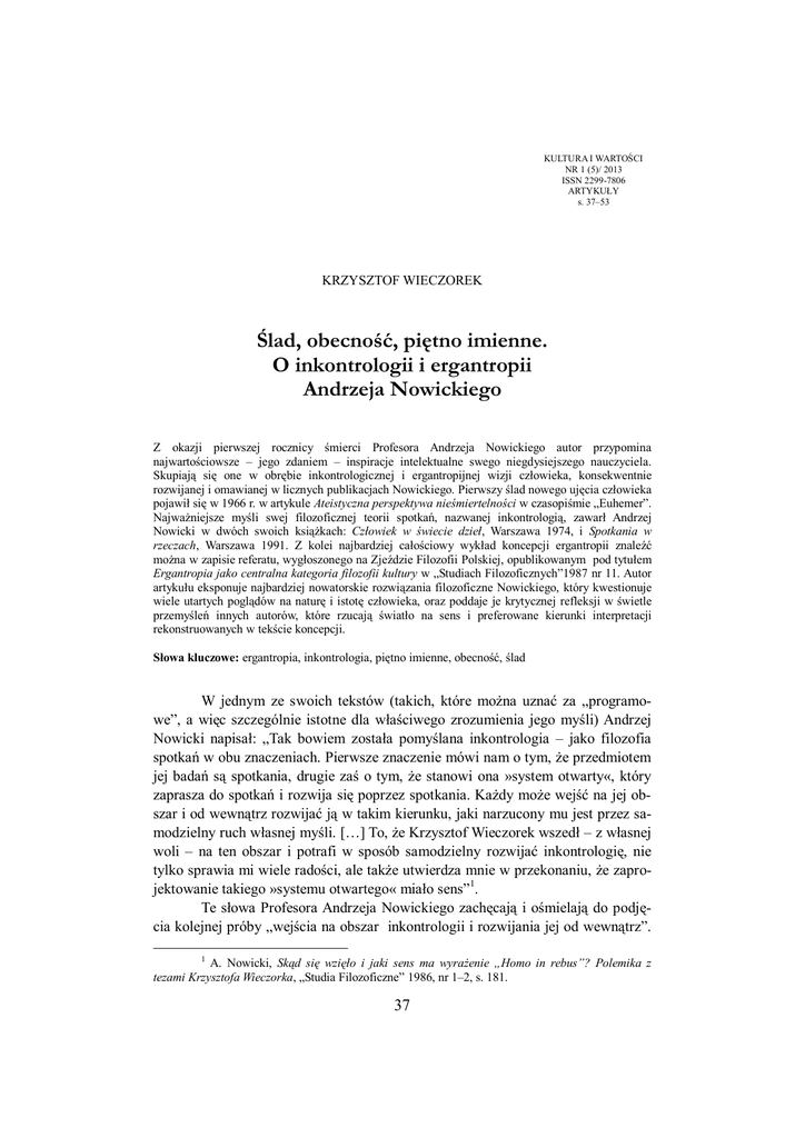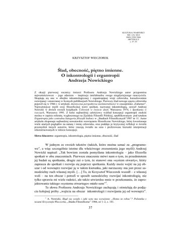KULTURA I WARTOŚCI NR 1 (5)/ 2013 ISSN 2299-7806 ARTYKUŁY s. 37–53 KRZYSZTOF WIECZOREK Ślad, obecność, piętno imienne. O inkontrologii i ergantropii Andrzeja Nowickiego Z okazji pierwszej rocznicy śmierci Profesora Andrzeja Nowickiego autor przypomina najwartościowsze – jego zdaniem – inspiracje intelektualne swego niegdysiejszego nauczyciela. Skupiają się one w obrębie inkontrologicznej i ergantropijnej wizji człowieka, konsekwentnie rozwijanej i omawianej w licznych publikacjach Nowickiego. Pierwszy ślad nowego ujęcia człowieka pojawił się w 1966 r. w artykule Ateistyczna perspektywa nieśmiertelności w czasopiśmie „Euhemer”. Najważniejsze myśli swej filozoficznej teorii spotkań, nazwanej inkontrologią, zawarł Andrzej Nowicki w dwóch swoich książkach: Człowiek w świecie dzieł, Warszawa 1974, i Spotkania w rzeczach, Warszawa 1991. Z kolei najbardziej całościowy wykład koncepcji ergantropii znaleźć można w zapisie referatu, wygłoszonego na Zjeździe Filozofii Polskiej, opublikowanym pod tytułem Ergantropia jako centralna kategoria filozofii kultury w „Studiach Filozoficznych”1987 nr 11. Autor artykułu eksponuje najbardziej nowatorskie rozwiązania filozoficzne Nowickiego, który kwestionuje wiele utartych poglądów na naturę i istotę człowieka, oraz poddaje je krytycznej refleksji w świetle przemyśleń innych autorów, które rzucają światło na sens i preferowane kierunki interpretacji rekonstruowanych w tekście koncepcji. Słowa kluczowe: ergantropia, inkontrologia, piętno imienne, obecność, ślad W jednym ze swoich tekstów (takich, które można uznać za „programowe”, a więc szczególnie istotne dla właściwego zrozumienia jego myśli) Andrzej Nowicki napisał: „Tak bowiem została pomyślana inkontrologia – jako filozofia spotkań w obu znaczeniach. Pierwsze znaczenie mówi nam o tym, że przedmiotem jej badań są spotkania, drugie zaś o tym, że stanowi ona »system otwarty«, który zaprasza do spotkań i rozwija się poprzez spotkania. Każdy może wejść na jej obszar i od wewnątrz rozwijać ją w takim kierunku, jaki narzucony mu jest przez samodzielny ruch własnej myśli. […] To, że Krzysztof Wieczorek wszedł – z własnej woli – na ten obszar i potrafi w sposób samodzielny rozwijać inkontrologię, nie tylko sprawia mi wiele radości, ale także utwierdza mnie w przekonaniu, że zaprojektowanie takiego »systemu otwartego« miało sens”1. Te słowa Profesora Andrzeja Nowickiego zachęcają i ośmielają do podjęcia kolejnej próby „wejścia na obszar inkontrologii i rozwijania jej od wewnątrz”. 1 A. Nowicki, Skąd się wzięło i jaki sens ma wyrażenie „Homo in rebus”? Polemika z tezami Krzysztofa Wieczorka, „Studia Filozoficzne” 1986, nr 1–2, s. 181. 37 KRZYSZTOF WIECZOREK – ŚLAD, OBECNOŚĆ, PIĘTNO IMIENNE... Taki właśnie – twórczy i otwarty na samodzielne modyfikacje, niekoniecznie ściśle zgodne z kierunkiem i stylem myślenia samego twórcy inkontrologii – sposób podejścia do spuścizny intelektualnej Profesora wydaje się, w świetle wyżej przytoczonej wypowiedzi, najbardziej właściwy. Andrzej Nowicki nie chciał być twórcą czy założycielem nowej szkoły filozoficznej, skrępowanej umysłową zależnością od jakichkolwiek dogmatycznie przyjętych przez Mistrza założeń. Nie zależało mu też na tym, by jego myśl, zakrzepła w gotowej i ukończonej postaci, stanowiła monumentalny pomnik osiągniętej (ale też skazanej na nieuchronne przemijanie, bo takie są prawa historii) wielkości. Jego uczniowie, przyjaciele i współpracownicy na obszarze filozoficznych dociekań wiedzą doskonale, że marzeniem Andrzeja Nowickiego było stać się „podmiotowym składnikiem osobowości” jak największej liczby osób, i poprzez tę niestandardową formę aktywnego uczestnictwa w dalszym tworzeniu wartościowych dóbr kultury istnieć nadal – jak wierzył – w sposób „najbardziej rzeczywisty”. Przekonanie to wyraził w następujących słowach: „Są oczywiście różne »sposoby istnienia«, ale tym »najbardziej rzeczywistym« jest istnienie wielocząstkowe, rozproszone w przestrzeni i czasie. […] Formuła homo in rebus oznacza bowiem wielocząstkową (polimeryczną), wieloprzestrzenną (politopiczną) i wieloczasową (polichroniczną) strukturę tożsamości jednostki ludzkiej […], a twórca naprawdę istnieje w setkach tysięcy egzemplarzy napisanych przez siebie książek, w milionach płyt, na których zostały nagrane wykonania jego utworów muzycznych i w różnych warstwach osobowości tych wszystkich ludzi, którzy spotkali się z jego myślami”2. Ta ostatnia forma istnienia – w przekonaniu autora cytowanych myśli – polega na zajmowaniu pozycji partnera wewnętrznego dialogu, który pełni niezastąpioną funkcję w procesie poszukiwania właściwych myśli oraz najbardziej odpowiedniej formy językowej, w jakiej podmiot myślenia decyduje się je wyrazić. Prawda bowiem rodzi się wyłącznie w spotkaniu i dialogu – w tej kwestii są zgodni wszyscy przedstawiciele filozofii spotkania, w tym również Andrzej Nowicki. Różne są natomiast opinie co do tego, kiedy rzeczywiście mamy do czynienia ze spotkaniem, kiedy zaledwie z jego oszukańczym pozorem3, a kiedy z sytuacją, która bywa nazywana – nieprecyzyjnie – monologiem wewnętrznym lub też – metaforycznie – „rozmową z sobą samym”. Na tle najczęściej przyjmowanych rozwiązań tej kwestii stanowisko A. Nowickiego wyróżnia się swą oryginalnością, której on sam jest głęboko świadom; pisze bowiem: „to jest właśnie ta »najbardziej własna« z moich myśli, która – w sposób radykalny – przeciwstawia się wszystkim dotychczasowym antropologiom filozoficznym. Bez względu bowiem na to, z czym utożsamiały one człowieka: z »duszą«, z »ciałem« czy z hylemorficzną kompozycją obu składników, zawsze za milczącą przesła