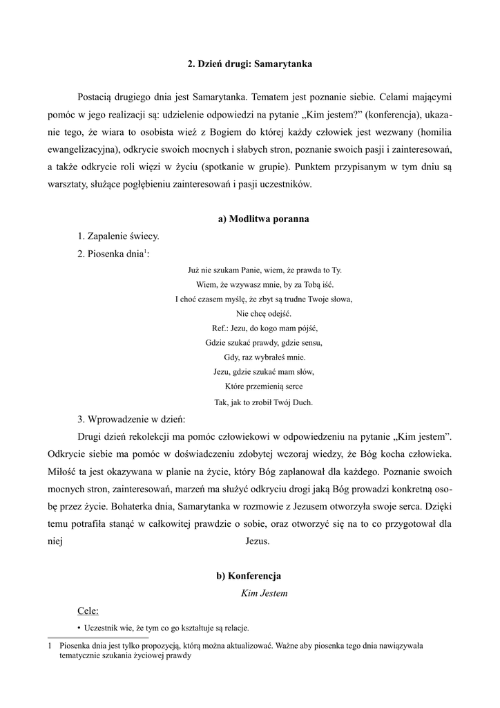 2. Dzień drugi: Samarytanka Postacią drugiego dnia jest Samarytanka. Tematem jest poznanie siebie. Celami mającymi pomóc w jego realizacji są: udzielenie odpowiedzi na pytanie „Kim jestem?” (konferencja), ukazanie tego, że wiara to osobista wieź z Bogiem do której każdy człowiek jest wezwany (homilia ewangelizacyjna), odkrycie swoich mocnych i słabych stron, poznanie swoich pasji i zainteresowań, a także odkrycie roli więzi w życiu (spotkanie w grupie). Punktem przypisanym w tym dniu są warsztaty, służące pogłębieniu zainteresowań i pasji uczestników. a) Modlitwa poranna 1. Zapalenie świecy. 2. Piosenka dnia1: Już nie szukam Panie, wiem, że prawda to Ty. Wiem, że wzywasz mnie, by za Tobą iść. I choć czasem myślę, że zbyt są trudne Twoje słowa, Nie chcę odejść. Ref.: Jezu, do kogo mam pójść, Gdzie szukać prawdy, gdzie sensu, Gdy, raz wybrałeś mnie. Jezu, gdzie szukać mam słów, Które przemienią serce Tak, jak to zrobił Twój Duch. 3. Wprowadzenie w dzień: Drugi dzień rekolekcji ma pomóc człowiekowi w odpowiedzeniu na pytanie „Kim jestem”. Odkrycie siebie ma pomóc w doświadczeniu zdobytej wczoraj wiedzy, że Bóg kocha człowieka. Miłość ta jest okazywana w planie na życie, który Bóg zaplanował dla każdego. Poznanie swoich mocnych stron, zainteresowań, marzeń ma służyć odkryciu drogi jaką Bóg prowadzi konkretną osobę przez życie. Bohaterka dnia, Samarytanka w rozmowie z Jezusem otworzyła swoje serca. Dzięki temu potrafiła stanąć w całkowitej prawdzie o sobie, oraz otworzyć się na to co przygotował dla niej Jezus. b) Konferencja Kim Jestem Cele: • Uczestnik wie, że tym co go kształtuje są relacje. 1 Piosenka dnia jest tylko propozycją, którą można aktualizować. Ważne aby piosenka tego dnia nawiązywała tematycznie szukania życiowej prawdy • Uczestnik dowiaduje się, że jest ukochanym przez Boga dzieckiem. • Uczestnik dowiaduje się, że na ziemi nic nie jest w stanie dać mu pełni szczęścia. Metody: wykład z elementami wizualnymi. Przebieg: 1. Ukazanie schematu nawiązania relacji. Wczorajszy dzień był dla nas czasem odkrywanie prawdziwego obrazu Boga. Boga, który daje nam się poznać jako Doskonała Miłość. Celem tych rekolekcji jest nawiązanie osobowej relacji z takim Bogiem. Aby nawiązać taką relację potrzebujemy trzech elementów: • Podmiot 1. • Podmiot 2. • Spojenie łączące dwa podmioty. Znamy już Pomiot 1 (Boga, który jest Miłością), dziś zatrzymamy się nad Podmiotem numer dwa, którym jest człowiek. Chcemy dziś odkryć siebie. Zatrzymać się nad pytaniem Kim jestem? 2. „Kim jestem?” Dla zrozumienia prawdy o sobie trzeba popatrzeć na siebie z dwóch stron. Możemy porównać siebie do monety. (w tym miejscu powinna nastąpić wizualizacja poprzez ukazanie uczestnikom monety) Z jednej strony widzimy „orła” a z drugiej „reszkę”. Oba wizerunki połączone są ze sobą tworzywem z którego moneta jest zrobiona. Tworzywem które nasz kształtuje i opisuje są relację w których trwamy, oraz te w których powinniśmy trwać aby istnieć. Na przykład na pytanie: Kim jestem? Mogę odpowiedzieć: jestem synem Zbyszka (mojego ojca), albo księdzem Mateuszem (ta odpowiedzi ukazuje moją relację z Kościołem). To relacja z Bogiem określa naszą tożsamość2. Z jednej strony (nasz „orzeł”) jesteśmy dla Boga dziećmi. W pierwszym liście św. Jana możemy przeczytać: „popatrzcie, jaką miłością obdarzył nas Ojciec: zostaliśmy nazwani dziećmi Bożymi i rzeczywiście nimi jesteśmy” (1J 3,1). Każdy z nas jest dzieckiem Boga. Dlatego warto abyście usłyszeli, że Bóg: • „akceptuje cię bezwarunkowo, • kocha cię ofiarnie, • doskonale cię rozumie, • stale jest z tobą”3. Każdy z nas jest jedyny w swoim rodzaju. Pomimo tego, że w historii ziemi było i będzie wielu ludzi, dla Boga każdy z nas jest unikatowy. Dla zrozumienie tej rzeczywistości warto popa2 3 J. MCDOWELL, Fundamenty wiary, s. 93. Tamże, s. 94. trzeć na śnieg i jeden płatek śniegu. Śniegu z nieba spada dużo, jednak każdy płatek, gdy przyjrzymy mu się pod mikroskopem jest inny. Ma swoją własną, niepowtarzalną strukturę 4. To co określa naszą wartość to fakt, że Bóg nas kocha. „Bóg nie kocha nas, ponieważ jesteśmy wartościowi; jesteśmy wartościowi, ponieważ On nas kocha5" Z drugiej strony (nasza „reszka”) to uznanie swojej niewystarczalności. Człowiek jest stworzeniem, które tutaj na ziemi nie może zostać w pełni zaspokojone. Dowodem tego jest fakt, że każdy z nas może wyobrazić sobie większe szczęście niż te, które jest jego doświadczeniem w tym momencie. Pełnie zaspokojenia naszych pragnień może dać nam tylko Bóg. Kiedy przyjrzymy się zdjęciu przedstawiającemu ludzkie serce (warto w tym miejscu ukazać uczestnikom obraz narządu serca, i zestawiać go z obrazkiem serca walentynkowego) zobaczymy, że brakuje w nim kawałka, aby był on podobny do tego serca którym wyrażamy naszą miłość. Możemy się zastanowić dlaczego tak jest. Jeden z mądrych ludzi stwierdził że, w momencie stworzenia ludzkiego serca Bogu tak bardzo się ono spodobało, że wziąć sobie jego kawałek. Reszta serca wraz z człowiekiem została posłana na ziemie. Dopóki serce nie będzie całe, ni będziemy w stanie nikogo w pełni pokochać. Dlatego tak ważne jest zwrócenie się ku Bogu, aby Jego obecność w naszym życiu połączyła brakujący element i abyśmy tym sposobem mogli żyć pełni życia6. Podsumowując: każdy z nas jest ukochanym dzieckiem Boga, które jednocześnie odczuwa w życiu pewnego rodzaju dyskomfort spowodowany tym, że nic na ziemi nie jest w stanie zapewnić nam pełni szczęścia. 3. Świadectwo animatora: „Odkrywanie swojej tożsamości”. c) Homilia ewangelizacyjna Cele: • Uczestnik wie, że Bóg chce wejść z nim w relacje przyjaźni. • Uczestnik wie, że wiara t