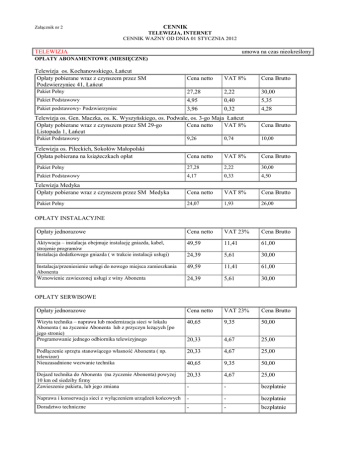 CENNIK Załącznik nr 2 TELEWIZJA, INTERNET CENNIK WAŻNY OD DNIA 01 STYCZNIA 2012 TELEWIZJA umowa na czas nieokreślony OPŁATY ABONAMENTOWE (MIESIĘCZNE) Telewizja os. Kochanowskiego, Łańcut Opłaty pobierane wraz z czynszem przez SM Podzwierzyniec 41, Łańcut Cena netto VAT 8% Cena Brutto Pakiet Pełny 27,28 2,22 30,00 Pakiet Podstawowy 4,95 0,40 5,35 Pakiet podstawowy- Podzwierzyniec 3,96 0,32 4,28 Telewizja os. Gen. Maczka, os. K. Wyszyńskiego, os. Podwale, os. 3-go Maja Łańcut Opłaty pobierane wraz z czynszem przez SM 29-go Cena netto VAT 8% Listopada 1, Łańcut Pakiet Podstawowy Cena Brutto 9,26 0,74 10,00 Cena netto VAT 8% Cena Brutto Pakiet Pełny 27,28 2,22 30,00 Pakiet Podstawowy 4,17 0,33 4,50 Cena netto VAT 8% Cena Brutto 24,07 1,93 26,00 Opłaty jednorazowe Cena netto VAT 23% Cena Brutto Aktywacja – instalacja obejmuje instalację gniazda, kabel, strojenie programów Instalacja dodatkowego gniazda ( w trakcie instalacji usługi) 49,59 11,41 61,00 24,39 5,61 30,00 Instalacja/przeniesienie usługi do nowego miejsca zamieszkania Abonenta Wznowienie zawieszonej usługi z winy Abonenta 49,59 11,41 61,00 24,39 5,61 30,00 Opłaty jednorazowe Cena netto VAT 23% Cena Brutto Wizyta technika – naprawa lub modernizacja sieci w lokalu Abonenta ( na życzenie Abonenta lub z przyczyn leżących [po jego stronie) Programowanie jednego odbiornika telewizyjnego 40,65 9,35 50,00 20,33 4,67 25,00 Podłączenie sprzętu stanowiącego własność Abonenta ( np. telewizor) Nieuzasadnione wezwanie technika 20,33 4,67 25,00 40,65 9,35 50,00 Dojazd technika do Abonenta (na życzenie Abonenta) powyżej 10 km od siedziby firmy Zawieszenie pakietu, lub jego zmiana 20,33 4,67 25,00 - - bezpłatnie Naprawa i konserwacja sieci z wyłączeniem urządzeń końcowych - - bezpłatnie Doradztwo techniczne - - bezpłatnie Telewizja os. Pileckich, Sokołów Małopolski Opłata pobierana na książeczkach opłat Telewizja Medyka Opłaty pobierane wraz z czynszem przez SM Medyka Pakiet Pełny OPŁATY INSTALACYJNE OPŁATY SERWISOWE INTERNET umowa na czas nieokreślony OPŁATY ABONAMENTOWE (MIESIĘCZNE) Internet Łańcut Okresem rozliczeniowym jest kwartał Cena netto VAT 23% Cena Brutto 6,54 35,00 8,41 45,00 5,61 30,00 Cena netto VAT 23% Cena Brutto 28,46 6,54 35,00 36,59 8,41 45,00 24,39 5,61 30,00 7,48 32,52 40,00 Cena netto VAT 23% Cena Brutto 1,00 0,23 1,23 49,59 11,41 61,00 100,00 23,00 123,00 100,00 23,00 123,00 49,59 11,41 61,00 Cena netto VAT 23% Cena Brutto Wizyta technika – naprawa lub modernizacja sieci w lokalu Abonenta ( na życzenie Abonenta lub z przyczyn leżących po jego stronie) Ponowne włączenie usługi, zawieszonej z winy Abonenta ( np. nieuregulowanie należnych opłat, nieprzestrzeganie postanowień regulaminu, itp.) Podłączenie sprzętu stanowiącego własność Abonenta (np. karta sieciowa) Nieuzasadnione wezwanie technika 40,65 9,35 50,00 24,39 5,61 30,00 20,33 4,61 25,00 40,65 9,35 50,00 Zawieszenie usługi stałego dostępu do Internetu 16,26 3,74 20,00 Konfiguracja urządzeń dodatkowych w domu Abonenta – Konfiguracja routera 24,39 5,61 30,00 Usługa Internet opcja do 2Mb 28,46 stały dostęp do sieci Internet z maksymalną szybkością do/od komputera do 2Mb/s / 1Mb/s bez limitu pobierania Usługa Internet opcja do 4Mb 36,59 stały dostęp do sieci Internet z maksymalną szybkością do/od komputera do 4Mb/s / 1600kbit/s bez limitu pobierania Usługa Internet opcja do 1Mb – ulga przysługując obecnym 24,39 Abonentom stały dostęp do sieci Internet z maksymalną szybkością do/od komputera do 1Mb/s / 512kb/s bez limitu pobierania Internet Sokołów Małopolski Okresem rozliczeniowym jest kwartał Usługa Internet opcja do 2Mb stały dostęp do sieci Internet z maksymalną szybkością do/od komputera do 2Mb/s / 1Mb/s bez limitu pobierania Usługa Internet opcja do 4Mb stały dostęp do sieci Internet z maksymalną szybkością do/od komputera do 4Mb/s / 1600kbit/s bez limitu pobierania Usługa Internet opcja do 2Mb (ulga dla osób korzystających z telewizji kablowej MAT-SAT pakiet pełny) stały dostęp do sieci Internet z maksymalną szybkością do/od komputera do 2Mb/s / 1Mb/s bez limitu pobierania Usługa Internet opcja do 4Mb (ulga dla osób korzystających z telewizji kablowej MAT-SAT pakiet pełny) stały dostęp do sieci Internet z maksymalną szybkością do/od komputera do 4Mb/s / 1600kbit/s bez limitu pobierania OPŁATY INSTALACYJNE Opłaty jednorazowe Aktywacja usługi stałego dostępu do Internetu – w trakcie prac instalatorskich budownictwo wielorodzinne Aktywacja – instalacja obejmuje instalację gniazda sieciowego, kabel – budownictwo wielorodzinne Aktywacja – w technologii 5GHz – instalacja obejmuje antenę plus urządzenie, instalację gniazda sieciowego, kabel – budownictwo jednorodzinne Modernizacja podłączenia z technologii 2,4 GHz na 5,4 GHz – budownictwo jednorodzinne Instalacja/przeniesienie usługi do nowego miejsca zamieszkania Abonenta – budownictwo wielorodzinne OPŁATY SERWISOWE Opłaty jednorazowe Zewnętrzny adres IP ( miesięcznie) 4,07 0,93 5,00 Ponowna konfiguracja komputera dla protokołu PPPoE, wyjazd do klienta na terenia miasta Łańcuta Ponowna konfiguracja komputera – wprowadzanie adresów IP, wyjazd do klienta na terenia miasta Łańcuta Wystawienie i wysłanie upomnienia listem poleconym 20,33 4,61 25,00 20,33 4,61 25,00 6,50 1,50 8,00 Naprawa i konserwacja sieci z wyłączeniem urządzeń końcowych - - bezpłatnie Doradztwo techniczne - - bezpłatnie Wprowadzenie nowych pozycji do cennika w związku ze zmianami parametrów usługi lub rozszerzeniem cennika o nowe usługi nie stanowi zmiany Umowy.