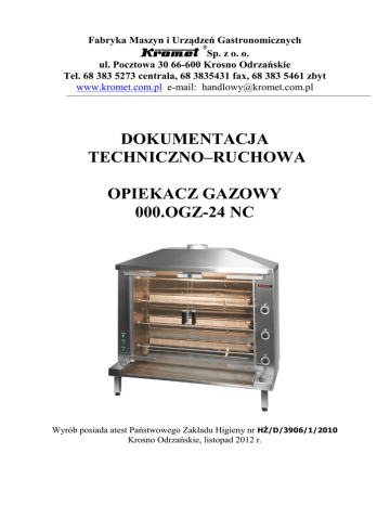 Fabryka Maszyn i Urządzeń Gastronomicznych Sp. z o. o. ul. Pocztowa 30 66-600 Krosno Odrzańskie Tel. 68 383 5273 centrala, 68 3835431 fax, 68 383 5461 zbyt www.kromet.com.pl e-mail: [email protected] DOKUMENTACJA TECHNICZNO–RUCHOWA OPIEKACZ GAZOWY 000.OGZ-24 NC Wyrób posiada atest Państwowego Zakładu Higieny nr HŻ/D/3906/1/2010 Krosno Odrzańskie, listopad 2012 r. Dokumentacja Techniczno-Ruchowa. Opiekacz Gazowy 000.OGZ-24NC 2 SPIS TREŚCI 1. 2. 3. 4. 5. 6. 7. 8. 9. 10. 11. 12. 13. Przeznaczenie opiekacza. Charakterystyka techniczna opiekacza. Opis techniczny opiekacza. Regulacja palnika Użytkowanie. Zalecenia bezpieczeństwa. Obsługa opiekacza gazowego. Instalacja elektryczna. Przeglądy okresowe Pakowanie, ładowanie i przewóz. Uwagi końcowe. Instalowanie opiekacza gazowego. Opiekacze gazowe – instrukcje dla instalatorów Dokumentacja Techniczno-Ruchowa. Opiekacz Gazowy 000.OGZ-24NC 3 1. Przeznaczenie Opiekacza Opiekacz gazowy przeznaczony jest do profesjonalnego użytku w zakładach zbiorowego żywienia przez osoby przeszkolone służy głównie do opiekania kurczaków i znajduje zastosowanie: jako urządzenie stacjonarne w zakładach zbiorowego żywienia, jako urządzenie przewoźne (przejezdne) w ruchomych punktach sprzedaży. 2. Charakterystyka Techniczna Opiekacza. Opiekacz wyposażony jest w palniki spalania bezpłomieniowego sterowane pokrętłami kurków gazowych oraz w zapalacze iskrowe, których przełącznik znajduje się na tablicy rozdzielczej. Tabela1. Dane techniczne opiekaczy. DANE TECHNICZNE Wysokość z kominem Szerokość Głębokość Moc urządzenia Masa urządzenia Przyłącze gazu Pojemność jednego wsadu Klasa ochrony Stopień ochrony Zasilanie elektryczne 000.OGZ-24NC 1300 mm 1200 mm 540 mm 16,2 kW (3x5,4 kW) 80 kg R1/2” 24 kurczaki I IP 32 NPE ~230V 50 Hz Tabela2. Zużycie gazu. Całkowity czas opiekania. B / P / propan-butan / 1,5 h - 4 widelce 1,5 kg/h Zużycie gazu przy pełnym obciążeniu. Gaz E / GZ – 50 / 1,8 m3/h. Dokumentacja Techniczno-Ruchowa. Opiekacz Gazowy 000.OGZ-24NC 4 UWAGA: Opiekacz gazowy przystosowany jest przez wytwórcę do spalania gazu ziemnego „E” (20 mbar). Przystosowanie urządzenie do spalania innego rodzaju gazu wymaga, wykonanie następujących czynności: zmiana dyszy palnika głównego, regulacja płomienia palników nawierzchniowych, a)regulacja płomienia pełnego(dopływ powietrza), b)regulacja płomienia oszczędnego, regulację płomienia zapalacza, UWAGA: Wymienione powyższe czynności może dokonać tylko autoryzowany serwisant firmy KROMET wg zamieszczonej instrukcji dla instalatorów. Stosowane paliwa gazowe i ich parametry w opiekaczu gazowym podano w tabeli 3. Tabela 3. Parametry paliw gazowych stosowanych w opiekaczach. Wartość opałowa Podgrupa gazu w MJ/m3 Rodzaj gazu nie mniej niż E / GZ – 50 / 35,4 B / P / propan-butan / 101 Ciśnienie nominalne gazu w kPa. +0,5 2,0 -0,4 +0,7 3,7 -0,6 Opiekacz oświetlony jest za pomocą lampy halogenowej LH151-200W230V. Komora opiekacza zamykana jest drzwiami szklanymi, które pozwalają na ciągłą kontrolę strefy opiekania. Pod opiekaczem znajduje się szuflada, która pełni rolę pojemnika zbierającego tłuszcz. Rys.1. Widok ogólny Opiekacza Gazowego 000.OGZ-24 NC Dokumentacja Techniczno-Ruchowa. Opiekacz Gazowy 000.OGZ-24NC 5 3. Budowa Opiekacza Gazowego. Konstrukcję nośną opiekacza stanowią odpowiednio gięte i pospawane elementy obudowy wykonane z wysokogatunkowych blach nierdzewnych kwasoodpornych. W tylnej części konstrukcji nośnej wmontowane są bezpłomieniowe palniki gazowe. Instalację wyciągową stanowi nadstawka z króćcem wyjściowym. Urządzenie jest przystosowane do pracy pod stałym okapem odprowadzającym opary i spaliny. W przypadku podłączenia urządzenia do instalacji wyciągowej grawitacyjnej lub mechanicznej należy zastosować w niej zabezpieczenie przed zanikiem ciągu kominowego Na przedniej ścianie opiekacza znajdują się pokrętła kurków gazowych, włącznik napędu, włącznik oświetlenia oraz wyłącznik zapalacza elektrycznego. 4. Regulacja Palnika. UWAGA: Czynności związane z regulacją kurka i palników powinien wykonywać pracownik autoryzowanego serwisu firmy KROMET. OSTRZEŻENIE: Źle wyregulowany palnik ma długi czerwono-żółty, kopcący płomień bez wyraźnie zarysowanych stożków wewnętrznych, Dobrze wyregulowany palnik ma ostry, niebieski płomień z wyraźnie zarysowanym stożkiem wewnętrznym, Źle wyregulowany palnik to zbędne spalanie gazu, powolne nagrzewanie, strata czasu, nadmierne koszty zużywanego gazu, Dobrze wyregulowany palnik to szybkie gotowanie, wysoka sprawność cieplna palników, oszczędność czasu i gazu, a również mniejsza zawartość szkodliwego tlenku węgla w spalinach, dobrze wyregulowany palnik to oszczędność. Rys. 2. Umiejscowienie wkrętu regulacyjnego na kurku. Dokumentacja Techniczno-Ruchowa. Opiekacz Gazowy 000.OGZ-24NC 6 Regulację płomienia oszczędnego palnika opiekacza uzyskujemy poprzez regulację wkrętem regulującym „1” / rys. nr 2 /, znajdującym się na przedniej ścianie kurka. W celu uzyskania do niego dostępu należy zdjąć pokrętło kurka. Regulacja płomienia oszczędnego ma za zadanie uzyskanie minimalnego i stabilnego płomienia. Wkręt regulacyjny w prawym skrajnym położeniu całkowicie zamyka dopływ gazu, przekręcając go w lewo uzyskujemy zwiększenie płomienia. 5. Użytkowanie. 5.1. Sposób uruchomienia opiekacza gazowego. Przed przystąpieniem do użytkowania opiekacza należy sprawdzić czy wszystkie kurki gazowe opiekacza znajdują się w pozycji zamkniętej. Następnie należy otworzyć kurek gazowy, znajdujący się w instalacji gazowej zasilającej opiekacz. W celu zapalenia poszczególnych palników gazowych opiekacza należy: Wcisnąć pokrętło poz. 4 (rys.4 b) do oporu i przekręcić go w lewo o około 900 jednocześnie przyciskając włącznik zapalacza poz. 14 rys.3 do chwili zapalenia się palni