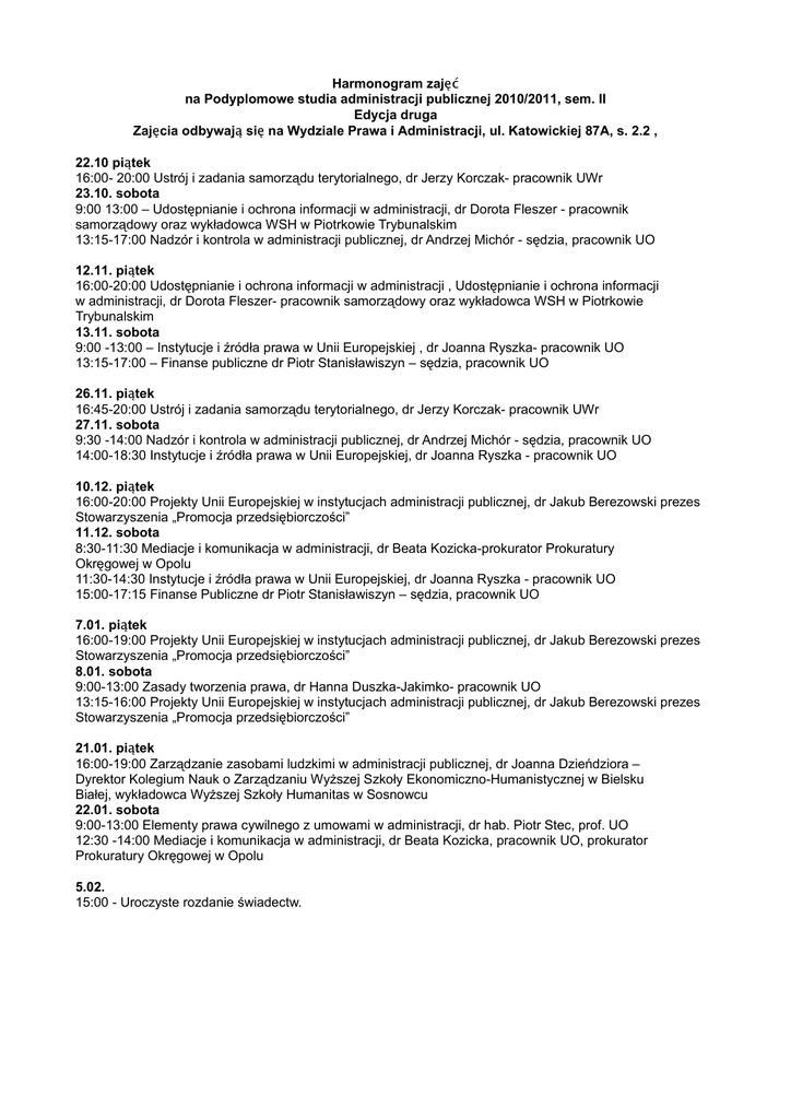 Harmonogram zajęć na Podyplomowe studia administracji publicznej 2010/2011, sem. II Edycja druga Zajęcia odbywają się na Wydziale Prawa i Administracji, ul. Katowickiej 87A, s. 2.2 , 22.10 piątek 16:00- 20:00 Ustrój i zadania samorządu terytorialnego, dr Jerzy Korczak- pracownik UWr 23.10. sobota 9:00 13:00 – Udostępnianie i ochrona informacji w administracji, dr Dorota Fleszer - pracownik samorządowy oraz wykładowca WSH w Piotrkowie Trybunalskim 13:15-17:00 Nadzór i kontrola w administracji publicznej, dr Andrzej Michór - sędzia, pracownik UO 12.11. piątek 16:00-20:00 Udostępnianie i ochrona informacji w administracji , Udostępnianie i ochrona informacji w administracji, dr Dorota Fleszer- pracownik samorządowy oraz wykładowca WSH w Piotrkowie Trybunalskim 13.11. sobota 9:00 -13:00 – Instytucje i źródła prawa w Unii Europejskiej , dr Joanna Ryszka- pracownik UO 13:15-17:00 – Finanse publiczne dr Piotr Stanisławiszyn – sędzia, pracownik UO 26.11. piątek 16:45-20:00 Ustrój i zadania samorządu terytorialnego, dr Jerzy Korczak- pracownik UWr 27.11. sobota 9:30 -14:00 Nadzór i kontrola w administracji publicznej, dr Andrzej Michór - sędzia, pracownik UO 14:00-18:30 Instytucje i źródła prawa w Unii Europejskiej, dr Joanna Ryszka - pracownik UO 10.12. piątek 16:00-20:00 Projekty Unii Europejskiej w instytucjach administracji publicznej, dr Jakub Berezowski prezes Stowarzyszenia „Promocja przedsiębiorczości” 11.12. sobota 8:30-11:30 Mediacje i komunikacja w administracji, dr Beata Kozicka-prokurator Prokuratury Okręgowej w Opolu 11:30-14:30 Instytucje i źródła prawa w Unii Europejskiej, dr Joanna Ryszka - pracownik UO 15:00-17:15 Finanse Publiczne dr Piotr Stanisławiszyn – sędzia, pracownik UO 7.01. piątek 16:00-19:00 Projekty Unii Europejskiej w instytucjach administracji publicznej, dr Jakub Berezowski prezes Stowarzyszenia „Promocja przedsiębiorczości” 8.01. sobota 9:00-13:00 Zasady tworzenia prawa, dr Hanna Duszka-Jakimko- pracownik UO 13:15-16:00 Projekty Unii Europejskiej w instytucjach administracji publicznej, dr Jakub Berezowski prezes Stowarzyszenia „Promocja przedsiębiorczości” 21.01. piątek 16:00-19:00 Zarządzanie zasobami ludzkimi w administracji publicznej, dr Joanna Dzieńdziora – Dyrektor Kolegium Nauk o Zarządzaniu Wyższej Szkoły Ekonomiczno-Humanistycznej w Bielsku Białej, wykładowca Wyższej Szkoły Humanitas w Sosnowcu 22.01. sobota 9:00-13:00 Elementy prawa cywilnego z umowami w administracji, dr hab. Piotr Stec, prof. UO 12:30 -14:00 Mediacje i komunikacja w administracji, dr Beata Kozicka, pracownik UO, prokurator Prokuratury Okręgowej w Opolu 5.02. 15:00 - Uroczyste rozdanie świadectw.