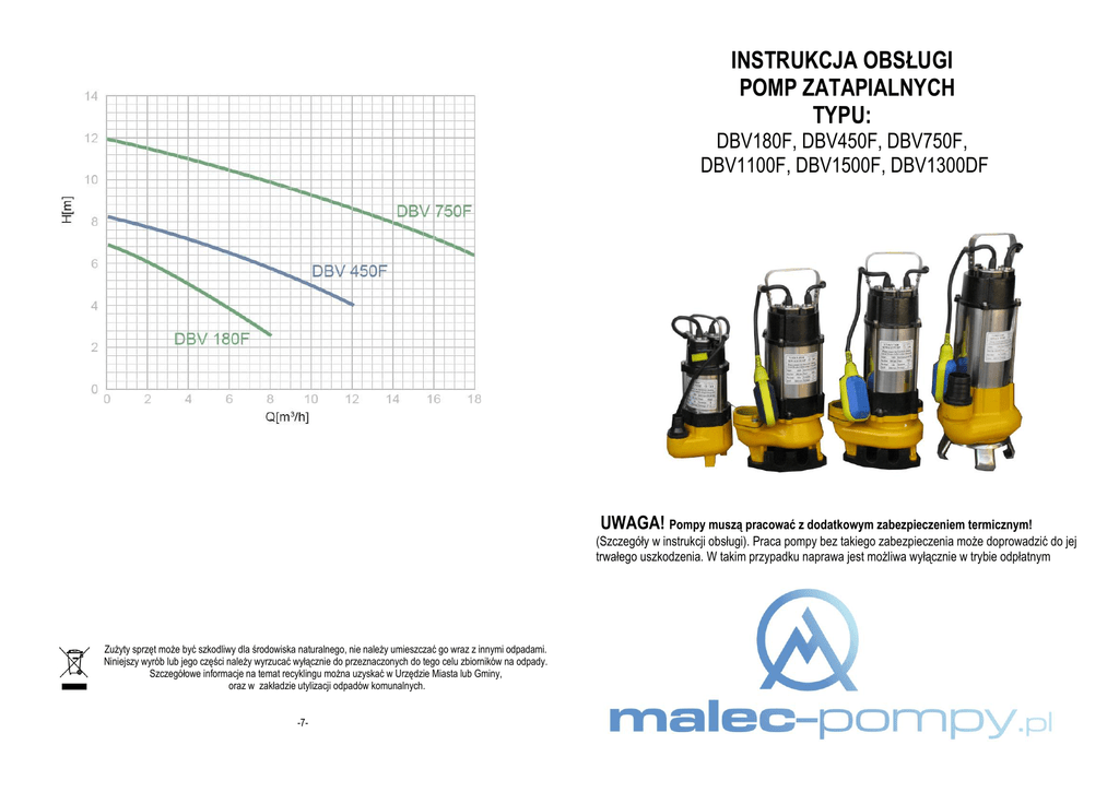 INSTRUKCJA OBSŁUGI POMP ZATAPIALNYCH TYPU: DBV180F, DBV450F, DBV750F, DBV1100F, DBV1500F, DBV1300DF UWAGA! Pompy muszą pracować z dodatkowym zabezpieczeniem termicznym! (Szczegóły w instrukcji obsługi). Praca pompy bez takiego zabezpieczenia może doprowadzić do jej trwałego uszkodzenia. W takim przypadku naprawa jest możliwa wyłącznie w trybie odpłatnym Zużyty sprzęt może być szkodliwy dla środowiska naturalnego, nie należy umieszczać go wraz z innymi odpadami. Niniejszy wyrób lub jego części należy wyrzucać wyłącznie do przeznaczonych do tego celu zbiorników na odpady. Szczegółowe informacje na temat recyklingu można uzyskać w Urzędzie Miasta lub Gminy, oraz w zakładzie utylizacji odpadów komunalnych. -7- 9. Podstawowym sposobem załatwienia reklamacji jest naprawa sprzętu, przywracająca mu wartość użytkową. SPIS TREŚCI 1. Wstęp 2. Zastosowanie 3. Parametry techniczne 4. Instalacja pompy 5. Instalacja elektryczna 6. Przechowywanie i konserwacja 7. Rozwiązywanie problemów 8. Deklaracja zgodności 9. Warunki gwarancji 10. Karta gwarancyjna Nabywcy przysługuje prawo wymiany sprzętu na nowy lub zwrot gotówki, w przypadku gdy: towar nie nosi śladów użytkowania. stwierdza się wadę fabryczną, niemożliwą do usunięcia. w okresie gwarancji dokona się trzech napraw, a sprzęt nadal będzie wykazywał wady uniemożliwiające eksploatację zgodną z przeznaczeniem (z wyłączeniem napraw polegających na regulacji sprzętu). naprawa nie zostanie dokonana w terminie określonym w pkt. 2, lub w terminie ustalonym z klientem. 10. Gwarancją nie są objęte uszkodzenia powstałe z winy użytkownika tj. wskutek niewłaściwego transportu środkami nabywcy, oraz wszelkich uszkodzeń mechanicznych spowodowanych użyciem nieoryginalnych części zamiennych oraz w wyniku użytkowania niezgodnego z przeznaczeniem lub zaleceniami instrukcji obsługi, wskutek niewłaściwego przechowywania lub konserwacji, wskutek pompowania zapiaszczonej wody, wskutek podłączenia do instalacji elektrycznej nie spełniającej warunków zawartych w instrukcji obsługi, lub niezgodnych z obowiązującymi normami zasilania. wskutek ingerencji w produkt osób nieautoryzowanych jak również wszelkich dodatkowych przeróbek wskutek wypadków losowych, klęsk żywiołowych, lub sił wyższych. 11. Gwarancja ulega unieważnieniu jeżeli stwierdzi się dokonywanie napraw lub zmian (przeróbek), przez osoby nieupoważnione (np. demontaż wtyczki). 12. Karta gwarancyjna jest nieważna jeśli nie zawiera daty zakupu, typu, nazwy i numeru fabrycznego sprzętu, pieczęci punktu sprzedaży detalicznej i podpisu sprzedawcy, jak również w przypadku gdy zawiera skreślenia i poprawki poczynione przez osoby nieupoważnione. Karta gwarancyjna jest ważna wyłącznie z dokumentem sprzedaży, tj. paragonem lub fakturą! 13. Gwarancja obejmuje tylko urządzenia eksploatowane na terenie RP. 14. Naprawy gwarancyjne i pogwarancyjne oraz części zamienne zapewnia Firma Handlowa ImportExport Agnieszka Malec, 32-040 Świątniki Górne, ul. Południowa 1. Tel. 012 270 49 48. 15. Gwarancja na sprzedany towar nie wyłącza, nie ogranicza ani nie zawiesza uprawnień kupującego wynikających z niezgodności towaru z umową. 16. Poza warunkami gwarancji, kupującemu nie przysługują żadne odszkodowania. Oświadczam, iż znane są mi warunki gwarancji, oraz zobowiązuję się do zapoznania się z instrukcją obsługi przed rozpoczęciem użytkowania wyrobu. ............................................................ ……….................................................................. Miejscowość, data zgłoszenia Podpis Klienta. 10. KARTA GWARANCYJNA NAZWA: ………………………………………………………TYP…………………………………………………………... NR FABRYCZNY…………………………………………………………………………………………………………….... DATA PRODUKCJI……………………………………………… DATA ZAKUPU……………………………………… GWARANT: Firma Handlowa Import-Export Hurt-Detal Agnieszka Malec. 32-040 Świątniki Górne, ul. Południowa 1 (dojazd od ul. Św. Stanisława ). Tel: (012) 270 49 48, Fax: (012) 256 57 30, [email protected] PIECZĘĆ SKLEPU -1- -6- DEKLARACJA ZGODNOŚCI WE F.H.U. Agnieszka Malec ul. Południowa 1 32-040 Świątniki Górne deklaruje z całą odpowiedzialnością, że: pompy typu DBV180F, DBV450F, DBV750F, DBV1100F, DBV1500F, DBV1300DF są zgodne z dokumentacją wytwórcy i spełniają zasadnicze wymagania bezpieczeństwa zawarte w Dyrektywach: 2006/95/EC „Niskie napięcie” (LVD) 2004/108/EC „Kompatybilność elektromagnetyczna” (EMC) Jednostka akredytowana dokonująca oceny zgodności: GTS Prüf-und Zertifizierungs GmbH, Burgstädter Strasse 21 D-09233 Hartmannsdorf Świątniki Górne, 01.05.2014 Agnieszka Malec, właściciel miejscowość, data 8. DEKLARACJA ZGODNOŚCI 9. WARUNKI GWARANCJI 1. Firma Handlowa Import-Export Agnieszka Malec, 32-040 Świątniki Górne, ul. Południowa 1, Tel. 012 270 49 48, udzielając gwarancji zapewnia nabywcę o bardzo dobrej jakości i prawidłowym działaniu zakupionego sprzętu. Firma udziela gwarancji w terminie 12 miesięcy od daty zakupu. 2. Wady i uszkodzenia sprzętu powstałe z winy producenta i ujawnione w okresie gwarancji będą usuwane bezpłatnie przez serwis. 3. Czas naprawy gwarancyjnej liczony jest od daty dostarczenia towaru do punktu serwisowego. W przypadku konieczności sprowadzenia części zamiennych z zagranicy od producenta, okres naprawy gwarancyjnej może być wydłużony do 28 dni roboczych. Przyjęcie musi być potwierdzone w kuponie reklamacyjnym. 4. W każdym przypadku użytkownik zobowiązany jest wymontować urządzenie ze studni lub trudnodostępnych miejsc i dostarczyć je do punktu serwisowego. F.H.U. A.MALEC nie pokrywa żadnych dodatkowych kosztów poniesionych p