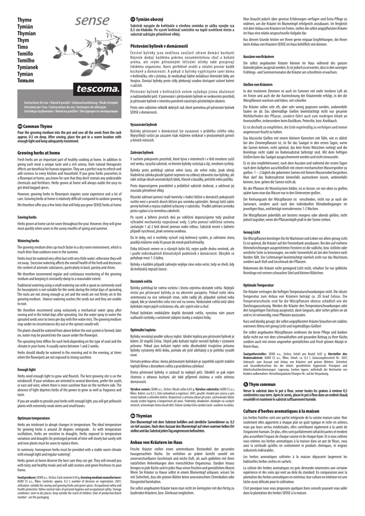Thyme Tymián Thymian Thym Timo Tomillo Tomilho Tymianek Tymian Тимьян Instructions for use / Návod k použití / Gebrauchsanleitung / Mode d’emploi Istruzioni per l’uso / Instrucciones de uso / Instruções de utilização Instrukcja użytkowania / Návod na použitie / Инструкция по эксплуатации a Common Thyme Pour the growing medium into the pot and sow all the seeds from the sack approx. 0.5 cm deep. After sowing, place the pot in a warm location with enough light and keep adequately moistened. Growing herbs at home Fresh herbs are an important part of healthy cooking at home. In addition to giving each meal a unique taste and a rich aroma, their natural therapeutic effects are beneficial for human organism. They are a perfect way to refresh and add cosiness to every kitchen and household. If you grow herbs yourselves in a flowerpot at home, you know for sure that they don’t contain any undesirable chemicals and fertilisers. Herbs grown at home will always outdo the easy-toget dried bagged spices. However, growing herbs in flowerpots requires some experience and a lot of care. Growing herbs at home is relatively difficult compared to outdoor growing. We therefore offer you a few hints that will help you grow SENSE herbs at home. Sowing herbs Herbs grown at home can be sown throughout the year. However, they will grow most quickly when sown in the sunny months of spring and summer. Watering herbs The growing medium dries up much faster in a dry room environment, which is much drier than outdoors even in the summer. Herbs must be watered very often but with very little water; otherwise they will rot away. Excessive watering affects the overall health of the herb and decreases the content of aromatic substances, particularly in basil, parsley and chives. We therefore recommend regular and continuous monitoring of the growing medium and keeping it constantly damp to a reasonable extent. Traditional watering using a small watering can with a spout as commonly used for houseplants is not suitable for the seeds during the initial days of sprouting. The roots are not strong enough as yet and the seeds are not firmly set in the growing medium. Intense watering washes the seeds out and they are unable to root. We therefore recommend using exclusively a mechanical water spray after sowing and in the initial days after sprouting. Use the water spray to water the sprouted seeds once to twice per day with fine water mist. The growing medium may under no circumstances dry out or the sprouts would wilt. The plants should be watered from above before the root system is formed; later on, water may be poured into the saucer under the flowerpot. The sprouting time differs for each herb depending on the type of seed and the climate in your home. It usually varies between 1 and 2 weeks. Herbs should ideally be watered in the morning and in the evening, at times when the flowerpots are not exposed to strong sunshine. Enough light Herbs need enough light to grow and flourish. The best growing site is on the windowsill. If your windows are oriented in several directions, prefer the south, or east and west, where there is more sunshine than on the northern side. The absence of light deprives herbs of the power to grow as well as fragrance and taste. If you are unable to provide your herbs with enough light, you will get yellowish plants with extremely weak stems and small leaves. Optimum temperature Herbs are intolerant to abrupt changes in temperature. The ideal temperature for growing herbs is around 20 degrees centigrade. As with temperature oscillations, herbs are sensitive to draughts. Herbs exposed to temperature variations and draughts for prolonged periods of time will slowly but surely wilt and new plants must be sown to replace them. In summary: homegrown herbs must be provided with a stable warm climate with enough light and regular watering! Herbs grown at home deserve the best care they can get. They will reward you with tasty and healthy meals and will add cosiness and green freshness to your home. Seed producer: SEMO a.s., Stržice; Sack contents 0.05 g. Growing medium manufacturer: AGRO CS a.s., Říkov. Contents: approx. 0.3 l; number of decision on registration: 2691; utilisation: suitable for sowing and growing herbs and green spices. Occupational safety and health protection: follow normal rules of personal hygiene and occupational safety. Storage conditions: store in dry places, keep outside the reach of children. Date of production/batch number: see the packaging. s Tymián obecný Substrát nasypte do květináče a všechna semínka ze sáčku vysejte cca 0,5 cm hluboko. Po vysetí květináč umístěte na teplé osvětlené místo a substrát udržujte přiměřeně vlhký. Pěstování bylinek v domácnosti Čerstvé bylinky jsou nedílnou součástí zdravé domácí kuchyně. Nejenže dodají každému pokrmu nezaměnitelnou chuť a bohaté aroma, ale svými přirozenými léčivými účinky také prospívají lidskému organismu. Navíc perfektně osvěží a zútulní prostor každé kuchyně a domácnosti. A pokud si bylinky vypěstujete sami doma v květináčku, víte s jistotou, že neobsahují žádné nežádoucí chemické látky ani hnojiva. Domácí bylinky proto vždy překonají snadno dostupné sušené koření v sáčcích. Pěstování bylinek v květináčích ovšem vyžaduje jistou zkušenost a nadstandardní péči. V porovnání s pěstováním bylinek ve venkovním prostředí, je pěstování bylinek v interiéru poměrně náročným pěstitelským úkolem. Proto vám nabízíme několik dobrých rad, které pomohou při pěstování bylinek SENSE v domácnosti. Vysazování bylinek Bylinky pěstované v domácnosti lze vysazovat v průběhu celého roku. Nejrychlejší vzrůst po zasazení však můžeme očekávat v prosluněných jarních a letních měsících. Zalévání bylinek V suchém pokojovém prostředí, 