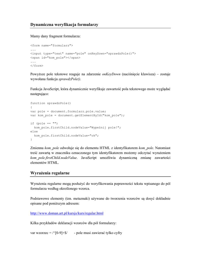 Dynamiczna weryfikacja formularzy Wyrażenia regularne