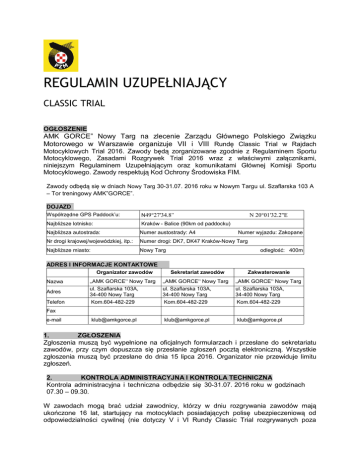 REGULAMIN UZUPEŁNIAJĄCY CLASSIC TRIAL OGŁOSZENIE AMK GORCE” Nowy Targ na zlecenie Zarządu Głównego Polskiego Związku Motorowego w Warszawie organizuje VII i VIII Rundę Classic Trial w Rajdach Motocyklowych Trial 2016. Zawody będą zorganizowane zgodnie z Regulaminem Sportu Motocyklowego, Zasadami Rozgrywek Trial 2016 wraz z właściwymi załącznikami, niniejszym Regulaminem Uzupełniającym oraz komunikatami Głównej Komisji Sportu Motocyklowego. Zawody respektują Kod Ochrony Środowiska FIM. Zawody odbędą się w dniach Nowy Targ 30-31.07. 2016 roku w Nowym Targu ul. Szaflarska 103 A – Tor treningowy AMK”GORCE”. DOJAZD Współrzędne GPS Paddock’u: N49°27'34.8’’ N 20°01'32.2"E Najbliższe lotnisko: Kraków - Balice (90km od paddocku) Najbliższa autostrada: Numer austostrady: A4 Nr drogi krajowej/wojewódzkiej, itp.: Numer drogi: DK7, DK47 Kraków-Nowy Targ Najbliższe miasto: Nowy Targ Numer wyjazdu: Zakopane odległość: 400m ADRES I INFORMACJE KONTAKTOWE Organizator zawodów Sekretariat zawodów Zakwaterowanie Nazwa „AMK GORCE” Nowy Targ „AMK GORCE” Nowy Targ „AMK GORCE” Nowy Targ Adres ul. Szaflarska 103A, 34-400 Nowy Targ ul. Szaflarska 103A, 34-400 Nowy Targ ul. Szaflarska 103A, 34-400 Nowy Targ Telefon Kom.604-482-229 Kom.604-482-229 Kom.604-482-229 [email protected] [email protected] [email protected] Fax e-mail 1. ZGŁOSZENIA Zgłoszenia muszą być wypełnione na oficjalnych formularzach i przesłane do sekretariatu zawodów, przy czym dopuszcza się przesłanie zgłoszeń pocztą elektroniczną. Wszystkie zgłoszenia muszą być przesłane do dnia 15 lipca 2016. Organizator nie przewiduje limitu zgłoszeń. 2. KONTROLA ADMINISTRACYJNA I KONTROLA TECHNICZNA Kontrola administracyjna i techniczna odbędzie się 30-31.07. 2016 roku w godzinach 07.30 – 09.30. W zawodach mogą brać udział zawodnicy, którzy w dniu rozgrywania zawodów mają ukończone 16 lat, startujący na motocyklach posiadających polisę ubezpieczeniową od odpowiedzialności cywilnej (nie dotyczy V i VI Rundy Classic Trial rozgrywanych poza drogami publicznymi, które Organizator ubezpieczył dodatkowo zgodnie z Art. „01.1.2 Standardy Organizacyjne” niniejszego regulaminu), oraz spełniające wszystkie wymagania dla motocykli Classic Trial. Przy kontroli dokumentów zawodnik musi przedłożyć m.in.: ważną licencję/ubezpieczenie NNW/, zgodę rodzica lub opiekunów prawnych w przypadku zawodników małoletnich, zgodnie z Art. 3.1.1 i Art. 03.8.2, oraz ubezpieczenie OC pojazdu (jeśli jest wymagane), na którym się porusza. Przy kontroli technicznej zawodnik musi okazać polisę OC motocykla (jeśli jest wymagana) oraz kask zgodny ze standardami Regulaminu Technicznego Rajdów Trial. Zawodnik ma zapewnioną możliwość pokonania całej trasy (z paddocku do wszystkich odcinków jazdy obserwowanej, a następnie z powrotem do paddocku) bez konieczności korzystania z dróg publicznych. 2. NUMERY STARTOWE Organizator zapewnia numery startowe. 3. KOLEJNOŚĆ STARTU Przy kontroli administracyjnej każdy zawodnik rejestruje się i losuje kolejność startu, zgodnie z Art. 01.8.10. 4. TRASA Trasa składa się z 3 okrążeń. Długość jednego okrążenia trasy wynosi 3 km. 6. PADDOCK I BIURO ZAWODÓW Paddock dla zawodników zostanie otwarty w dniu 30.07.2016 roku od godziny 07.30. Biuro zawodów zostanie otwarte w dniu 30.07.2016 roku od godziny 07.30. 5. ZABEZPIECZENIE MEDYCZNE Podczas trwania zawodów organizator zabezpiecza karetkę szybkiej interwencji, pozwalającej na miejscu wypadku udzielić natychmiastowej pomocy w zakresie czynności oddechowych i sercowo-krążeniowych. Personel medyczny - co najmniej dwie osoby uprawnione do wykonywania medycznych czynności ratunkowych w tym: Lekarz zawodów mogący udzielić pierwszej pomocy i przeprowadzić akcję reanimacyjną. Ratownik lub pielęgniarka. Kierowca karetki przeszkolony w udzielaniu pierwszej pomocy. 8. UBEZPIECZENIE Zawody, osoby uczestniczące w organizacji zawodów oraz zawodnicy są ubezpieczeni przez organizatora od odpowiedzialności cywilnej OC. Ubezpieczenie NNW zawodnicy oraz sędziowie i osoby funkcyjne posiadają w ramach opłaty za licencje, a osoby uczestniczące w organizacji zawodów nieposiadające licencji ubezpiecza organizator zawodów. Mechanik towarzyszący zawodnikowi musi posiadać ważną licencję lub posiadać polisę NNW. Mechnicy bez licencji lub polisy NNW muszą wykupić ubezpieczenie od NNW na miejscu zawodów u organizatora. Classic Trial Regulamin Uzupełniający 2016 Polski Związek Motorowy, Strona: 3 Organizator nie przyjmuje na siebie odpowiedzialności za szkody powstałe w czasie zawodów w stosunku do zawodnika i jego sprzętu. Organizator posiada ubezpieczenia od odpowiedzialności cywilnej organizatora, osób funkcyjnych oraz zawodników wobec osób trzecich oraz ich mienia o sumie gwarancyjnej o równowartości minimum 20.000 Euro. 9. UBEZPIECZENIE Ceremonia Wręczania Nagród odbędzie się w miejscu startu w ciągu 15 minut od przyjazdu na metę ostatniego sklasyfikowanego zawodnika drugiego dnia zawodów. Nagrody zostaną przyznane zgodnie z Art. 03.15 Regulaminu Sportowego Rajdów Trial oraz Regulaminem Finansowym Rajdów Trial. 10. INFORMACJE DODATKOWE Zawodnicy mają obowiązek stosowania maty środowiskowej pod motocyklem w czasie, gdy wykonywane są przy nim czynności obsługowe takie jak np. tankowanie paliwa, smarowanie łańcucha, naprawy itp. Przestrzeganie tego obowiązku będzie kontrolowane przez Komisarza d/s Ochrony Środowiska oraz inne osoby urzędowe. Za brak maty środowiskowej zawodnik zostanie ukarany karą finansową zgodnie z Regulaminem Sportowym Rajdów Trial i Regulaminem Finansowym Rajdów Trial. Organizator informuje, że przed startem oraz w trakcie trwania zawodów prowadzone będą kontrole trzeźwości zawodników zgodnie z Regulaminem Sportowym Rajdów Trial. 9. OSOBY URZĘDOWE IMIĘ I NAZWISKO SĘDZIA GŁÓWNY ZAWODÓW MIC