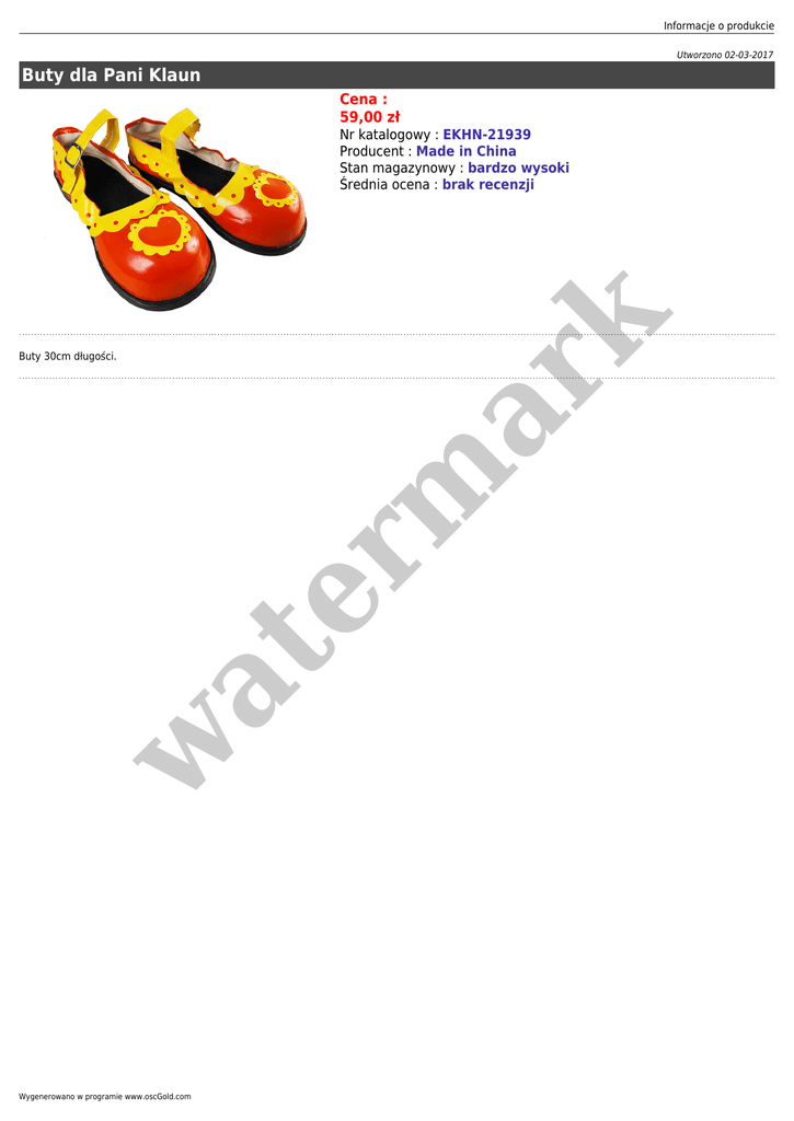 Informacje o produkcie Utworzono 02-03-2017 Buty dla Pani Klaun Cena : 59,00 zł er m ar k Nr katalogowy : EKHN-21939 Producent : Made in China Stan magazynowy : bardzo wysoki Średnia ocena : brak recenzji w at Buty 30cm długości. Wygenerowano w programie www.oscGold.com