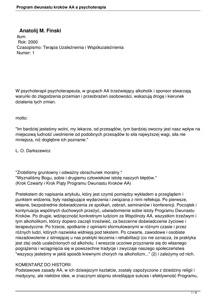 Program dwunastu kroków AA a psychoterapia Anatolij M. Finski tłum. Rok: 2000 Czasopismo: Terapia Uzależneinia i Współuzależnienia Numer: 1 W psychoterapii psychoterapeuta, w grupach AA trzeźwiejący alkoholik i sponsor stwarzają warunki do złagodzenia przemian i przeobrażeń osobowości, wskazują drogę i kierunek działania tych zmian. motto: "Im bardziej jesteśmy wolni, my lekarze, od przesądów, tym bardziej owocny jest nasz wpływ na miejscową ludność uwolnienie od podobnych przesądów to siła najwyższej wagi, siła nie mniejsza, niż dogłębne ich poznanie." L. O. Darkszewicz "Zrobiliśmy gruntowny i odważny obrachunek moralny." "Wyznaliśmy Bogu, sobie i drugiemu człowiekowi istotę naszych błędów." (Krok Czwarty i Krok Piąty Programu Dwunastu Kroków AA) Pretekstem do napisania artykułu, który jest czymś pomiędzy wykładem a przeglądem i punktem widzenia, były następujące wydarzenia i związana z nimi refleksja. Po pierwsze, własne, bezpośrednie doświadczenia ze spotkań, zebrań, seminariów i konferencji. Początek i kontynuacja wspólnych duchowych przeżyć, uświadomienie sobie istoty Programu Dwunastu Kroków. Po drugie, wdzięczność konkretnym ludziom ze Wspólnoty AA, wszystkim trzeźwym i tym alkoholikom, którzy dopiero zaczęli trzeźwieć, za bezcenne doświadczenie życiowe i terapeutyczne. Po trzecie, spotkanie z opiniami sformułowanymi w różnym czasie i przez różnych ludzi, których nazwiska widnieją pod tekstem. Po czwarte, zawodowe i osobiste niezadowolenie z istniejącej u nas praktyki leczenia i rehabilitacji (co nie oznacza, że praktyka jest zła) osób uzależnionych od alkoholu. I wreszcie uczciwe przyznanie się do własnego pogrążenia i wciągnięcia się w powszechne tradycje i zwyczaje naszego społeczeństwa "wszyscy jesteśmy w jakiś sposób krewnymi chorych na alkoholizm..." (2) i zależymy od nich. KOMENTARZ DO HISTORII Podstawowe zasady AA, w ich dzisiejszym kształcie, zostały zapożyczone z dziedziny religii i medycyny, ale niektóre idee, w znacznym stopniu określające sukces i efektywność Programu, 1/8 Program dwunastu kroków AA a psychoterapia zbudowane są na obserwacjach zachowań i potrzeb samych członków i uczestników AA (1, 4). Poniżej podane są podstawowe zasady AA. Alkoholizm to choroba i jest zupełnie oczywiste, że potępiać uzależnionego od alkoholu za to, że pije to tak samo, jak ganić chorego na gruźlicę za to, że kaszle. To bezsensowne i niekonstruktywne (2). Tekst Dwunastu Kroków został sformułowany i napisany przez samych alkoholików na podstawie ich własnego doświadczenia alkoholowego, własnego zachowania i postępków, prób i błędów w poszukiwaniu własnej drogi do trzeźwości i przebudzenia duchowego. Każde twierdzenie Dwunastu Kroków zostało utworzone i sformułowane w czasie przeszłym dokonanym i zaczyna się od "My". Zwrot od "My" do "Ja" jest przesłaniem pomocy od "Nas" do "Ciebie". Stosunki "My" i "Ty" to jakby konstatacja faktu, że decyzja została podjęta i krok został przyswojony: My przyznaliśmy... My straciliśmy... Pokornie wybaczyliśmy... jak my Go pojmowaliśmy... (2). W "My" realizowana jest fundamentalna idea jedności ruchu AA: "O ile łatwiej zostać abstynentem, jeśli pomagasz komuś innemu przestać pić". Teza ta może być z powodzeniem stosowana w każdym dowolnym ruchu i grupie samopomocy. Sama w sobie jest psychoterapeutyczna: "O ile prościej być zdrowym, jeśli pomagasz drugiemu w chorobie". "Pomagając innemu, pomagam sobie". W AA realizowana jest zasada "Tutaj i teraz". Zasada ta jest poglądowo przedstawiona w haśle "Tylko dzisiaj". W AA radzą, aby pod żadnym pozorem nie składać obietnic rzucenia picia: "...bądź trzeźwy tylko jeden dzień!", "Zacznij od jednego dnia!", "Tylko dziś... przeżyję... nie będę,.. postaram się..." itp. Chciałbym zaznaczyć ciekawą i ważną, konceptualną wypowiedź W. Brown'a: "Mówią, że wiedza naukowa i przekonania religijne są ze sobą sprzeczne. Uważam, iż tragedią naszych czasów jest fakt, że ten głupi i niebezpieczny błąd jest powszechnie powtarzany. Wydaje mi się, iż w działalności i ideologii AA udało się to pogodzić". Rzeczywiście, AA wychodzi z założenia, że alkoholizm to choroba ciała, umysłu i duszy człowieka. Dlatego Program Dwunastu Kroków określa się jako program duchowego przebudzenia i duchowego wzrostu. W programie dynamicznie współdziałają i łączą się doświadczenie i wiedza, wiara i uduchowienie, co ma znaczenie terapeutyczne i wyjaśnia jego efektywność. Potwierdzeniem tej tezy jest fakt pojawienia się licznych grup samopomocy, w których Tradycje AA są zachowywane, co ma odbicie w programie i nazewnictwie, a program jest dostosowywany do własnych problemów. Tak powstaje AlAnon wspólnota rodzin alkoholików, osób współuzależnionych, Al-Ateen wspólnota dzieci alkoholików, DDA wspólnota dorosłych dzieci alkoholików. Powstają grupy tematycznie nie związane z problematyką uzależnień alkoholowych: Anonimowi Narkomani, Anonimowi Schizofrenicy, Anonimowi Seksoholicy, Anonimowi Uzależnieni od... itp., grupy, których powstanie zapoczątkowało AA swoimi Dwunastoma Krokami. W ten sposób program AA okazał się realnym i praktycznym urzeczywistnieniem zintegrowanego terapeutycznego podejścia, stworzonego przez samych pacjentów i dał potężny bodziec do rozwoju różnorodnych grup "samowzajemnej psychoterapii". Profesjonaliści zajmujący się konsultowaniem, korekcją i leczeniem osób uzależnionych i współuzależnionych, szczególnie powinni brać to pod uwagę. DWANAŚCIE KROKÓW JAKO PROCES TERAPEUTYCZNY I SYSTEM DZIAŁANIA 2/8 Program dwunastu kroków AA a psychoterapia PSYCHOTERAPEUTYCZNEGO W ciągu wielu lat w AA nagromadziło się mnóstwo anegdot, powiedzonek, metafor wytworzył się swego rodzaju folklor, posiadający sam w sobie wartość psychoterapeutyczną. Zacytuję jedno z p