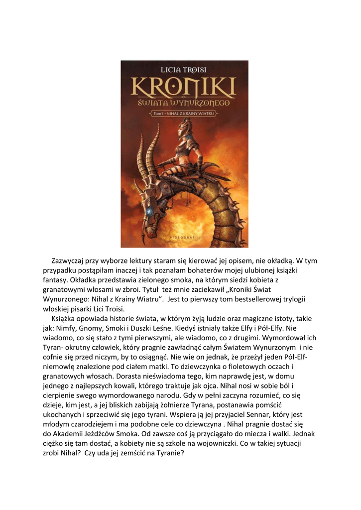 Zazwyczaj przy wyborze lektury staram się kierować jej opisem, nie okładką. W tym przypadku postąpiłam inaczej i tak poznałam bohaterów mojej ulubionej książki fantasy. Okładka przedstawia zielonego smoka, na którym siedzi kobieta z granatowymi włosami w zbroi. Tytuł też mnie zaciekawił „Kroniki Świat Wynurzonego: Nihal z Krainy Wiatru”. Jest to pierwszy tom bestsellerowej trylogii włoskiej pisarki Lici Troisi. Książka opowiada historie świata, w którym żyją ludzie oraz magiczne istoty, takie jak: Nimfy, Gnomy, Smoki i Duszki Leśne. Kiedyś istniały także Elfy i Pół-Elfy. Nie wiadomo, co się stało z tymi pierwszymi, ale wiadomo, co z drugimi. Wymordował ich Tyran- okrutny człowiek, który pragnie zawładnąć całym Światem Wynurzonym i nie cofnie się przed niczym, by to osiągnąć. Nie wie on jednak, że przeżył jeden Pół-Elfniemowlę znalezione pod ciałem matki. To dziewczynka o fioletowych oczach i granatowych włosach. Dorasta nieświadoma tego, kim naprawdę jest, w domu jednego z najlepszych kowali, którego traktuje jak ojca. Nihal nosi w sobie ból i cierpienie swego wymordowanego narodu. Gdy w pełni zaczyna rozumieć, co się dzieje, kim jest, a jej bliskich zabijają żołnierze Tyrana, postanawia pomścić ukochanych i sprzeciwić się jego tyrani. Wspiera ją jej przyjaciel Sennar, który jest młodym czarodziejem i ma podobne cele co dziewczyna . Nihal pragnie dostać się do Akademii Jeźdźców Smoka. Od zawsze coś ją przyciągało do miecza i walki. Jednak ciężko się tam dostać, a kobiety nie są szkole na wojowniczki. Co w takiej sytuacji zrobi Nihal? Czy uda jej zemścić na Tyranie? Książka mnie urzekła. Należy do tych, które wciągają dopiero po paru stronach, więc dajcie jej szansę i nie odkładajcie jej po przeczytaniu pierwszej strony. Autorka ma ciekawy sposób pisania, różni się od tych, z którymi się do tej pory spotkałam. Zaciekawił mnie świat, który stworzyła. Nie skupia się tylko na głównej bohaterce, ale przedstawia nam szczegółowo historie, uroki i obecną sytuację Świata Wynurzonego. Jesteśmy świadkami bohaterskich czynów Nihal, ale też jej upokorzeń i porażek. Przyglądamy się temu, jak upada świat przez intrygi i plany jednej, szalonej osoby. Uważam, że książka jest kierowana do młodzieży, jak i dorosłych. Porusza sprawy, które dotyczą nas w tym prawdziwym i realnym świecie. Nie mam na myśli tylko rozterek głównej bohaterki, ale sytuację, która skłoniła ją do nich- wojna, którą zapoczątkował Tyran. Klasyczny przykład walki dobra ze złem. Wydaje mi się, że autorka chce nam pokazać, przez przyjemną i trzymającą w napięciu lekturę, co się stanie jeżeli nie zadbamy o nasze środowisko. Mnie skłoniło to do przemyśleń. Może dojdziecie do tych samych wniosków… ale żeby to zrobić, musicie przeczytać tę książkę. Joanna Bugiel, 3G Niedawno przeczytałam bardzo interesującą książkę Krystyny Siesickiej pt. ,,Jezioro Osobliwości". Pani Krystyna ( ur. 22 listopada 1928, zm. 3 lipca 2015 ) była autorką głównie utworów dla młodzieży. Tę książkę poleciła mi jedna z moich nauczycielek. ,,Jezioro Osobliwości" opisuje losy Marty, głównej bohaterki oraz jej najbliższych, czyli matki, chłopaka oraz jego ojca. Opowiada o roli rodziny w życiu młodego człowieka, pierwszej miłości oraz trudach dorastania. Wielu rzeczy dowiadujemy się z dziennika prowadzonego przez Martę. Tytuł książki jest znaczący, ponieważ to właśnie nad Jeziorem Osobliwości spotykają się młodzi ludzie podczas obozu. Jest to miejsce, gdzie kondensuje się młodość i wszystkie jej problemy. Nazwa tej przestrzeni mówi nam o niepowtarzalności i wyjątkowości tego miejsca. Głównym wątkiem w powieści jest miłość Marty do Michała, uczucie nastolatków, które towarzyszy im, gdy stykają się z pierwszą miłością. Pojawiają się również uczucia między dwiema dorosłymi osobami po przejściach, a mianowicie Anny i Wiktora, którzy decydują się rozpocząć nowe życie. Atmosfera w powieści jest przyjemna, utwór bardzo ,,wciąga" , jest pisany prostym językiem. Emocje towarzyszące mi przy czytaniu były różne, m.in. radość, zdziwienie, wiele empatii oraz ciekawość. Moją szczególną uwagę przykuł trud dorastania dziewczyny. Wychowuje się ona w rozbitej rodzinie, jednak jest jej bardzo dobrze samej z matką, mają fantastyczne relacje. Nagle z dnia na dzień musi zaakceptować nowy związek matki. Przychodzi jej to z trudem. Uważa Wiktora za swojego wroga, nie potrafi się z nim porozumieć. Gdy musi przez kilka dni zamieszkać z nim sama, przy pomocy Michała próbuje zmienić swoje zdanie o partnerze Anny. Marta jest osobą niezdecydowaną, sama nie potrafi powiedzieć czego chce, może to być efektem młodzieńczego buntu. Ogromną zaletą książki jest to, że porusza problemy ponadczasowe. Wydaje mi się, że autorka bardzo dobrze rozumiała problemy dorastającej młodzieży. Lektura jest kierowana przede wszystkim do dorastającej młodzieży, jednak uważam, że nie tylko młodzież, ale również osoby dorosłe powinny sięgnąć po tę książkę, ponieważ każdy znajdzie w niej coś dla siebie. Przygody Marty niezmiernie mnie zaciekawiły, książka idealnie trafia w mój gust. Bez wahania mogę ją polecić innym zainteresowanym osobom. Ola Mazur, 3g