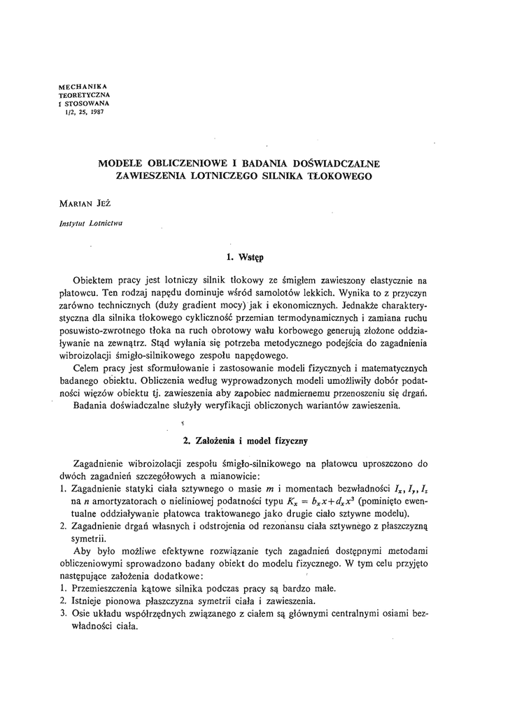 M ECHANIKA TEORETYCZNA I STOSOWANA 1/2, 25, 1987 MODELE OBLICZENIOWE I BADANIA DOŚ WIADCZALN E ZAWIESZENIA LOTNICZEGO SILNIKA TŁOKOWEGO M ARIAN JE Ż Instytut L otnictwa 1. Wstę p Obiektem pracy jest lotniczy silnik tł okowy ze ś migł em zawieszony elastycznie na pł atowcu. Ten rodzaj napę du dominuje wś ród samolotów lekkich. Wynika to z przyczyn zarówno technicznych (duży gradient mocy) jak i ekonomicznych. Jednakże charakterystyczna dla silnika tł okowego cykliczność przemian termodynamicznych i zamiana ruchu posuwisto- zwrotnego tł oka na ruch obrotowy wał u korbowego generują zł oż one oddział ywanie na zewną trz. Stą d wył ania się potrzeba metodycznego podejś cia do zagadnienia wibroizolacji ś migł o- silnikowego zespoł u napę dowego. Celem pracy jest sformuł owanie i zastosowanie modeli fizycznych i matematycznych badanego obiektu. Obliczenia wedł ug wyprowadzonych modeli umoż liwiły dobór podatnoś ci wię zów obiektu tj. zawieszenia aby zapobiec nadmiernemu przenoszeniu się drgań. Badania doś wiadczalne sł uż yły weryfikacji obliczonych wariantów zawieszenia. 2. Założ eni a i model fizyczny Zagadnienie wibroizolacji zespoł u ś migł o- silnikowego n a pł atowcu uproszczono do dwóch zagadnień szczegół owych a mianowicie: 1, Zagadnienie statyki ciał a sztywnego o masie m i momentach bezwł adnoś ci I X,I 7,I Z 3 na n amortyzatorach o nieliniowej podatnoś ci typu Kx ~ bxx+dxx (pominię to ewentualne oddział ywanie pł atowca traktowanego jako drugie ciał o sztywne modelu). 2. Zagadnienie drgań wł asnych i odstrojenia od rezonansu ciał a sztywnego z pł aszczyzną symetrii. Aby był o moż liwe efektywne rozwią zanie tych zagadnień dostę pnymi metodami obliczeniowymi sprowadzono badany obiekt do modelu fizycznego. W tym celu przyję to nastę pują ce zał oż enia dodatkowe: ' 1. Przemieszczenia ką towe silnika podczas pracy są bardzo mał e. 2. Istnieje pionowa pł aszczyzna symetrii ciał a i zawieszenia. 3. Osie ukł adu współ rzę dnych zwią zanego z ciał em są gł ównymi centralnymi osiami bezwł adnoś ci ciał a. 182 M. JEŻ 4. Pominię to tł umienie wewnę trzne w elementach gumowych. 5. Pominię to sprzę ż enia kinematyczne współ rzę dnych uogólnionych (tj. iloczyny pierwszych pochodnych przemieszczeń .) Orientację ciał a sztywnego modelują cego zespół ś migł o- silnikowy opisano przy pomocy współ rzę dnych Eulera (x, y, z, 0} y>, 0). Ciał o jest pobudzane do drgań uogólnionymi sił ami okresowymi P(t) i M(t). Siły te wynikają z pracy silnika i są sprowadzone do jego ś rodka masy — punkt 0, na rys. ]. Rys. 1. Schemat zespołu ś migło- silnikowego na samolocie. 3. Modele matematyczne i ich rozwią zania Okreś lony powyż je model fizyczny poddano formalizacji matematycznej przy pomocy aparatu mechaniki klasycznej — patrz [1]. Wyprowadzone tam równania ruchu ciała sztywnego na zawieszeniu podatno- tł umią cym uproszczono wpierw do zagadnienia statycznego. Otrzymany model (1) został zaprogramowany i posł uż ył do obliczeń sześ ciu współ rzę dnych uogólnionego przemieszczenia silnika pod dział aniem dowolnych obcią ż ńe statycznych. Podatnoś ci wystę pują ce w modelu został y wyznaczone drogą identyfikacji gumowych elementów zawieszenia. Poł oż enie tych elementów okreś lają współ rzę dne (xi, ji, 2f). Identyfikacja statyczna polegał a na zdję ciu charakterystyk obcią ż enie/ odkształ cenie badanych amortyzatorów w trzech kierunkach n a maszynie IN STRON . Otrzymane charakterystyki był y nastę pnie aproksymowane numerycznie do dwóch postaci : 1) liniowej Kx = axx, 3 2) nieparzystego wielomianu 3- go rzę du Kx = bxx+dxx . Identyfikacja dynamiczna amortyzatorów gumowych wymagał a zastosowania wymuszenia harmonicznego. Zrealizowano je przy pomocy wzbudnika indukcyjnego D ERRITRON w zakresie czę stotliwoś ci od 1 do 100 H z. M ierzono przebiegi sił y wymuszają cej i wywoł anego przemieszczenia. Korelacja dwóch odpowiadają cych sygnał ów elektrycznych umoż liwiła rozdzielenie reakcji amortyzatora R x(t) na dwie skł adowe, a mianowicie: 183 ZAWIESZEN IE SILN IKA LOTN ICZEG O 1) skł adową sprę ż ystą Kx(t), która jest w przeciwfazie z przemieszczeniem x(t), 2) skł adową tł umią cą Cx(t), która jest opóź niona wzglę dem przemieszczenia o 90*. Stwierdzono, że przy wymuszeniu harmonicznym gumowych amortyzatorów wywoł ane przemieszczenie jest prawie dokł adnie harmoniczne. Wektory poszczególnych harmonik, wchodzą cych w grę przy identyfikacji dynamicznej moż na dogodnie i jasno przedstawić na pł aszczyź nie zmiennej zespolonej — rys. 2 (sił y masowe był y pomijalnie mał e). Wyniki doś wiadczalnej identyfikacji dynamicznej był y nastę pnie aproksymowane wielomianami 1- go i 3- go rzę du przy pomocy programu już wykorzystanego dla identyfikacji statycznej. Jm x K.ltl Re Li Rys. 2. Schemat wektorowy identyfikacji dynamicznej amortyzatorów gumowych Elementy gumowe zawieszenia tł okowego silnika lotniczego pracują gł ównie na ś ciskanie i dlatego mają wyraź ne nieliniowe charakterystyki podatnoś ci. D o obliczeń statycznych wg modelu (1) przyję to wię c aproksymację podatnoś ci nieparzystym wielomianem 3- go stopnia. Rozwią zanie iteracyjne tych 6- ciu równań dał o wartoś ci współ rzę dnych przemieszczenia silnika dla dwóch zał oż onych wariantów sztywnoś ci ł oż a. Obcią ż eniami statycznymi zawieszenia był cię ż ar silnika oraz ś rednia wartość jego momentu napę dowego. Opracowana metoda znalazł a zastosowanie do obliczenia odkształ ceń zawieszenia podczas przecią ż eń akrobacyjnych. Wyniki rozwią zania zagadnienia statycznego są punktem wyjś cia dla zagadnienia wibroizolacji. STATYKA CIAŁA SZTYWN EG O ZAWIESZON EG O PODATNIE - P„, (1) + dZlz*)0 H (- 1 = P„, M. 184 JEŻ M„, 1= 1 0) [cd.] 1=1 Podstawową metodą wibroizolacji jest odstrojenie u