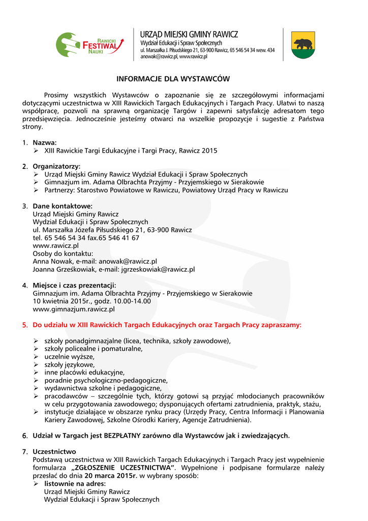 INFORMACJE DLA WYSTAWCÓW Prosimy wszystkich Wystawców o zapoznanie się ze szczegółowymi informacjami dotyczącymi uczestnictwa w XIII Rawickich Targach Edukacyjnych i Targach Pracy. Ułatwi to naszą współpracę, pozwoli na sprawną organizację Targów i zapewni satysfakcję adresatom tego przedsięwzięcia. Jednocześnie jesteśmy otwarci na wszelkie propozycje i sugestie z Państwa strony. 1. Nazwa: XIII Rawickie Targi Edukacyjne i Targi Pracy, Rawicz 2015 2. Organizatorzy: Urząd Miejski Gminy Rawicz Wydział Edukacji i Spraw Społecznych Gimnazjum im. Adama Olbrachta Przyjmy − Przyjemskiego w Sierakowie Partnerzy: Starostwo Powiatowe w Rawiczu, Powiatowy Urząd Pracy w Rawiczu 3. Dane kontaktowe: Urząd Miejski Gminy Rawicz Wydział Edukacji i Spraw Społecznych ul. Marszałka Józefa Piłsudskiego 21, 63−900 Rawicz tel. 65 546 54 34 fax.65 546 41 67 www.rawicz.pl Osoby do kontaktu: Anna Nowak, e−mail: [email protected] Joanna Grześkowiak, e−mail: [email protected] 4. Miejsce i czas prezentacji: Gimnazjum im. Adama Olbrachta Przyjmy − Przyjemskiego w Sierakowie 10 kwietnia 2015r., godz. 10.00−14.00 www.gimnazjum.rawicz.pl 5. Do udziału w XIII Rawickich Targach Edukacyjnych oraz Targach Pracy zapraszamy: szkoły ponadgimnazjalne (licea, technika, szkoły zawodowe), szkoły policealne i pomaturalne, uczelnie wyższe, szkoły językowe, inne placówki edukacyjne, poradnie psychologiczno−pedagogiczne, wydawnictwa szkolne i pedagogiczne, pracodawców – szczególnie tych, którzy gotowi są przyjąć młodocianych pracowników w celu przygotowania zawodowego; dysponujących ofertami zatrudnienia, praktyk, stażu, instytucje działające w obszarze rynku pracy (Urzędy Pracy, Centra Informacji i Planowania Kariery Zawodowej, Szkolne Ośrodki Kariery, Agencje Zatrudnienia). 6. Udział w Targach jest BEZPŁATNY zarówno dla Wystawców jak i zwiedzających. 7. Uczestnictwo Podstawą uczestnictwa w XIII Rawickich Targach Edukacyjnych i Targach Pracy jest wypełnienie formularza „ZGŁOSZENIE UCZESTNICTWA”. Wypełnione i podpisane formularze należy przesłać do dnia 20 marca 2015r. w wybrany sposób: listownie na adres: Urząd Miejski Gminy Rawicz Wydział Edukacji i Spraw Społecznych ul. Marszałka Józefa Piłsudskiego 21 63−900 Rawicz faxem: 65 546 41 67 e−mailem: [email protected] lub [email protected] 8. Organizacja powierzchni stoiska: stoiska zorganizowane są na powierzchni otwartej, maksymalna powierzchnia stoiska wynosi 4m²; większa powierzchnia dopuszczalna jest tylko w przypadku zespołów szkół, wyposażenie stoiska obejmuje: stoliki, krzesła, dostęp do źródła energii elektrycznej, inne elementy wyposażenia stoiska Wystawcy organizują we własnym zakresie, organizatorzy nie gwarantują spełnienia wszystkich życzeń dotyczących lokalizacji stoisk, ale zapewniają ich uwzględnienie w miarę możliwości, ze względu na otwartą powierzchnię stoisk prosimy o wzajemny szacunek i nie przeszkadzanie sobie nawzajem. 9. Zachęcamy Wystawców do skorzystania z dodatkowych form promocji: spoty reklamowe – w trakcie trwania Targów możliwa jest wielokrotna emisja spotów reklamujących Wystawców przez szkolny radiowęzeł; maksymalna długość spotu: 3−4 min; prezentację należy przygotować wyłącznie na CD i przesłać najpóźniej do dnia 20 marca 2015r. na adres UMG Rawicz, Wydział Edukacji i Spraw Społecznych (prosimy o podpisanie płyty nazwą Wystawcy); emisja spotów jest bezpłatna. Wystawcy, którzy zamierzają zaprezentować program artystyczny, pokaz, warsztaty, konferencję lub inne dodatkowe atrakcje proszeni są o zgłoszenie takiego zamiaru Organizatorom. Zapewniamy salę na potrzeby ich przeprowadzenia a także – w miarę możliwości – zorganizujemy grupę zainteresowanych odbiorców. 10. Montaż stoisk: 10 kwietnia 2015r. w godz. 8.00−9.45 dzień poprzedzający Targi – 09 kwietnia 2015r. od godz. 16.00 do 19.00 Zabrania się montażu za pomocą technik, które powodują trwałe uszkodzenia (np. wbijanie gwoździ, wiercenie). W przypadku stwierdzenia takich uszkodzeń Organizatorzy obciążą Wystawcę kosztami naprawy. 11. Demontaż stoisk: 10 kwietnia 2015r. po godz. 14.00. 12. W dniu Targów Wystawcy proszeni są o dokonanie zgłoszenia przybycia przy stoisku Organizatora. Każda grupa wystawców będzie miała wyznaczonego opiekuna, który wskaże lokalizację stoiska i pozostanie do dyspozycji w razie potrzeb. Przy stoisku organizatora można załatwiać także inne sprawy formalne, np. potwierdzenia delegacji. 13. Na terenie Targów obowiązuje zakaz palenia tytoniu, używania otwartego ognia, zastawiania dojść i dojazdów przeciwpożarowych oraz dróg ewakuacyjnych. 14. Organizatorzy nie ponoszą odpowiedzialności za pilnowanie stoisk w godzinach otwarcia Targów oraz zguby lub szkody powstałe w tym czasie. 15. W przypadku braku możliwości osobistego uczestniczenia w Targach chętnie wyeksponujemy materiały reklamowe prezentujące Państwa ofertę. W tym celu prosimy o ich przesłanie na wskazany wyżej adres. W przypadku rezygnacji z udziału w Targach lub wystąpienia innych okoliczności uniemożliwiających udział w imprezie uprzejmie prosimy o wcześniejsze poinformowanie o tym Organizatorów.