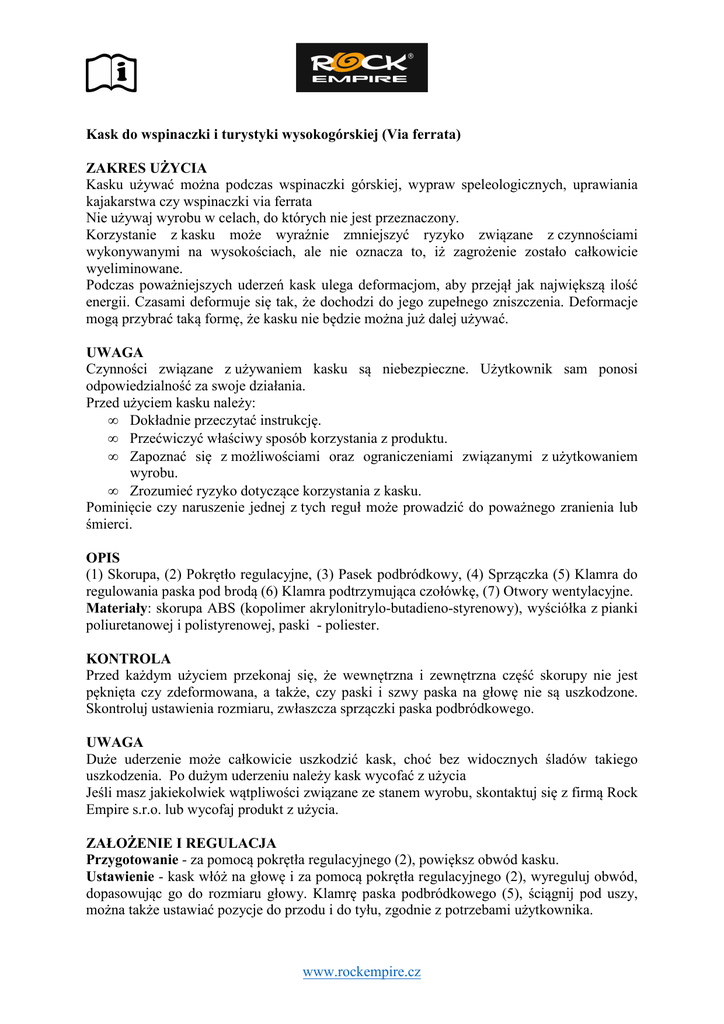 Kask do wspinaczki i turystyki wysokogórskiej (Via ferrata) ZAKRES UŻYCIA Kasku używać można podczas wspinaczki górskiej, wypraw speleologicznych, uprawiania kajakarstwa czy wspinaczki via ferrata Nie używaj wyrobu w celach, do których nie jest przeznaczony. Korzystanie z kasku może wyraźnie zmniejszyć ryzyko związane z czynnościami wykonywanymi na wysokościach, ale nie oznacza to, iż zagrożenie zostało całkowicie wyeliminowane. Podczas poważniejszych uderzeń kask ulega deformacjom, aby przejął jak największą ilość energii. Czasami deformuje się tak, że dochodzi do jego zupełnego zniszczenia. Deformacje mogą przybrać taką formę, że kasku nie będzie można już dalej używać. UWAGA Czynności związane z używaniem kasku są niebezpieczne. Użytkownik sam ponosi odpowiedzialność za swoje działania. Przed użyciem kasku należy: • Dokładnie przeczytać instrukcję. • Przećwiczyć właściwy sposób korzystania z produktu. • Zapoznać się z możliwościami oraz ograniczeniami związanymi z użytkowaniem wyrobu. • Zrozumieć ryzyko dotyczące korzystania z kasku. Pominięcie czy naruszenie jednej z tych reguł może prowadzić do poważnego zranienia lub śmierci. OPIS (1) Skorupa, (2) Pokrętło regulacyjne, (3) Pasek podbródkowy, (4) Sprzączka (5) Klamra do regulowania paska pod brodą (6) Klamra podtrzymująca czołówkę, (7) Otwory wentylacyjne. Materiały: skorupa ABS (kopolimer akrylonitrylo-butadieno-styrenowy), wyściółka z pianki poliuretanowej i polistyrenowej, paski - poliester. KONTROLA Przed każdym użyciem przekonaj się, że wewnętrzna i zewnętrzna część skorupy nie jest pęknięta czy zdeformowana, a także, czy paski i szwy paska na głowę nie są uszkodzone. Skontroluj ustawienia rozmiaru, zwłaszcza sprzączki paska podbródkowego. UWAGA Duże uderzenie może całkowicie uszkodzić kask, choć bez widocznych śladów takiego uszkodzenia. Po dużym uderzeniu należy kask wycofać z użycia Jeśli masz jakiekolwiek wątpliwości związane ze stanem wyrobu, skontaktuj się z firmą Rock Empire s.r.o. lub wycofaj produkt z użycia. ZAŁOŻENIE I REGULACJA Przygotowanie - za pomocą pokrętła regulacyjnego (2), powiększ obwód kasku. Ustawienie - kask włóż na głowę i za pomocą pokrętła regulacyjnego (2), wyreguluj obwód, dopasowując go do rozmiaru głowy. Klamrę paska podbródkowego (5), ściągnij pod uszy, można także ustawiać pozycje do przodu i do tyłu, zgodnie z potrzebami użytkownika. www.rockempire.cz Zapięcie - dwie części sprzączki (4), wsuń w siebie, aby doszło do zaskoczenia haczyków. Pasek podbródowy dociągnij mocno, ale tak, aby było to wygodne. Właściwe dociągnięcie zapewnia, że nie dochodzi do zsuwania się kasku z głowy. Pasek podbródkowy rozepniesz przez obustronne naciśnięcie sprzączki (4). Kontrola - właściwe zapięcie sprzączki (4) zawsze sprawdzisz, pociagając za paski. Podczas użytkowania pamiętaj, aby kask był dobrze założony, ponieważ tylko dzięki temu może zapewnić Ci maksymalną ochronę. TRANSPORT, PRZECHOWYWANIE I KONSERWACJA Kask należy zapakować tak, aby nie oddziaływało na niego ciśnienie; niebezpieczne są również ostre krawędzie. Kask przechowuj poza zasięgiem promieniowania UV, wilgoci, substancji chemicznych, rozpuszczalników itp. Na kask nie mogą oddziaływać zbyt wysokie temperatury, np. w samochodzie. Kolory, naklejki i inne podobne rzeczy mogą niekorzystnie wpływać na działanie ochronne kasku. Modyfikacje- należy wystrzegać się jakichkolwiek modyfikacji konstrukcyjnych kasku oraz instalowania różnych dodatków itp. Jedyny wyjątek stanowi zainstalowanie latarki czołowej za pomocą klamer (6). Czyszczenie - kask można myć letnią wodą i zwykłym mydłem, nigdy nie należy stosować rozpuszczalnika bądź innych substancji chemicznych. Kasku nie wolno prać ani suszyć w urządzeniach automatycznych. Kask dostarczany jest w worku polietylenowym i papierowym kartoniku. OGÓLNE INFORMACJE Żywotność produktu i przeglądy Wyroby z tworzyw sztucznych mają żywotność 10 + 5 lat (5 lat przechowywania zgodnie z instrukcją obsługi, 10 lat od pierwszego użycia). Jeśli uprawniona osoba stwierdzi, że wyrób nie nadaje się już do bezpiecznego użytkowania, ma prawo zalecić wycofanie go z użycia, nawet przed upłynięciem okresu żywotności. Produkty z plastiku muszą być kontrolowane co najmniej raz na 12 miesięcy przez producenta lub osobę uprawnioną do kontroli ŚOI kategorii III – proste konstrukcje (dalej osoba uprawniona), np. IRATA i SPRAT Level 3 itd. Kontrole te powinny być przeprowadzane również w wyjątkowych sytaucjach (odpadnięcie, działanie agresywnych substancji chemicznych, uszkodzenia mechaniczne lub wątpliwości samego użytkownika). Jeśli tylko stan kasku zaczyna budzić wątpliwości, należy przestać go używać i przekazać do utylizacji. Starzenie się produktu - jest wiele powodów, aby określić wyrób jako przestarzały. Jako przykład służyć mogą zmiany norm i przepisów, rozwój nwych technologii, niekompatybilność z pozostałymi częściami sprzętu itp. GWARANCJA 3-letnia gwarancja obejmuje wady fabryczne i wady materiału Gwarancja nie obejmuje jednak wad powstałych w wyniku zwykłego użytkowania, utleniania, modyfikacji i samodzielnego udoskonalania produktu, niewłaściwej konserwacji i nieodpowiedniego przechowywania, uszkodzeń podczas wypadków czy zaniedbań, a także w efekcie takiego użycia, do którego wyrób nie jest przeznaczony. www.rockempire.cz Producent nie odpowiada za bezpośrednie, pośrednie i przypadkowe skutki użytkowania wyrobu, a także za szkody powstałe podczas korzystania z tego produktu. www.rockempire.cz