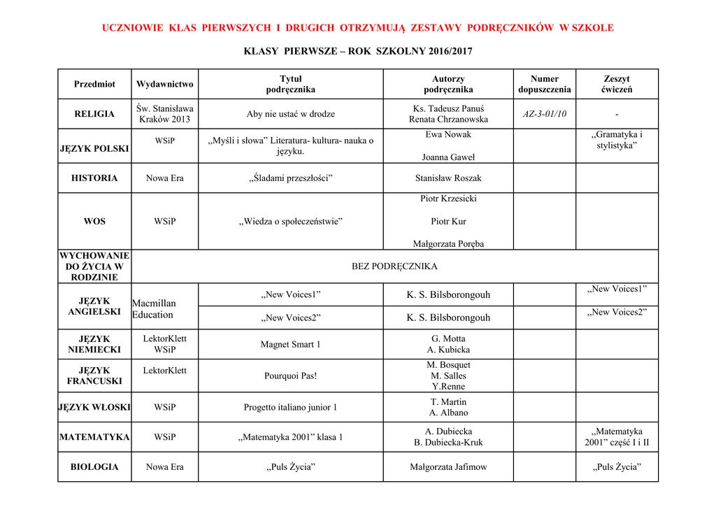 UCZNIOWIE KLAS PIERWSZYCH I DRUGICH OTRZYMUJĄ ZESTAWY PODRĘCZNIKÓW W SZKOLE KLASY PIERWSZE – ROK SZKOLNY 2016/2017 Przedmiot Wydawnictwo Tytuł podręcznika Autorzy podręcznika Numer dopuszczenia Zeszyt ćwiczeń RELIGIA Św. Stanisława Kraków 2013 Aby nie ustać w drodze Ks. Tadeusz Panuś Renata Chrzanowska AZ-3-01/10 - WSiP ,,Myśli i słowa” Literatura- kultura- nauka o języku. JĘZYK POLSKI HISTORIA Nowa Era ,,Śladami przeszłości” Ewa Nowak ,,Gramatyka i stylistyka” Joanna Gaweł Stanisław Roszak Piotr Krzesicki WOS WSiP ,,Wiedza o społeczeństwie” Piotr Kur Małgorzata Poręba WYCHOWANIE DO ŻYCIA W RODZINIE JĘZYK ANGIELSKI BEZ PODRĘCZNIKA Macmillan Education ,,New Voices1” K. S. Bilsborongouh ,,New Voices2” K. S. Bilsborongouh Magnet Smart 1 G. Motta A. Kubicka Pourquoi Pas! M. Bosquet M. Salles Y.Renne ,,New Voices1” ,,New Voices2” JĘZYK NIEMIECKI LektorKlett WSiP JĘZYK FRANCUSKI LektorKlett JĘZYK WŁOSKI WSiP Progetto italiano junior 1 T. Martin A. Albano MATEMATYKA WSiP ,,Matematyka 2001” klasa 1 A. Dubiecka B. Dubiecka-Kruk ,,Matematyka 2001” część I i II BIOLOGIA Nowa Era ,,Puls Życia” Małgorzata Jafimow „Puls Życia” Jan Kulawik CHEMIA Nowa Era ,,Chemia Nowej Ery” Teresa Kulawik Maria Litwin Dawid Szczypiński GEOGRAFIA Nowa Era ,,Planeta Nowa” Mirosław Wójtowicz WSiP FIZYKA ,,Świat Fizyki” Barbara Sagnowska Zamkor INFORMATYKA Nowa Era Informatyka w ćwiczeniach B. Kwaśny A. Symczak ZAJĘCIA TECHNICZNE Operon „Zajęcia techniczne” Urszula Białka ZAJĘCIA ARTYSTYCZNE ,,Planeta Nowa” Bez podręcznika cz.1 i cz.2 ,,Świat Fizyki” część A i B KLASY DRUGIE – ROK SZKOLNY 2016/2017 Przedmiot Wydawnictwo Tytuł podręcznika RELIGIA Św. Stanisława Kraków 2013 Aby nie ustać w drodze WSiP ,,Myśli i słowa” Literatura- kultura- nauka o języku JĘZYK POLSKI Autorzy podręcznika Ks. Tadeusz Panuś Renata Chrzanowska M. Lewicka Ewa Nowak Nowa Era ,,Śladami przeszłości” Stanisław Roszak WOS WSiP ,,Wiedza o społeczeństwie” (kontynuacja podręcznika z klasy 1) E. Dobrzycka JĘZYK ANGIELSKI Zeszyt Ćwiczeń AZ-3-01/10 ,,Gramatyka i stylistyka” Joanna Gaweł HISTORIA WYCHOWANIE DO ŻYCIA W RODZINIE Numer dopuszczenia BEZ PODRĘCZNIKA Macmillan Education ,,New Voices3” K. S. Bilsborogouh ,,New Voices2” K. S. Bilsborough JĘZYK NIEMIECKI LektorKlett WSiP Magnet Smart 1 G. Motta A. Kubicka JĘZYK FRANCUSKI LektorKlett Pourquoi pas! M. Bosquet M. Salles Y.Renne Progetto italiano junior 2 T. Martin A. Albano JĘZYK WŁOSKI Nowela WSiP ,,New Voices3” ,,New Voices2” MATEMATYKA WSiP ,,Matematyka 2001” klasa 2 A. Dubiecka B. Dubiecka-Kruk ,,Matematyka 2001” część I i II BIOLOGIA Nowa Era ,,Puls Życia” Małgorzata Jafimow „Puls Życia” CHEMIA Nowa Era ,,Chemia Nowej Ery” Jan Kulawik Teresa Kulawik, Maria Litwin Dawid Szczypiński GEOGRAFIA Nowa Era ,,Planeta Nowa” Mirosław Wójtowicz WSiP FIZYKA ,,Świat Fizyki” Barbara Sagnowska „Zajęcia techniczne” Urszula Białka Zamkor ZAJĘCIA TECHNICZNE ZAJĘCIA ARTYSTYCZNE Operon Bez podręcznika ,,Planeta Nowa” cz.1 i cz.2 ,,Świat Fizyki” część A i B KLASY TRZECIE– ROK SZKOLNY 2016/2017 Przedmiot Wydawnictwo Tytuł podręcznika Autorzy podręcznika Numer dopuszczenia Zeszyt ćwiczeń RELIGIA Św. Stanisława Kraków 2013 W miłości Boga Ks. Tadeusz Panuś Renata Chrzanowska, M. Lewicka AZ-3-01/10 - JĘZYK POLSKI Nowa Era „Słowa na czasie”. Podręcznik do kształcenia literackiego i kulturowego. Małgorzata Chmiel 95/3/2009 Piotr Doroszewski Podręcznik do kształcenia językowego z ćwiczeniami. „ Śladami przeszłości” HISTORIA Nowa Era Wilga Herman 95/4/2009 Stanisław Roszak 60/2/2010 Podręcznik dla klas III gimnazjum WOS Operon JĘZYK ANGIELSKI PEARSON Podręcznik podaje nauczyciel na zajęciach PEARSON Macmillan PEARSON JĘZYK NIEMIECKI Lektorklett „Wiedza o społeczeństwie” podręcznik dla gimnazjum kl.2 GRUPA Podręcznik podaje nauczyciel na zajęciach Podręcznik podaje nauczyciel na zajęciach Podręcznik podaje nauczyciel na zajęciach Podręcznik podaje nauczyciel na zajęciach Elżbieta Dobrzycka Krzysztof Makara 96/2/2010 - Repetytorium gimnazjalne z j. angielskiego. Poziom podstawowy i rozszerzony + Testy gimnazjalne. R. Fricker, J. Gaszewski, T. Siuta, M. Umińska 353/2011 - Repetytorium gimnazjalne z j. angielskiego. Poziom podstawowy i rozszerzony. R. Fricker, J. Gaszewski, T. Siuta, M. Umińska 353/2011 - 313/3/2012 Workbook R. Fricker, J. Gaszewski, T. Siuta, M. Umińska 353/2011 - Georgio Motta 98/2/2010 VOICES 3 Repetytorium gimnazjalne z j. angielskiego. Poziom podstawowy i rozszerzony+ Testy gimnazjalne. (podręczniki na 2 lata nauki) Magnet II Catherine McBeth, Katherine & Steve Bilsborough JĘZYK FRANCUSKI Siedmiogród JĘZYK WŁOSKI Edilingua „Et toi” 2 Jean – Thierry Le Bougnec Marie – Jose Lopes 197/3/2009 Zeszyt ćwiczeń „Et toi” Progetto italiano junior Marin T. 319/1/2011 - 39/2/2009 Zeszyt ćwiczeń 1 i 2 Anna Dubiecka Matematyka 2001 MATEMATYKA WSiP Piotr Piskorski Klasa 3 Wacław Zawadowski BIOLOGIA Podręcznik do biologii w gimnazjum kl. 3 Małgorzata Jefimow „Puls życia” Marian Sęktas Nowa Era 58/2/2009 Jan Kulawik Zeszyt ćwiczeń do biologii „Puls życia” 49/2/2009 Podręcznik CHEMIA Nowa Era Teresa Kulawik - „Chemia Nowej Ery” kl. 3 GEOGRAFIA FIZYKA Nowa Era Zamkor Podręcznik do geografii dla klasy trzeciej gimnazjum „Planeta Nowa” 3 „Świat fizyki” – podręcznik dla uczniów gimnazjum cz.3 Maria Litwin Dawid Szczypiński 7/2/2009 Zeszyt ćwiczeń do geografii Pod redakcją Barbary Sagnowskiej 11/2/2009 - Jolanta Pańczyk 162/2009 - Agnieszka Kreiner- Bogdańska 6/2009 - Mieczysław Borowiecki Edward Rygała Zbigniew Pytasz 193/2009 - Mirosław Wójtowicz INFORMATYKA Konieczność zakupu podręcznika określa nauczyciel na zajęciach Informatyka Europejczyka Helion Podręcznik z klasy I ZAJĘCIA ARTYSTYCZNE Oficyna EdukacyjnaPazdro Krz