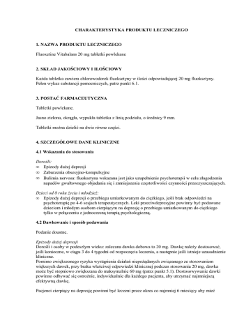 CHARAKTERYSTYKA PRODUKTU LECZNICZEGO 1. NAZWA PRODUKTU LECZNICZEGO Fluoxetine Vitabalans 20 mg tabletki powlekane 2. SKŁAD JAKOŚCIOWY I ILOŚCIOWY Każda tabletka zawiera chlorowodorek fluoksetyny w ilości odpowiadającej 20 mg fluoksetyny. Pełen wykaz substancji pomocniczych, patrz punkt 6.1. 3. POSTAĆ FARMACEUTYCZNA Tabletki powlekane. Jasno zielona, okrągła, wypukła tabletka z linią podziału, o średnicy 9 mm. Tabletki można dzielić na dwie równe części. 4. SZCZEGÓŁOWE DANE KLINICZNE 4.1 Wskazania do stosowania Dorośli: • Epizody dużej depresji • Zaburzenia obsesyjno-kompulsyjne • Bulimia nervosa: fluoksetyna wskazana jest jako uzupełnienie psychoterapii w celu złagodzenia napadów gwałtownego objadania się i zmniejszenia częstotliwości czynności przeczyszczających. Dzieci od 8 roku życia i młodzież: • Epizody dużej depresji o przebiegu umiarkowanym do ciężkiego, jeśli brak odpowiedzi na psychoterapię po 4-6 sesjach terapeutycznych. Leki przeciwdepresyjne powinny być podawane dzieciom i młodym osobom cierpiącym na depresję o przebiegu umiarkowanym do ciężkiego tylko w połączeniu z jednoczesną terapią psychologiczną. 4.2 Dawkowanie i sposób podawania Podanie doustne. Epizody dużej depresji Dorośli i osoby w podeszłym wieku: zalecana dawka dobowa to 20 mg. Dawkę należy dostosować, jeśli konieczne, w ciągu 3 do 4 tygodni od rozpoczęcia leczenia, a następnie jeśli istnieje uzasadnienie kliniczne. Pomimo zwiększonego ryzyka wystąpienia działań niepożądanych związanego ze stosowaniem większych dawek, przy braku właściwej odpowiedzi klinicznej podczas stosowania 20 mg, dawka może być stopniowo zwiększana do maksymalnie 60 mg (patrz punkt 5.1). Dostosowywanie dawki powinno odbywać się ostrożnie, indywidualnie dla każdego pacjenta, aby utrzymać najmniejszą efektywną dawkę. Pacjenci cierpiący na depresję powinni być leczeni przez okres co najmniej 6 miesięcy aby mieć pewność, że są oni wolni od objawów. Zaburzenia obsesyjno-kompulsyjne Dorośli i osoby w podeszłym wieku: zalecana dawka dobowa to 20 mg. Pomimo zwiększonego ryzyka wystąpienia działań niepożądanych związanego ze stosowaniem wyższych dawek, jeśli po 2 tygodniach odpowiedź terapeutyczna na leczenie 20 mg będzie niewystarczająca, dawka może być zwiększana stopniowo do maksymalnie 60 mg. Jeśli po 10 tygodniach leczenia nie obserwuje się poprawy, należy ponownie rozważyć leczenie fluoksetyną. W przypadku uzyskania korzystnej odpowiedzi terapeutycznej, leczenie można kontynuować w dawce dostosowanej do indywidualnych potrzeb pacjenta. Pomimo, że brak jest systematycznych badań, które odpowiedzą na pytanie dotyczące długości terapii fluoksetyną, to ze względu na przewlekły charakter zaburzeń obsesyjno-kompulsyjnych wydaje się uzasadniona kontynuacja leczenia przez 10 tygodni u pacjentów reagujących na leczenie. Zmiany dawkowania należy przeprowadzać ostrożnie i indywidualnie dla każdego pacjenta, aby utrzymać najmniejszą skuteczną dawkę. Należy okresowo oceniać konieczność dalszego leczenia. Niektórzy lekarze zalecają równoczesne korzystanie z psychoterapii behawioralnej u pacjentów, którzy dobrze reagują na leczenie farmakologiczne. Nie dowiedziono długotrwałej (powyżej 24 tygodni) skuteczności leczenia zaburzeń obsesyjnokompulsyjnych. Bulimia nervosa Dorośli i osoby w podeszłym wieku: zalecana dobowa dawka to 60 mg. Nie wykazano długotrwałej (powyżej 3 miesięcy) skuteczności w bulimii. Wszystkie wskazania Dorośli: zalecana dawka może być zmniejszana i zwiększana. Dawki powyżej 80 mg nie były systematycznie ocenianie. Fluoksetyna może być podawana w dawce pojedynczej lub podzielonej, podczas lub między posiłkami. Po zaprzestaniu stosowania leku, substancja czynna pozostaje w organizmie przez kilka tygodni. Należy wziąć to pod uwagę w przypadku rozpoczynania lub przerywania leczenia. Dzieci od 8 roku życia i młodzież (epizody dużej depresji o przebiegu umiarkowanym do ciężkiego) Leczenie należy rozpocząć oraz kontynuować je pod specjalistycznym nadzorem. Dawka początkowa to 10 mg na dobę. Dostosowanie dawki powinno następować ostrożnie, na podstawie indywidualnej odpowiedzi pacjenta na leczenie, aby utrzymać najniższą skuteczną dawkę. Po 1 do 2 tygodni, dawkę można zwiększyć do 20 mg na dobę. Doświadczenie z badań klinicznych dotyczące stosowania dawek wyższych niż 20 mg na dobę jest minimalne. Istnieją ograniczone dane dotyczące stosowania leku przez 9 tygodni. Dzieci o małej masie ciała Ze względu na większe stężenie osocza u dzieci z małą masą ciała, działanie terapeutyczne można osiągnąć stosując mniejsze dawki (patrz punkt 5.2). Dla pacjentów pediatrycznych, u których wystąpiła odpowiedź terapeutyczna, należy rozważyć konieczność kontynuowania leczenia po 6 miesiącach stosowania. Jeśli przez 9 tygodni stosowania nie osiągnięto korzyści klinicznej, należy ponownie rozważyć konieczność leczenia. Osoby w podeszłym wieku Należy zachować ostrożność podczas zwiększania dawki, a dawka dobowa nie powinna być większa niż 40 mg. Maksymalna zalecana dawka to 60 mg na dobę. U pacjentów z niewydolnością wątroby (patrz punkt 5.2) lub pacjentów przyjmujących jednocześnie leki mogące wchodzić w interakcje z fluoksetyną (patrz punkt 4.5), należy rozważyć stosowanie mniejszej dawki lub mniejszą częstotliwość stosowania (np. 20 mg co drugi dzień). Objawy odstawienne obserwowane po przerwaniu stosowania fluoksetyny Należy unikać nagłego odstawienia leku. Aby zakończyć leczenie fluoksetyną należy stopniowo zmniejszać dawkę przez okres co najmniej 1 do 2 tygodni aby zmniejszyć ryzyko wystąpienia objawów odstawiennych (patrz punkt 4.4 i 4.8). W przypadku wystąpienia objawów nietolerowanych przez pacjenta, będących następstwem zmniejszenia dawki lub odstawienia leku n