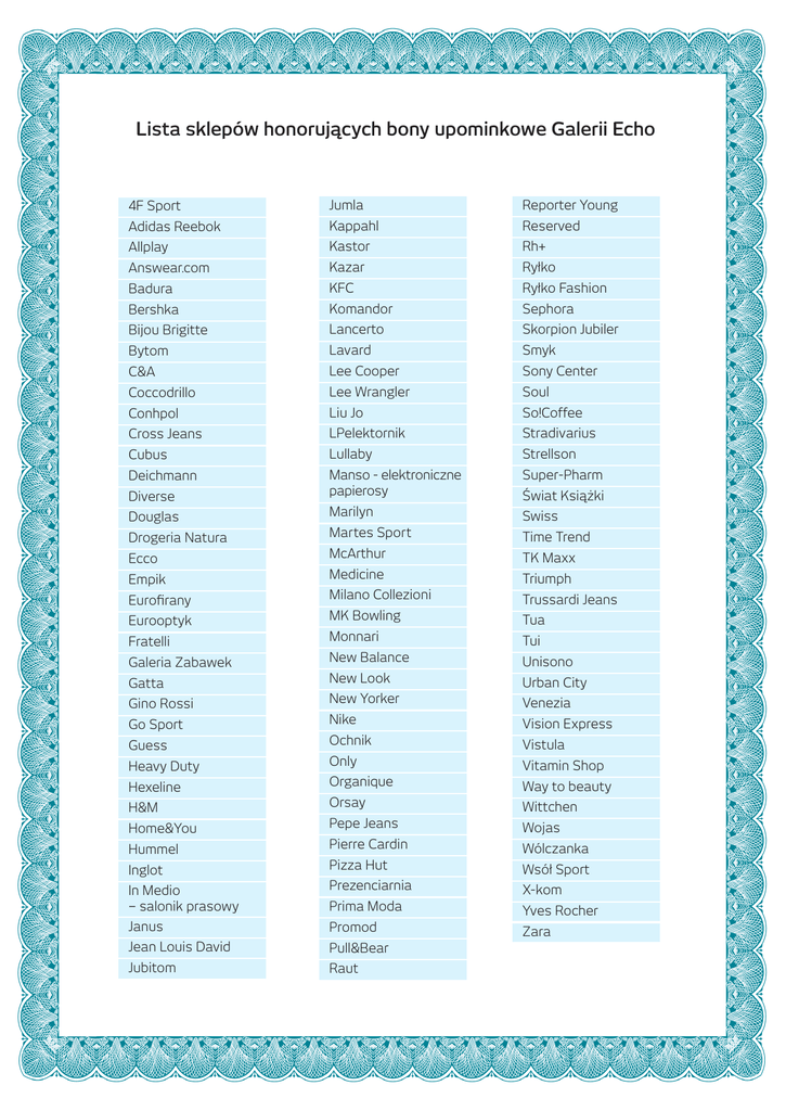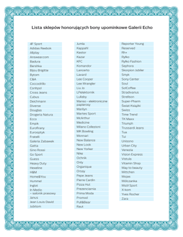 Lista sklepów honorujących bony upominkowe Galerii Echo 4F Sport Jumla Reporter Young Adidas Reebok Kappahl Reserved Allplay Kastor Rh+ Answear.com Kazar Ryłko Badura KFC Ryłko Fashion Bershka Komandor Sephora Bijou Brigitte Lancerto Skorpion Jubiler Bytom Lavard Smyk C&A Lee Cooper Sony Center Coccodrillo Lee Wrangler Soul Conhpol Liu Jo So!Coffee Cross Jeans LPelektornik Stradivarius Cubus Lullaby Strellson Deichmann Super-Pharm Diverse Manso - elektroniczne papierosy Douglas Marilyn Swiss Drogeria Natura Martes Sport Time Trend Ecco McArthur TK Maxx Empik Medicine Triumph Eurofirany Milano Collezioni Trussardi Jeans Eurooptyk MK Bowling Tua Fratelli Monnari Tui Galeria Zabawek New Balance Unisono Gatta New Look Urban City Gino Rossi New Yorker Venezia Go Sport Nike Vision Express Guess Ochnik Vistula Heavy Duty Only Vitamin Shop Hexeline Organique Way to beauty H&M Orsay Wittchen Home&You Pepe Jeans Wojas Hummel Pierre Cardin Wólczanka Inglot Pizza Hut Wsół Sport In Medio – salonik prasowy Janus Prezenciarnia X-kom Prima Moda Yves Rocher Promod Zara Jean Louis David Pull&Bear Jubitom Raut Świat Książki