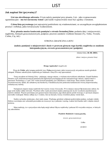 LIST Jak napisać list (prywatny)? List ma określonego adresata. O tym należy pamiętać przy pisaniu. List - jako wypracowanie egzaminacyjne - ma też narzucony temat i jak każde wypracowanie musi być zgodny z tematem. Celem listu prywatnego jest najczęściej podzielenie się wiadomościami, ze szczególnym uwzględnieniem przeżyć i refleksji, jakie towarzyszyły wydarzeniom. Przy pisaniu musisz koniecznie pamiętać o stronie formalnej listu: podaniu daty i miejscowości, nagłówku, formach grzecznościowych, podpisie; pisowni zaimków wielkimi literami (Ty, Tobie, Twoich, Ciebie, Cię, itd.) STRONA GRAFICZNA LISTU (należy pamiętać o miejscowości i dacie w prawym górnym rogu kartki; nagłówku ze znakiem interpunkcyjnym, zwrocie grzecznościowym i podpisie) Jelenia Góra, 28. 08. 2003r. (data i miejsce pisania listu) Droga Agnieszko! (nagłówek) Piszę do Ciebie, gdyż pragnę podzielić się z Tobą przeżyciami, jakie towarzyszyły mi podczas moich górskich eskapad. Właśnie zakończyłem wędrówkę po Sudetach i chcę Ci o niej opowiedzieć. Trasę zacząłem od Jeleniej Góry - pięknego, starego miasta, z wieloma niezwykłymi zabytkami. Zespół Siedmiu Domów czyli zrekonstruowanych kamieniczek kupieckich przylegających do renesansowego ratusza, zapiera dech w piersiach. Pochodzący z 2 poł. XIV wieku kościół parafialny jest zabytkiem w skali kraju. Stare miasto zachowało trzynastowieczny układ, ale zabudowę ma barokową. Charakterystyczne podcienia kamieniczek tworzą niepowtarzalny, romantyczny nastrój. Następnym etapem mojej wędrówki był wąwóz zwany Uroczysko. W to miejsce muszę Cię koniecznie zabrać, bo jego urok trudno oddać słowami. Wyobraź sobie wąski przesmyk między piętrzącymi się do wysokości pięćdziesięciu metrów skałami. Wąwóz porośnięty jest gęstym lasem mieszanym, jego dnem płynie potok tworzący w pewnym miejscu niewielki wodospad. Słońce odbija się w wodzie, lśni na liściach, tworzy świetliste plamy wśród skał... Sudety są bardzo atrakcyjne, choć mało znane. Wędrując górskimi szlakami podziwiałem piękne, rozległe widoki. Dobrze rozwinięta sieć schronisk pozwalała nie troszczyć się o jedzenie i nocleg. Ludzie byli bardzo mili i chętnie służyli pomocą. Mam nadzieję, że w przyszłym roku będę mógł zabrać Cię na wędrówkę i pokazać Ci wszystkie miejsca, w których się zakochałem. Pozdrów Rodziców i naszą paczkę. (zwrot grzecznościowy) Lidka (podpis)