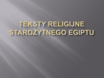 Dominowała religia bóstw lokalnych, których uważano za władców i panów miast i okolic, w których ich czczono. Re Bóg Słońca, stwórca świata i pan ładu we Wszechświecie. Czczony w starożytnym Egipcie, przedstawiany z dyskiem słonecznym i z głową sokoła. Uważany był przez Egipcjan za najważniejszego z bogów i władcę ludzi. Jego dzieci to: Horus zw. Starszym, Anubis, Maat , Bastet (żona albo siostra), Hathor, Sachmet , Thot , Szu , Tefnut Ozyrys W mitologii egipskiej bóg śmierci i odrodzonego życia, Wielki Sędzia zmarłych. Syn bogini Nut i boga Geba, brat Seta, Izydy i Neftyd. Poślubił Izydę, był władcą ziemi, podziemi i krainy umarłych (Pola Jaru). Miał dwóch synów: Anubisa z Neftydą i Horusa z Izydą. Amun Egipski bóg, sprawca niewidzialnego wiatru, urodzaju, płodności. Był uosobieniem niewidzialnych życiodajnych elementów natury: powietrza i wiatru. Powodował, że plony były obfite, zwierzęta się mnożyły, a kobiety rodziły dzieci. Wraz ze swoją małżonką Mut oraz synem Chonsu – bogiemksiężycem – stanowili w Karnaku tebańską triadę. Anubis W egipskiej mitologii bóg o głowie szakala, ściśle łączony z mumifikacją i życiem pozagrobowym. Syn Ozyrysa i Neftydy. Hathor Egipska bogini nieba , uosobienie Wielkiej Macierzy, a także patronka nekropolii tebańskiej. Z czasem stała się bóstwem miłości, radości, uciech, muzyki i tańca, a także opiekunką kobiet. Przedstawiana jako krowa Prezentację przygotowały: Katarzyna Walczak i Olga Kolanowska