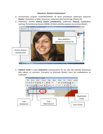 Antyretusz „Dziecko Frankensteina” 1. Uruchamiamy program CorelPHOTOPAINT. W oknie powitalnym wybieramy polecenie Otwórz. Wchodzimy w folder Antyretusz, wybieramy plik Portret3.jpg. Klikamy OK. 2. Wybieramy okienko Zmiana stopnia powiększenia, wybieramy Dopasuj. Duplikujemy warstwę Tło kombinacją klawiszy Ctrl+D. W Oknie obiektów pojawia się warstwa Obiekt1. Okno obiektów – powielamy warstwę Tło Zmiana stopnia powiększenia 3. Pędzlem maski w trybie Dodawanie zamalowujemy tło tak, aby cała sylwetka dziewczyny była zakryta na czerwono. Pracujemy na Warstwie Obiekt1 (musi być podświetlona na niebiesko) Dopełnienie maski Tryb Dodawanie Tryb Odejmowanie Usuń maskę 4. Odwracamy zaznaczenie klikając Dopełnienie maski. Teraz tło będzie zakryte na czerwono, a twarz dziewczyny odsłonięta. Można dokonać kilku poprawek Pędzlem maski zmieniając tryby (Dodawanie/Odejmowanie). Wciskamy kombinacje klawiszy Ctrl+C, Ctrl+V. Pojawia się nowa warstwa z twarzą dziewczyny i przezroczystym tłem. Klikamy na symbol oczek obok miniatur Warstw na dwóch dolnych warstwach – Tło i Obiekt1. Warstwa, którą przed chwilą utworzyliśmy Obiekt2 musi mieć włączone oczko. 5. Jeśli wycięcie twarzy było niedokładne dokonujemy poprawek narzędziem Gumka. 6. Wybieramy polecenie Plik, Otwórz i wybieramy plik Tło. Otworzy się w drugim oknie. Wciskamy Ctrl+C, zamykamy plik Tło powracając do naszego obrazka, wciskamy Ctr+V. Tło wklei się na wierzch obrazka jako Obiekt3 zasłaniając dziewczynę. W oknie obiektów najeżdżamy kursorem na wartwę Obiekt3, przytrzymujemy wciśnięty lewy klawisz myszy i przesuwamy wklejoną warstwę pod Obiekt2. Wskaźnikiem możemy dopasować położenie tła, tak aby pasowało do naszego obrazka. 7. Teraz powinniśmy dopasować kolorystykę twarzy do kolorystyki tła. W tym celu musimy zmniejszyć nasycenie warstwy Obiekt2 (twarzy dziewczyny). Uaktywniamy warstwę Obiekt2 klikając na nią. Następnie wchodzimy w Obrazek, Dopasuj, wybieramy Barwa-nasyceniejasność. 8. W otwartym oknie dialogowym ściągamy suwak Nasycenie w lewo, ustawiając wartość na ok. -70. Zatwierdzamy OK. 9. Teraz zajmiemy się podkrążonymi oczami. Pędzel maski ustawiamy w trybie Odejmowania i malujemy miękką końcówką pędzla duże plamy dookoła oczu dziewczyny. Następnie klikamy Dopełnienie maski. Teraz musimy wtopić krawędzie zaznaczenia. W tym celu wchodzimy w Maska, Kontur maski, Wtapianie. Pojawi się okno dialogowe, wartość Szerokość ustawiamy na ok. 80, resztę pozostawiamy bez zmian. Zatwierdzamy OK. 10. Wybieramy Obrazek, Dopasuj, Barwa-nasycenie-jasność i suwak Jasność ściągamy w lewo do wartości -20. Usuwamy maskę. Następnie całą operację powtarzamy: znowu malujemy Pędzlem maski w trybie Odejmowania plamy dookoła oczu, ale mniejsze niż poprzednio, odwracamy zaznaczenie, wtapiamy i znowu zmniejszamy jasność. Usuwamy maskę. 11. Czas na zęby. Powiększamy obraz do 100%. Pędzlem maski o średnicy 20 i miękkiej końcówce malujemy fragmenty zębów, najlepiej miejsca, gdzie zęby się stykają ze sobą. Odwracamy zaznaczenie. Teraz znowu musimy wtopić krawędzie zaznaczenia. W tym celu wchodzimy w Maska, Kontur maski, Wtapianie. Pojawi się okno dialogowe, wartość Szerokość tym razem ustawiamy na ok. 20, resztę pozostawiamy bez zmian. Zatwierdzamy OK. Wcodzimy w Obrazek, Dopasuj, Barwa-nasycenie-jasność. Ustawiamy wartości Nasycenie 10, Jasność – 20. Usuwamy maskę. Ponownie całą procedurę powtarzamy jak w przypadku oczu. W korekcie Barwa-nasyceniejasność wartość Nasycenia ustawiamy na 0, Jasność na – 20. Usuwamy maskę. 12. Otwieramy plik Tekstura2, wciskamy Ctrl+C, zamykamy plik powracając do naszego obrazka, wciskamy Ctrl+V. W Oknie obiektów pojawia się Obiekt4. Wskaźnikiem dopasowujemy teksturę tak aby całkiem zakryła twarz dziewczyny. W Oknie obiektów wybieramy Tryb scalania na Tekstura, krycie zmniejszamy na 58%. Tryb scalania Krycie warstwy 13. Wybieramy narzędzie Gumka z miękką krawędzią. Stopień Przezroczystości ustawiamy na 85%. Teraz dość dużą końcówką Gumki malujemy po teksturze twarzy tak aby wymodelować miejsca wypukłe: grzbiet nosa, czoło, policzki, podbródek. Przy tak dużej przezroczystości możemy dokonać kilku pociągnięć stopniowo rozjaśniając wybrane obszary. Następnie zmniejszamy Przezroczystość Gumki do 0 i usuwamy te obszary tekstury, które wychodzą poza twarz. 14. Scalamy warstwy. Aby to zrobić klikamy myszką na warstwy Obiekt4 i Obiekt2 w Oknie obiektów z wciśniętym klawiszem Ctrl. Teraz wciskamy ikonkę na dole Okna obiektów Połącz obiekty ze sobą. 15. Otwórz plik Blizna. Teraz będziemy przez chwilę pracować na tym oknie. Duplikujemy Tło za pomocą klawiszy Ctrl+D. Następnie Tło usuwamy, pozostaje tylko Obiekt1. Obrazek jest za duży zatem wybieramy narzędzie Kadrowanie i zakreślamy obszar wokół blizny. Zatwierdzamy Enter. 16. Wybieramy Pędzel maski i selekcjonujemy w trybie Dodawania bliznę tak, aby odkryć tylko szwy i nitki, reszta skóry powinna pozostać zakryta na czerwono. Selekcja powinna zostać przeprowadzona dokładnie, najlepiej na dużym powiększeniu, warto zmieniać rozmiar końcówki Pędzla maski. 17. Wciskamy kombinację klawiszy Ctrl+C, Ctrl+V, w Oknie obiektów pojawia się Obiekt2 – blizna na przezroczystym tle. Usuwamy maskę. Usuwamy Obiekt1 spod spodu. Narzędziem Gumka możemy jeszcze wprowadzić drobne korekty w selekcji blizny. 18. Kopiujemy wyselekcjonowaną bliznę za pomocą Ctrl+C, zamykamy plik Blizna i powracamy do naszego obrazka. Wklejamy bliznę poprzez Ctrl+V. W Oknie obiektów pojawia się Obiekt5. Blizna jest za duża, więc aktywujemy Wskaźnik i klikamy na bliznę. Pojawiają się kwadratowe uchwyty wokół blizny. Chwytamy jeden z narożnych i zmniejszamy bliznę tak, aby dopasować ją nad prawe oko. 19. Aby dopasować jeszcze lepiej bliznę do miejsca klikamy wskaźnik