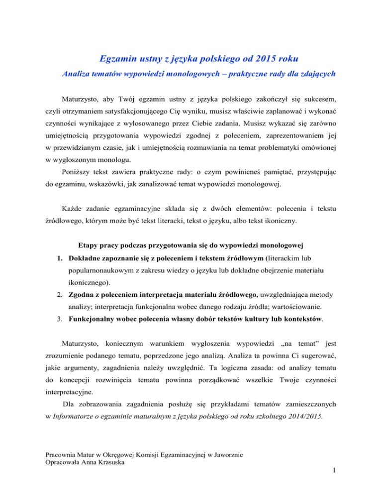 Egzamin ustny z języka polskiego od 2015 roku Analiza tematów wypowiedzi monologowych – praktyczne rady dla zdających Maturzysto, aby Twój egzamin ustny z języka polskiego zakończył się sukcesem, czyli otrzymaniem satysfakcjonującego Cię wyniku, musisz właściwie zaplanować i wykonać czynności wynikające z wylosowanego przez Ciebie zadania. Musisz wykazać się zarówno umiejętnością przygotowania wypowiedzi zgodnej z poleceniem, zaprezentowaniem jej w przewidzianym czasie, jak i umiejętnością rozmawiania na temat problematyki omówionej w wygłoszonym monologu. Poniższy tekst zawiera praktyczne rady: o czym powinieneś pamiętać, przystępując do egzaminu, wskazówki, jak zanalizować temat wypowiedzi monologowej. Każde zadanie egzaminacyjne składa się z dwóch elementów: polecenia i tekstu źródłowego, którym może być tekst literacki, tekst o języku, albo tekst ikoniczny. Etapy pracy podczas przygotowania się do wypowiedzi monologowej 1. Dokładne zapoznanie się z poleceniem i tekstem źródłowym (literackim lub popularnonaukowym z zakresu wiedzy o języku lub dokładne obejrzenie materiału ikonicznego). 2. Zgodna z poleceniem interpretacja materiału źródłowego, uwzględniająca metody analizy; interpretacja funkcjonalna wobec danego rodzaju źródła; wartościowanie. 3. Funkcjonalny wobec polecenia własny dobór tekstów kultury lub kontekstów. Maturzysto, koniecznym warunkiem wygłoszenia wypowiedzi „na temat” jest zrozumienie podanego tematu, poprzedzone jego analizą. Analiza ta powinna Ci sugerować, jakie argumenty, zagadnienia należy uwzględnić. Ta logiczna zasada: od analizy tematu do koncepcji rozwinięcia tematu powinna porządkować wszelkie Twoje czynności interpretacyjne. Dla zobrazowania zagadnienia posłużę się przykładami tematów zamieszczonych w Informatorze o egzaminie maturalnym z języka polskiego od roku szkolnego 2014/2015. Pracownia Matur w Okręgowej Komisji Egzaminacyjnej w Jaworznie Opracowała Anna Krasuska 1 a) Źródło: tekst literacki W jaki sposób w utworach literackich bywają przedstawiani intelektualiści? Omów zagadnienie, odwołując się do załączonej bajki Ignacego Krasickiego oraz do innych utworów literackich. Temat W jaki sposób w utworach literackich bywają przedstawiani intelektualiści? Omów zagadnienie, odwołując się do załączonej bajki Ignacego Krasickiego oraz do innych utworów literackich W jaki sposób w utworach literackich bywają przedstawiani intelektualiści? Omów zagadnienie, odwołując się do załączonej bajki Ignacego Krasickiego oraz do innych utworów literackich W jaki sposób w utworach literackich bywają przedstawiani intelektualiści? Omów zagadnienie, odwołując się do załączonej bajki Ignacego Krasickiego oraz do innych utworów literackich. Elementy tematu poddane analizie Problem badawczy W jaki sposób w utworach literackich bywają przedstawiani intelektualiści? Polecenie dla zdającego Omów zagadnienie. Zakres materiału załączona bajka Ignacego Krasickiego inne utwory literackie (liczba mnoga, czyli co najmniej dwa teksty literackie) b) Źródło: tekst literacki Labirynt – przestrzeń zapraszająca do odkryć czy pułapka bez wyjścia? Rozważ problem, odwołując się do podanego fragmentu opowiadania Brunona Schulza i innego tekstu kultury. Temat Labirynt – przestrzeń zapraszająca do odkryć czy pułapka bez wyjścia? Rozważ problem, odwołując się do podanego fragmentu opowiadania Brunona Schulza i innego tekstu kultury. Labirynt – przestrzeń zapraszająca do odkryć czy pułapka bez wyjścia? Rozważ problem, odwołując się do podanego fragmentu opowiadania Brunona Schulza i innego tekstu kultury. Labirynt – przestrzeń zapraszająca do odkryć czy pułapka bez wyjścia? Rozważ problem, odwołując się do podanego fragmentu opowiadania Brunona Schulza i innego tekstu kultury. Elementy tematu poddane analizie Problem badawczy Labirynt – przestrzeń zapraszająca do odkryć czy pułapka bez wyjścia? Polecenie dla zdającego Rozważ problem. Zakres materiału podany fragment opowiadania Brunona Schulza inny tekst kultury Pracownia Matur w Okręgowej Komisji Egzaminacyjnej w Jaworznie Opracowała Anna Krasuska 2 c) Źródło: tekst popularnonaukowy z zakresu wiedzy o języku W jaki sposób Internet wpływa na formy i sposoby komunikowania się ludzi między sobą? Uzasadnij swoje stanowisko, odwołując się do przytoczonego tekstu Jana Grzeni, do modelu aktu komunikacji językowej i do wybranego tekstu kultury. Temat W jaki sposób Internet wpływa na formy i sposoby komunikowania się ludzi między sobą? Uzasadnij swoje stanowisko, odwołując się do przytoczonego tekstu Jana Grzeni, do modelu aktu komunikacji językowej i do wybranego tekstu kultury. W jaki sposób Internet wpływa na formy i sposoby komunikowania się ludzi między sobą? Uzasadnij swoje stanowisko, odwołując się do przytoczonego tekstu Jana Grzeni, do modelu aktu komunikacji językowej i do wybranego tekstu kultury. W jaki sposób Internet wpływa na formy i sposoby komunikowania się ludzi między sobą? Uzasadnij swoje stanowisko, odwołując się do przytoczonego tekstu Jana Grzeni, do modelu aktu komunikacji językowej i do wybranego tekstu kultury. Elementy tematu poddane analizie Problem badawczy W jaki sposób Internet wpływa na formy i sposoby komunikowania się ludzi między sobą? Polecenie dla zdającego Uzasadnij swoje stanowisko. Zakres materiału przytoczony tekst Jana Grzeni model aktu komunikacji językowej wybrany tekst kultury d) Źródło: tekst popularnonaukowy z zakresu wiedzy o języku Wyjaśnij, odwołując się do podanego fragmentu powieści Andrzeja Sapkowskiego i do innego utworu literackiego, jaką funkcję może pełnić stylizacja w utworze literackim? Temat Wyjaśnij, odwołując się do podanego fragmentu powieści Andrzeja Sapkowskiego i do innego utworu literackiego, jaką funkcję może pełnić