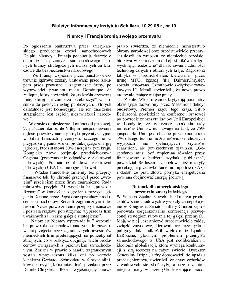 Biuletyn informacyjny Instytutu Schillera, 10.29.05 r., nr 19 Niemcy i Francja bronią swojego przemysłu Po ogłoszeniu bankructwa przez amerykańskiego producenta części samochodowych Delphi, Niemcy i Francja podejmują decyzje o ochronie ich przemysłu samochodowego i innych branży strategicznych uważanych za kluczowe dla bezpieczeństwa narodowego. We Francji wspierane przez państwo elektrownie jądrowe zostały uratowane przed zakupem przez prywatne i zagraniczne firmy, po wypowiedzi premiera rządu Dominique de Villepin, który stwierdził, że „nakreśla czerwoną linię, której nie zamierza przekroczyć” w stosunku do pewnych usług publicznych, „których działalność jest komercyjny, ale ich znaczenie strategiczne jest częścią niezawisłości narodowej”. W czasie comiesięcznej konferencji prasowej, 27 października br. de Villepin niespodziewanie ogłosił powstrzymanie polityki prywatyzacyjnej w kilku branżach przemysłu, szczególnie w przypadku giganta Areva, produkującego energię jądrową, która stanowi 80% energii w tym kraju. Kompleks Areva obejmuje przedsiębiorstwa Cogema (przetwarzanie odpadów z elektrowni jądrowych), Framatome (budowa elektrowni jądrowych) i CEA (technologie jądrowe). Władze francuskie zmieniły też przepisy finansowe tak, by chronić przemysł przed „wrogim” przejęciem przez firmy zagraniczne. Rada ministrów przyjęła 21 września br. „prawo z Brytanii” w kontekście zagrożenia przejęcia giganta Danone przez Pepsi oraz sprzedaży producenta samochodów Renault zagranicznym interesom. Nowe prawo zmienia przepisy finansowe i pozwala rządowi powstrzymać wyprzedaż firm uważanych za „ważne gałęzie strategiczne”. Natomiast Niemcy wprowadziły 7 września br. prawo dające rządowi autorytet do zawetowania przejęcia przez zagranicznych inwestorów niemieckich firm produkujących na potrzeby sił zbrojnych, co w praktyce obejmuje wielu producentów związanych z przemysłem samochodowym. Zmiana w prawie o handlu zagranicznym została wprowadzona kilka dni po wizycie kanclerza Gerharda Schroedera w fabryce silników dislowych, która miała być sprzedana przez DaimlerChrysler. Tekst wyjaśniający nowe prawo stwierdza, że niemieckie ministerstwo obrony narodowej oraz przedstawiciele przemysłu doszli do wniosku, że niemieckie przedsiębiorstwa w sektorze produkcji silników czołgowych są „nieodzowne” dla zachowania zdolności technologicznych i obronnych kraju. Zagrożona fabryka w Friedrichshafen, kierowana przez firmę MTU, będącą filią DaimlerChrysler, została uratowana. Członkowie związków zawodowych IG Metall stwierdzili, że nowe prawo uratowało tysiące miejsc pracy. Z kolei Wlosi otwarcie krytykują parametry określające dozwolony przez Maastricht deficyt budżetowy. Premier rządu tego kraju, Silvo Berlusconi, powiedział na konferencji prasowej po powrocie ze szczytu krajów Unii Europejskiej w Londynie, że w czasie spotkania rady ministrów Unii zwrócił uwagę na fakt, że 75% gospodarki Unii jest obecnie poza parametrem 3%, dlatego też nie można mówić o nielicznych wyjątkach nie spełniających kryteriów Maastricht, ale powszechnym zjawisku. „Gospodarka musi być wspierana również przez finansowane z budżetu wydatki publiczne”, powiedział Berlusconi, zaapelował też o taryfy protekcyjne przeciwko taniemu importowi z Azji i dodał, że prawidłowa polityka energetyczna powinna obejmować energię jądrową. Ratunek dla amerykańskiego przemysłu amerykańskiego W Stanach Zjednoczonych bankructwa producentów samochodowych wywołały zaniepokojenie w Kongresie. Senator Hillary Clinton zaproponowała zorganizowanie konferencji poświęconej strategiom ratowania tej gałęzi przemysłu. Mają w niej uczestniczyć przedstawiciele załóg, związki zawodowe, kierownictwo przemysłu i politycy. Jak podkreślił wielokrotnie Lyndon LaRouche, głównym problemem przemysłu samochodowego w USA jest neoliberalizm i ideologia globalizacji, która wymaga konkurencji z siłą roboczą na całym świecie. Dyrektor Generalny Delphi, który doprowadził do upadku przedsiębiorstwa, stwierdził, że czasy związków zawodowych się skończyły, a razem z nimi miejsca pracy w przemyśle, kosztujące praco- dawców 65 USD na godzinę (w to wliczone pensja, fundusz emerytalny, ubezpieczenie zdrowotne). Jego wzorem są zapewne fabryki Delphi w Chinach, gdzie pracownik kosztuje 3 UDS, ale oczywiście nie dostaje emerytury ani ubezpieczeń. Ogólne załamanie gospodarki amerykańskiej i brak dobrze płatnych miejsc pracy prowadzi w konsekwencji do spadku poziomu życia społeczeństwa. Amerykański departament rolnictwa opublikował w październiku szokujący raport o rosnącej liczbie głodujących Amerykanów. W ciągu ostatnich pięciu lat liczba osób głodujących i cierpiących z powodu „niedostatku żywności” wzrosła o 43% i wynosi ponad 38 milionów, w tym 14 milionów dzieci. Raport został przygotowany przez Centrum ds. Badań Głodu i Ubóstwa na Uniwersytecie Brandeis. Jego dyrektor, dr J.Larry Brown określił rezultaty badań jako „zaskakujące i szokujące”. Zaapelował on do Kongresu i Białego Domu o jak najszybsze rozwiązanie problemu słabej siatki socjalnej i niskich dochodów, będących powodem „epidemii” głodu. Według raportu w latach 2002-2004 ponad 16% gospodarstw domowych w Teksasie ma problemy z zagwarantowaniem odpowiedniego wyżywienia dla członków rodziny, natomiast średnia krajowa wynosi 11,4%. Inne stany, gdzie procent ten przekracza średnią krajową to Kalifornia, Arkansas, Missouri, Północna i Południowa Karolina, Nowy Meksyk i Oklahoma.