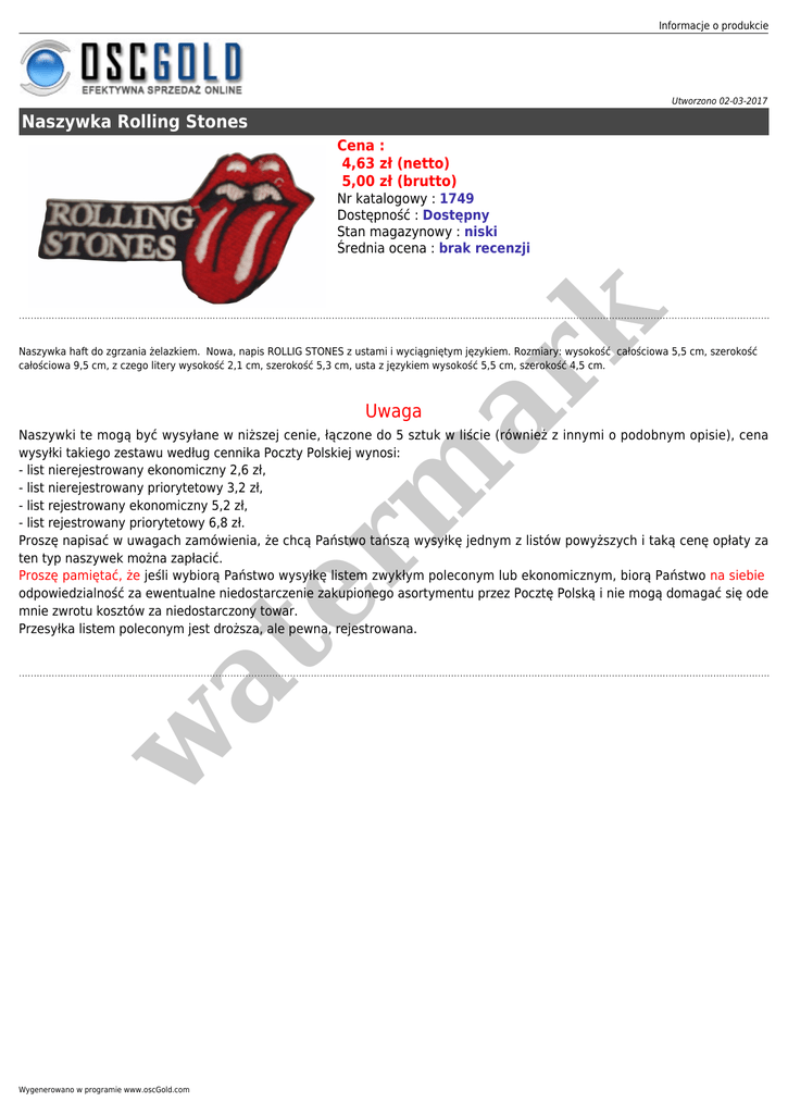 Informacje o produkcie Utworzono 02-03-2017 Naszywka Rolling Stones Cena : 4,63 zł (netto) 5,00 zł (brutto) er m ar k Nr katalogowy : 1749 Dostępność : Dostępny Stan magazynowy : niski Średnia ocena : brak recenzji Naszywka haft do zgrzania żelazkiem. Nowa, napis ROLLIG STONES z ustami i wyciągniętym językiem. Rozmiary: wysokość całościowa 5,5 cm, szerokość całościowa 9,5 cm, z czego litery wysokość 2,1 cm, szerokość 5,3 cm, usta z językiem wysokość 5,5 cm, szerokość 4,5 cm. Uwaga w at Naszywki te mogą być wysyłane w niższej cenie, łączone do 5 sztuk w liście (również z innymi o podobnym opisie), cena wysyłki takiego zestawu według cennika Poczty Polskiej wynosi: - list nierejestrowany ekonomiczny 2,6 zł, - list nierejestrowany priorytetowy 3,2 zł, - list rejestrowany ekonomiczny 5,2 zł, - list rejestrowany priorytetowy 6,8 zł. Proszę napisać w uwagach zamówienia, że chcą Państwo tańszą wysyłkę jednym z listów powyższych i taką cenę opłaty za ten typ naszywek można zapłacić. Proszę pamiętać, że jeśli wybiorą Państwo wysyłkę listem zwykłym poleconym lub ekonomicznym, biorą Państwo na siebie odpowiedzialność za ewentualne niedostarczenie zakupionego asortymentu przez Pocztę Polską i nie mogą domagać się ode mnie zwrotu kosztów za niedostarczony towar. Przesyłka listem poleconym jest droższa, ale pewna, rejestrowana. Wygenerowano w programie www.oscGold.com