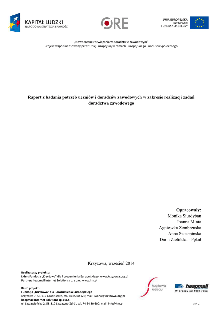 „Nowoczesne rozwiązania w doradztwie zawodowym” Projekt współfinansowany przez Unię Europejską w ramach Europejskiego Funduszu Społecznego Raport z badania potrzeb uczniów i doradców zawodowych w zakresie realizacji zadań doradztwa zawodowego Opracowały: Monika Siurdyban Joanna Minta Agnieszka Zembrzuska Anna Szczepinska Daria Zielińska - Pękał Krzyżowa, wrzesień 2014 Realizatorzy projektu: Lider: Fundacja „Krzyżowa” dla Porozumienia Europejskiego, www.krzyzowa.org.pl Partner: heapmail Internet Solutions sp. z o.o., www.hm.pl Biuro projektu: Fundacja „Krzyżowa” dla Porozumienia Europejskiego Krzyżowa 7, 58-112 Grodziszcze, tel. 74 85 00 123; mail: [email protected] heapmail Internet Solutions sp. z o.o. ul. Szczawieńska 2, 58-310 Szczawno-Zdrój, tel. 74 64 80 600; mail: [email protected] str. 1 „Nowoczesne rozwiązania w doradztwie zawodowym” Projekt współfinansowany przez Unię Europejską w ramach Europejskiego Funduszu Społecznego Spis streści: I. Opis badania: 1. Cel realizacji zadania 2. Uczestnicy badania 3. Opis metod i narzędzi zastosowanych w badaniu II. Wyniki badania potrzeb doradców zawodowych / pracowników szkoły w zakresie doradztwa zawodowego 1. Formy realizacji poradnictwa zawodowe na przykładzie wybranych szkół 2. Metody i narzędzia wykorzystywane przez doradców w ramach poradnictwa zawodowego 3. Czas przeznaczony na realizację poradnictwa zawodowego 4. Stopień zainteresowania uczniów poradnictwem zawodowym 5. Trudności identyfikowane przez doradców podczas realizacji zadań poradnictwa zawodowego 6. Rodzaj wsparcia jakiego oczekują doradcy od ekspertów III. Wyniki badania potrzeb uczniów w zakresie doradztwa zawodowego 1. Potrzeby uczniów ze szkoły gimnazjalnej, ponadgimnazjalnej i szkoły dla dorosłych 1.1.Obszary, w których może pomóc uczniom doradca zawodu 1.2.Tematy rozmów z doradcą zawodu w trakcie indywidualnego spotkania z uczniem 1.3.Tematy grupowych zajęć z doradcą zawodu 2. Potrzeby uczniów ze Specjalnego Ośrodka Szkolno – Wychowawczego (SOSW) IV. Wnioski i rekomendacje V. Załączniki: 1. Ankieta dla realizatorów doradztwa zawodowego w szkołach 2. Ankieta dla uczniów 3. Ankieta dla uczniów ze SOSW Realizatorzy projektu: Lider: Fundacja „Krzyżowa” dla Porozumienia Europejskiego, www.krzyzowa.org.pl Partner: heapmail Internet Solutions sp. z o.o., www.hm.pl Biuro projektu: Fundacja „Krzyżowa” dla Porozumienia Europejskiego Krzyżowa 7, 58-112 Grodziszcze, tel. 74 85 00 123; mail: [email protected] heapmail Internet Solutions sp. z o.o. ul. Szczawieńska 2, 58-310 Szczawno-Zdrój, tel. 74 64 80 600; mail: [email protected] str. 2 „Nowoczesne rozwiązania w doradztwie zawodowym” Projekt współfinansowany przez Unię Europejską w ramach Europejskiego Funduszu Społecznego I. Opis badania: Prezentowany raport jest rezultatem diagnozy początkowej tj. badania rzeczywistych potrzeb uczniów i doradców zawodowych w zakresie doradztwa zawodowego. Badanie, zgodnie z Harmonogramem realizacji projektu: Nowoczesne rozwiązania w doradztwie zawodowym, przeprowadzone zostało we wrześniu 2014 roku przez grupę ekspertów (Monikę Siurdyban, Joannę Mintę, Darię Zielińską – Pękał, Agnieszkę Zembrzuską, Annę Szczepińską) Do września 2014 roku opracowano narzędzia badawcze, instrukcję przeprowadzania badania oraz dokonano wyboru szkół/placówek. 1. Cel realizacji badania uzyskanie informacji pozwalających na skonstruowanie skutecznego, efektywnego oraz odpowiadającego zapotrzebowaniom uczniów i doradców narzędzia diagnostycznego oraz materiałów metodyczno - informacyjnych z zakresu doradztwa zawodowego. 2. Uczestnicy badania Uczestnikami badania byli uczniowie czterech typów szkół oraz doradcy zawodowi zatrudnieni w tym samych szkołach. Wielkość próby badawczej przedstawia się następująco: szkoła gimnazjalna (Gimnazjum nr 1 w Lubinie) – 27 uczniów i 1 doradca zawodowy; szkoła ponadgimnazjalna (Zespół Szkół nr 5 w Wałbrzychu) – 24 uczniów i 1 doradca zawodowy szkoła dla dorosłych (Liceum Ogólnokształcące nr 1 dla dorosłych we Wrocławiu) – 18 uczniów i 1 doradca zawodowy Specjalny Ośrodek Szkolno – Wychowawczy w Dzierżoniowie (15 osób i 2 doradców zawodowych) W sumie w badaniu udział wzięło 84 uczniów i 5 doradców zawodowych / pedagogów. 3. Opis metod i narzędzi zastosowanych w badaniu W diagnozie zastosowano trzy rodzaje kwestionariuszy ankiety. 1. Kwestionariusz ankiety skierowany do doradców zawodowych: składał się z 6 pytań otwartych. Pięć pierwszych pytań dotyczyło aktualnego stanu doradztwa zawodowego w danej szkole (formy realizacji, metody i narzędzia pracy Realizatorzy projektu: Lider: Fundacja „Krzyżowa” dla Porozumienia Europejskiego, www.krzyzowa.org.pl Partner: heapmail Internet Solutions sp. z o.o., www.hm.pl Biuro projektu: Fundacja „Krzyżowa” dla Porozumienia Europejskiego Krzyżowa 7, 58-112 Grodziszcze, tel. 74 85 00 123; mail: [email protected] heapmail Internet Solutions sp. z o.o. ul. Szczawieńska 2, 58-310 Szczawno-Zdrój, tel. 74 64 80 600; mail: [email protected] str. 3 „Nowoczesne rozwiązania w doradztwie zawodowym” Projekt współfinansowany przez Unię Europejską w ramach Europejskiego Funduszu Społecznego doradcy, wymiar czasowy przeznaczony na realizację poradnictwa zawodowego, stopień zainteresowania uczniów oraz ewentualne trudności w realizacji poradnictwa zawodowego identyfikowane przez doradcę). Ostatnie pytanie dotyczyło rodzaju wsparcia jakiego doradca oczekiwałby od ekspertów projektu „Nowoczesne rozwiązania w doradztwie zawodowym”. 2. Kwestionariusz ankiety skierowany do uczniów szkół gimnazjalnych, ponadgimnazjalnych i szkół dla dorosłych: składał się z 3 pytań otwartych. Pierwsze dotyczyło rodzaju pomocy jakiej mógłby doradca zawodu udzielić uczniowi. Drugie odwoływało się do tematów rozmów w ramach indywidualnego spotk