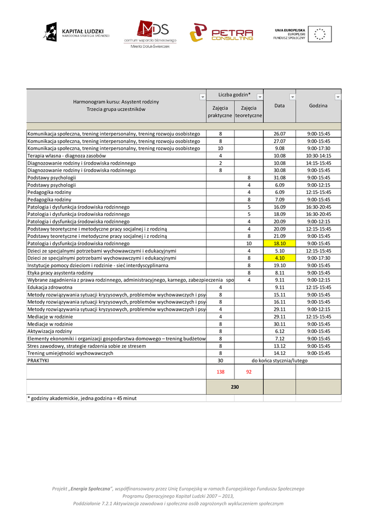 Liczba godzin* Harmonogram kursu: Asystent rodziny Trzecia grupa uczestników Zajęcia Zajęcia praktyczne teoretyczne Data Godzina Komunikacja społeczna, trening interpersonalny, trening rozwoju osobistego 8 26.07 9:00-15:45 Komunikacja społeczna, trening interpersonalny, trening rozwoju osobistego 8 27.07 9:00-15:45 Komunikacja społeczna, trening interpersonalny, trening rozwoju osobistego 10 9.08 9:00-17:30 Terapia własna - diagnoza zasobów 4 10.08 10:30-14:15 Diagnozowanie rodziny i środowiska rodzinnego 2 10.08 14:15-15:45 Diagnozowanie rodziny i środowiska rodzinnego 8 30.08 9:00-15:45 Podstawy psychologii 8 31.08 9:00-15:45 Podstawy psychologii 4 6.09 9:00-12:15 Pedagogika rodziny 4 6.09 12:15-15:45 Pedagogika rodziny 8 7.09 9:00-15:45 Patologia i dysfunkcja środowiska rodzinnego 5 16.09 16:30-20:45 Patologia i dysfunkcja środowiska rodzinnego 5 18.09 16:30-20:45 Patologia i dysfunkcja środowiska rodzinnego 4 20.09 9:00-12:15 Podstawy teoretyczne i metodyczne pracy socjalnej i z rodziną 4 20.09 12:15-15:45 Podstawy teoretyczne i metodyczne pracy socjalnej i z rodziną 8 21.09 9:00-15:45 Patologia i dysfunkcja środowiska rodzinnego 10 18.10 9:00-15:45 Dzieci ze specjalnymi potrzebami wychowawczymi i edukacyjnymi 4 5.10 12:15-15:45 Dzieci ze specjalnymi potrzebami wychowawczymi i edukacyjnymi 8 4.10 9:00-17:30 Instytucje pomocy dzieciom i rodzinie - sieć interdyscyplinarna 8 19.10 9:00-15:45 Etyka pracy asystenta rodziny 8 8.11 9:00-15:45 Wybrane zagadnienia z prawa rodzinnego, administracyjnego, karnego, zabezpieczenia społecznego 4 oraz prawa 9.11 pracy 9:00-12:15 Edukacja zdrowotna 4 9.11 12:15-15:45 Metody rozwiązywania sytuacji kryzysowych, problemów wychowawczych i psychologicznych 8 15.11 9:00-15:45 Metody rozwiązywania sytuacji kryzysowych, problemów wychowawczych i psychologicznych 8 16.11 9:00-15:45 Metody rozwiązywania sytuacji kryzysowych, problemów wychowawczych i psychologicznych 4 29.11 9:00-12:15 Mediacje w rodzinie 4 29.11 12:15-15:45 Mediacje w rodzinie 8 30.11 9:00-15:45 Aktywizacja rodziny 8 6.12 9:00-15:45 Elementy ekonomiki i organizacji gospodarstwa domowego – trening budżetowy 8 7.12 9:00-15:45 Stres zawodowy, strategie radzenia sobie ze stresem 8 13.12 9:00-15:45 Trening umiejętności wychowawczych 8 14.12 9:00-15:45 PRAKTYKI 30 do końca stycznia/lutego 138 92 230 * godziny akademickie, jedna godzina = 45 minut Projekt „Energia Społeczna”, współfinansowany przez Unię Europejską w ramach Europejskiego Funduszu Społecznego Programu Operacyjnego Kapitał Ludzki 2007 – 2013, Poddziałanie 7.2.1 Aktywizacja zawodowa i społeczna osób zagrożonych wykluczeniem społecznym