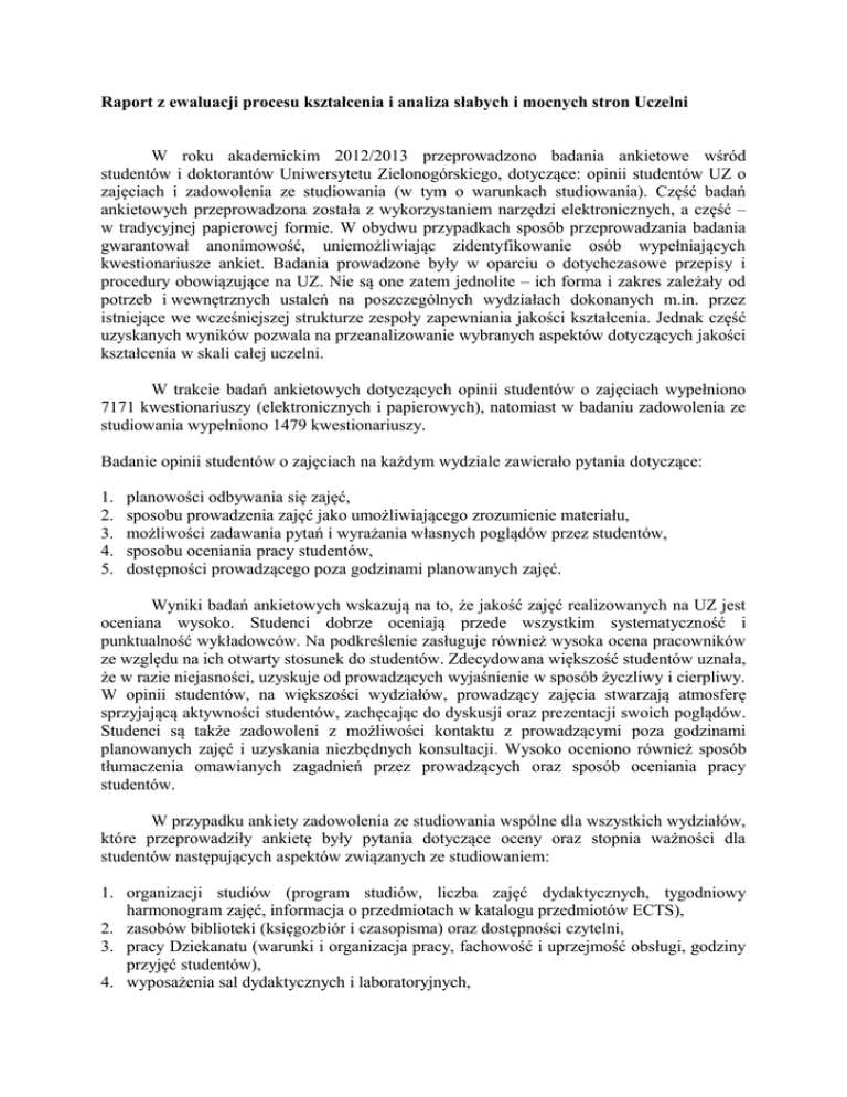 Raport z ewaluacji procesu kształcenia i analiza słabych i mocnych stron Uczelni W roku akademickim 2012/2013 przeprowadzono badania ankietowe wśród studentów i doktorantów Uniwersytetu Zielonogórskiego, dotyczące: opinii studentów UZ o zajęciach i zadowolenia ze studiowania (w tym o warunkach studiowania). Część badań ankietowych przeprowadzona została z wykorzystaniem narzędzi elektronicznych, a część – w tradycyjnej papierowej formie. W obydwu przypadkach sposób przeprowadzania badania gwarantował anonimowość, uniemożliwiając zidentyfikowanie osób wypełniających kwestionariusze ankiet. Badania prowadzone były w oparciu o dotychczasowe przepisy i procedury obowiązujące na UZ. Nie są one zatem jednolite – ich forma i zakres zależały od potrzeb i wewnętrznych ustaleń na poszczególnych wydziałach dokonanych m.in. przez istniejące we wcześniejszej strukturze zespoły zapewniania jakości kształcenia. Jednak część uzyskanych wyników pozwala na przeanalizowanie wybranych aspektów dotyczących jakości kształcenia w skali całej uczelni. W trakcie badań ankietowych dotyczących opinii studentów o zajęciach wypełniono 7171 kwestionariuszy (elektronicznych i papierowych), natomiast w badaniu zadowolenia ze studiowania wypełniono 1479 kwestionariuszy. Badanie opinii studentów o zajęciach na każdym wydziale zawierało pytania dotyczące: 1. 2. 3. 4. 5. planowości odbywania się zajęć, sposobu prowadzenia zajęć jako umożliwiającego zrozumienie materiału, możliwości zadawania pytań i wyrażania własnych poglądów przez studentów, sposobu oceniania pracy studentów, dostępności prowadzącego poza godzinami planowanych zajęć. Wyniki badań ankietowych wskazują na to, że jakość zajęć realizowanych na UZ jest oceniana wysoko. Studenci dobrze oceniają przede wszystkim systematyczność i punktualność wykładowców. Na podkreślenie zasługuje również wysoka ocena pracowników ze względu na ich otwarty stosunek do studentów. Zdecydowana większość studentów uznała, że w razie niejasności, uzyskuje od prowadzących wyjaśnienie w sposób życzliwy i cierpliwy. W opinii studentów, na większości wydziałów, prowadzący zajęcia stwarzają atmosferę sprzyjającą aktywności studentów, zachęcając do dyskusji oraz prezentacji swoich poglądów. Studenci są także zadowoleni z możliwości kontaktu z prowadzącymi poza godzinami planowanych zajęć i uzyskania niezbędnych konsultacji. Wysoko oceniono również sposób tłumaczenia omawianych zagadnień przez prowadzących oraz sposób oceniania pracy studentów. W przypadku ankiety zadowolenia ze studiowania wspólne dla wszystkich wydziałów, które przeprowadziły ankietę były pytania dotyczące oceny oraz stopnia ważności dla studentów następujących aspektów związanych ze studiowaniem: 1. organizacji studiów (program studiów, liczba zajęć dydaktycznych, tygodniowy harmonogram zajęć, informacja o przedmiotach w katalogu przedmiotów ECTS), 2. zasobów biblioteki (księgozbiór i czasopisma) oraz dostępności czytelni, 3. pracy Dziekanatu (warunki i organizacja pracy, fachowość i uprzejmość obsługi, godziny przyjęć studentów), 4. wyposażenia sal dydaktycznych i laboratoryjnych, 5. działalności samorządu studenckiego, 6. działalności biura karier. Na wszystkich wydziałach studenci ocenili pozytywnie program studiów jako całość; jednak wskazali, w niektórych przypadkach, na niedociągnięcia w rozkładzie przedmiotów kształcenia w ciągu studiów oraz tygodniowy plan zajęć. Niepokojącym jest fakt, że studenci często są zdania, że informacja o kursach i zajęciach w Katalogach Przedmiotów ECTS nie jest dla nich ważna. Część z nich deklaruje, że nie zauważyła obecności katalogów przedmiotów na stronie internetowej wydziałów. Praca biblioteki została oceniona przez studentów pozytywnie. Wskazywano jednak na braki nowych pozycji literaturowych oraz niewłaściwą organizację pracy biblioteki, zwłaszcza w kontekście zmiany jej lokalizacji. Część studentów twierdzi, że sprawy dotyczące funkcjonowanie biblioteki nie są dla nich ważne. Na większości wydziałów studenci bardzo dobrze ocenili pracę dziekanatu i sekretariatu (w przypadku wydziałów posiadających w swojej strukturze Instytuty), uznając pracę tych jednostek za bardzo ważną. Niestety, studenci ogólnie słabo oceniają działalność samorządu studenckiego i biura karier, często także nie potrafią określić, czy sprawy te mają dla nich znaczenie. Na wydziałach, gdzie ankieta zawierała pytania dotyczące przydatności lektoratów w opanowaniu języków obcych, występują duże rozbieżności w ocenach studentów (czasem także w ramach różnych kierunków na tym samym wydziale). Podsumowując spośród szczegółowych elementów składających się na jakość kształcenia przewagę ocen pozytywnych uzyskały: zgodność realizowanych zajęć z przedstawionym programem, obowiązkowość prowadzących zajęcia, kultura prowadzących zajęcia, gotowość prowadzących do pomocy, konsultacji. Podjęte na UZ działania, mające na celu zmianę formy przeprowadzania badania wśród studentów od roku 2013/2014, pozwolą na pełną analizę jego wyników na całej uczelni. Wprowadzone jednolite na wszystkich wydziałach ankiety będą służyły: • ocenie przedmiotu/modułu dokonywanej po jego zakończeniu przez studentów i doktorantów (ankieta oceny przedmiotu), • ocenie prowadzących zajęcia dokonywanej przez studentów i doktorantów nie rzadziej niż raz na dwa lata, po zakończeniu zajęć (ankieta oceny prowadzącego zajęcia), • ocenie warunków dotyczących infrastruktury wykorzystywanej w procesie kształcenia, dostępu do zasobów bibliotecznych oraz obsługi administracyjnej studentów i doktorantów (ankieta zadowolenia z warunków studiowania) dokonywanej przez studentów i doktorantów. FUNKCJONOWA