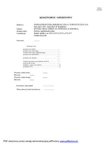Sykal sykal.pl KOSZTORYS OFERTOWY Budowa: Obiekt: Rodzaj robót: Lokalizacja: INFRASTRUKTURA REKREACYJNA I TURYSTYCZNA NA SZLAKU ŚW. JAKUBA W RĄBINIU RYNEK ORAZ TEREN ZA ŚWIETLICĄ WIEJSKĄ Roboty ogólnobudowalne Rąbiń, działki o nr 503/3,472/2,472/1,475,477 Gmina Krzywiń .......... Inwestor: Poziomy cen: poziom . . . . . .cen . . . .robót .............................. poziom . . . . . .cen . . . .robocizny .............................. stawka . . . . . .robocizny . . . . . . . . . kalkulacyjnej ......................... poziom . . . . . .cen . . . .materiałów .............................. poziom . . . . . .cen . . . .sprzętu .............................. narzuty . . . . . . kosztów . . . . . . . . pośrednich . . . . . . . . . . .od . . .R+S ............ zysk . . . .od . . R+S+Ko .................................. dopłata . . . . . . /. opust . . . . . . od . . .całości ........................ podatek . . . . . . .VAT ................................. Wartość robót netto: ........ Słownie: Wartość robót brutto: ........ Słownie: ........ ........ ........ ........ ........ ........ ........ ........ ........ ..... % ..... % ........ ........ Kosztorys sporządził: .................... Data opracowania kosztorysu: .................... PDF stworzony przez wersję demonstracyjną pdfFactory www.pdffactory.pl/ Sykal sykal.pl TABELA ELEMENTÓW SCALONYCH KOSZTORYS OFERTOWY Budowa: Obiekt: Rodzaj robót: Lokalizacja: Inwestor: INFRASTRUKTURA REKREACYJNA I TURYSTYCZNA NA SZLAKU ŚW. JAKUBA W RĄBINIU RYNEK ORAZ TEREN ZA ŚWIETLICĄ WIEJSKĄ Roboty ogólnobudowalne Rąbiń, działki o nr 503/3,472/2,472/1,475,477 Gmina Krzywiń .......... poziom . . . . . .cen . . . .robót .............................. poziom . . . . . .cen . . . .robocizny .............................. stawka . . . . . .robocizny . . . . . . . . . kalkulacyjnej ......................... poziom . . . . . .cen . . . .materiałów .............................. poziom . . . . . .cen . . . .sprzętu .............................. narzuty . . . . . . kosztów . . . . . . . . pośrednich . . . . . . . . . . .od . . R+S ............. zysk . . . .od . . R+S+Ko .................................. dopłata . . . . . . /. opust . . . . . . od . . .całości ........................ podatek . . . . . . .VAT ................................. KOSZTORYS ........ ........ ........ ........ ........ ........ ........ ........ ........ ..... % ..... % Strona 1 07-07-2016 SYKAL-002983 NAZWA DZIAŁ U DZIAŁ I I.1 I.2 I.3 II II.1 II.2 ROBOC MATERIAŁ SPRZĘT K.OGÓLNE ZYSK OGÓŁEM ........ ........ ........ ........ ........ ........ ........ ........ ........ ........ ........ ........ ........ ........ ........ ........ ........ ........ ........ ........ ........ ........ ........ ........ Teren za świetlicą wiejską ........ ........ ........ ........ ........ ........ Siłownia zewnętrzna Wiata rekreacyjna ........ ........ ........ ........ ........ ........ ........ ........ ........ ........ ........ ........ ........ ........ ........ ........ ........ ........ Rynek Chodniki Nasadzenia Mała architektura OGÓŁEM OGÓŁEM NETTO Podatek VAT O G Ó Ł E M Z P O D A T K I E M V A T ........ PDF stworzony przez wersję demonstracyjną pdfFactory www.pdffactory.pl/ ........ ........ ........ Sykal sykal.pl KOSZTORYS OFERTOWY Budowa: Obiekt: Rodzaj robót: Lokalizacja: INFRASTRUKTURA REKREACYJNA I TURYSTYCZNA NA SZLAKU ŚW. JAKUBA W RĄBINIU RYNEK ORAZ TEREN ZA ŚWIETLICĄ WIEJSKĄ Roboty ogólnobudowalne Rąbiń, działki o nr 503/3,472/2,472/1,475,477 Gmina Krzywiń .......... Inwestor: KOSZTORYS Strona 1 07-07-2016 SYKAL-002983 S YMBOL I NAZWA P OZYCJ I KOS ZTORYS OWE J DZ POZ I Rynek I.1 Chodniki I.1 1 KNR 231-04-01-01-00 Rowek pod krawężnik o wym 20x20 cm na gruncie kat 1/2 Nazwa Środka Robotnik budowlany Razem 2 metr Jm r-godz Razem I.1 JEDN MIARY Ilość 0,05992 Cena ......... ILOŚĆ 178,90000 metr R ................ ................ ................ ................ ................ 178,90000 ................ Nazwa Środka Robotnik budowlany Jm r-godz Ilość 0,16672 Cena ......... Wartość ........... Piasek do nawierzchni drogowych Cement portlandzki zwykły 35 Obrzeże trawnikowe 100x20x6 szare Woda przemysłowa Materiały pomocnicze m³ Mg metr m³ %M 0,00376 0,00008 0,81600 0,00032 0,500 ......... ......... ......... ......... ........... ........... ........... ........... ........... R Razem Razem I.1 3 m² ................ ................ ................ ................ ................ 127,12000 ................ Nazwa Środka Robotnik budowlany Jm r-godz Ilość 0,04780 Cena ......... Wartość ........... Piasek do nawierzchni drogowych Woda przemysłowa Materiały pomocnicze m³ m³ %M 0,03700 0,00180 0,500 ......... ......... ........... ........... ........... Walec statyczny samojezdny 6 Mg m-godz 0,00140 ......... ........... R M Razem Razem I.1 4 m² .............. ................ ................ ................ ................ ................ ................ 1271,20000 ................ PDF stworzony przez wersję demonstracyjną pdfFactory www.pdffactory.pl/ .............. ................ S K. Bezpośrednie K. Pośr ..... % Zysk ..... % Pozycja KNR 231-01-05-04-00 Podsypka z piasku zagęszczana mechanicznie - dodatek za 1 cm .............. ................ M K. Bezpośrednie K. Pośr ..... % Zysk ..... % Pozycja KNR 231-01-05-03-00 Podsypka z piasku zagęszczana mechanicznie grub 3 cm ................ WARTOŚĆ Wartość ........... K. Bezpośrednie K. Pośr ..... % Zysk ..... % Pozycja KNR 231-04-07-01-00 Obrzeże betonowe 20x6 cm na podsypce piaskowej z wypełnieniem spoin zaprawą cementową CENA .............. KOSZTORYS Strona 2 07-07-2016 SYKAL-002983 DZ S YMBOL I NAZWA P OZYCJ I KOS ZTORYS OWE J POZ JEDN MIARY ILOŚĆ Nazwa Środka Robotnik budowlany Jm r-godz Ilość 0,00680 Cena ......... Wartość ........... Piasek do nawierzchni drogowych Woda przemysłowa Ma